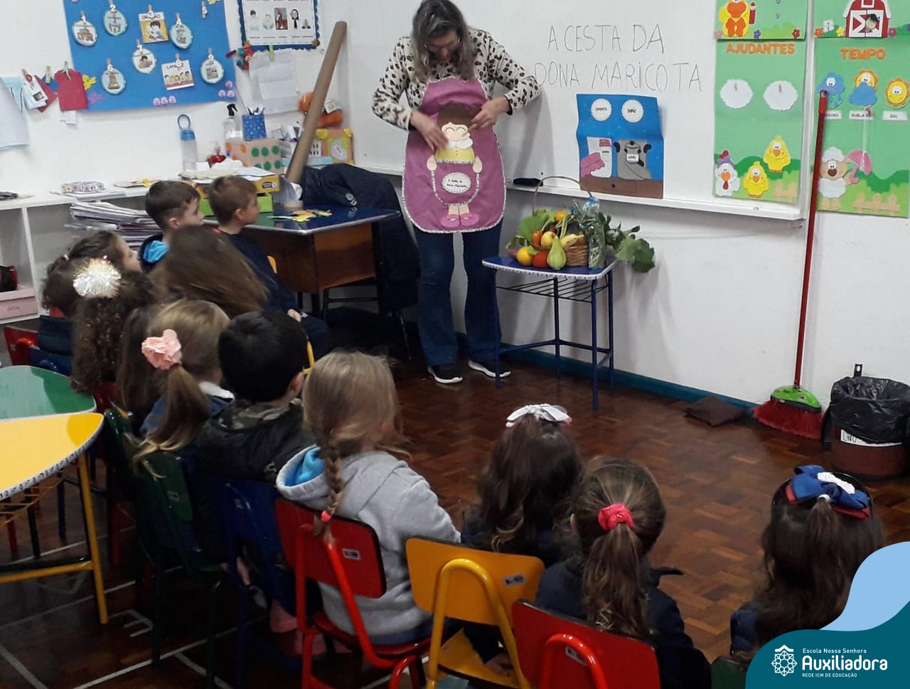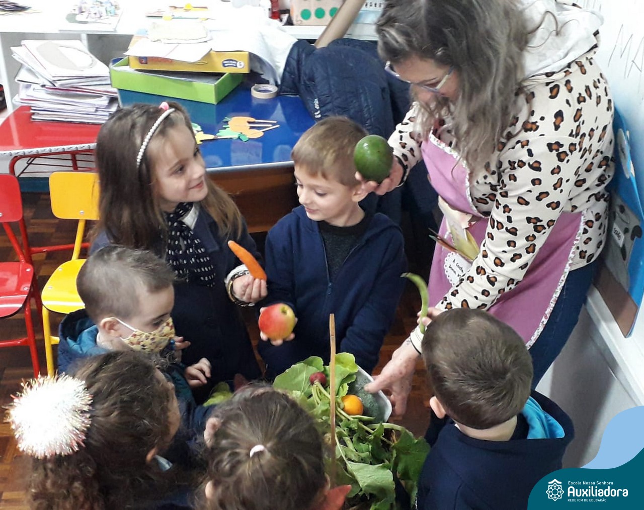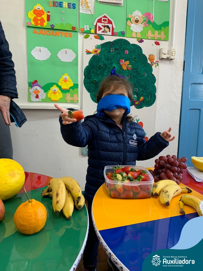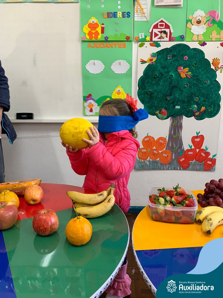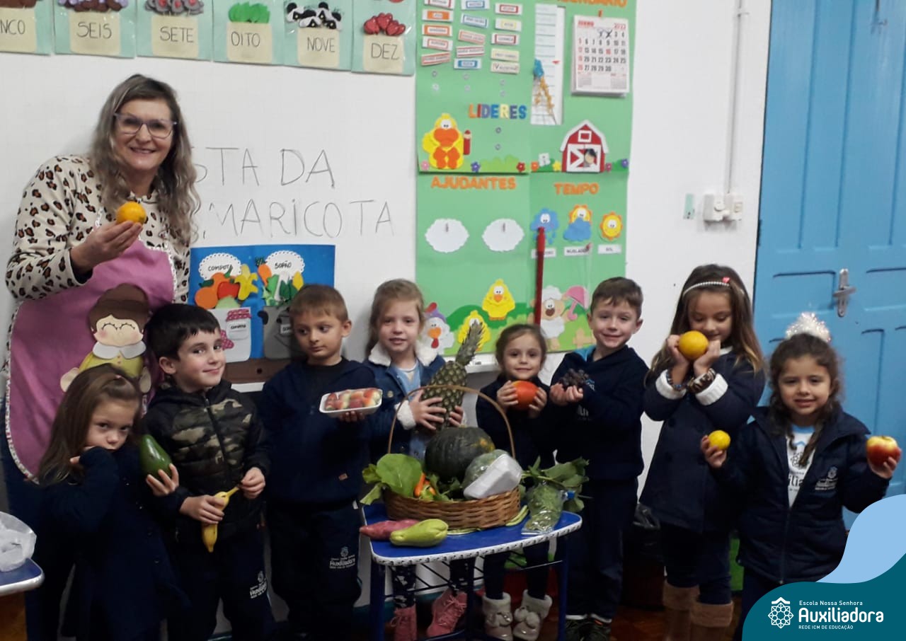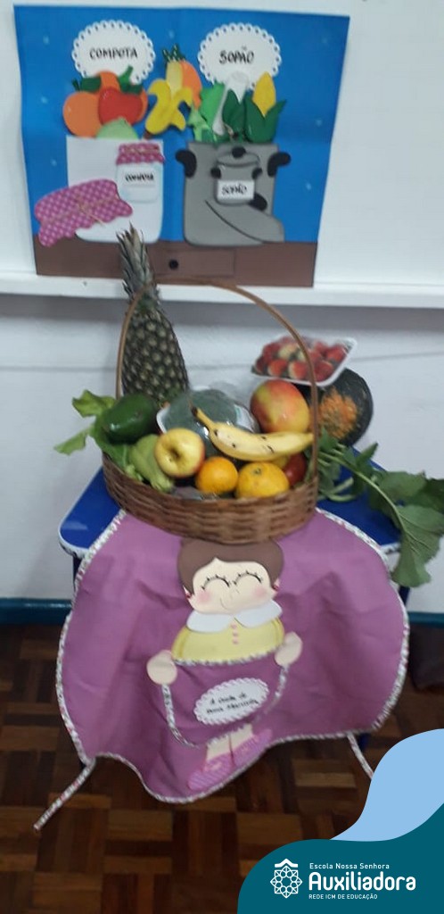 Alimentação Saudável. Que delícia! As crianças foram recepcionadas com uma novidade: A Cesta da Dona Maricota. A partir do contato direto com frutas, legumes e verduras as crianças puderam falar sobre seus gostos particulares e provar outros sabores que são importantes para nossa saúde!