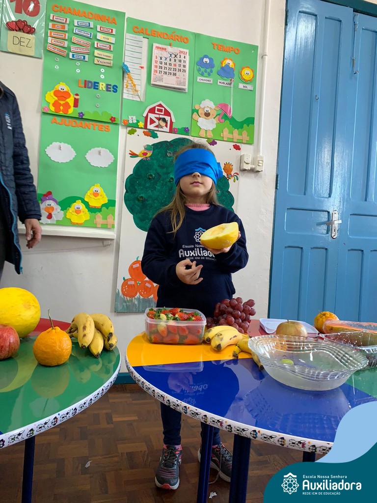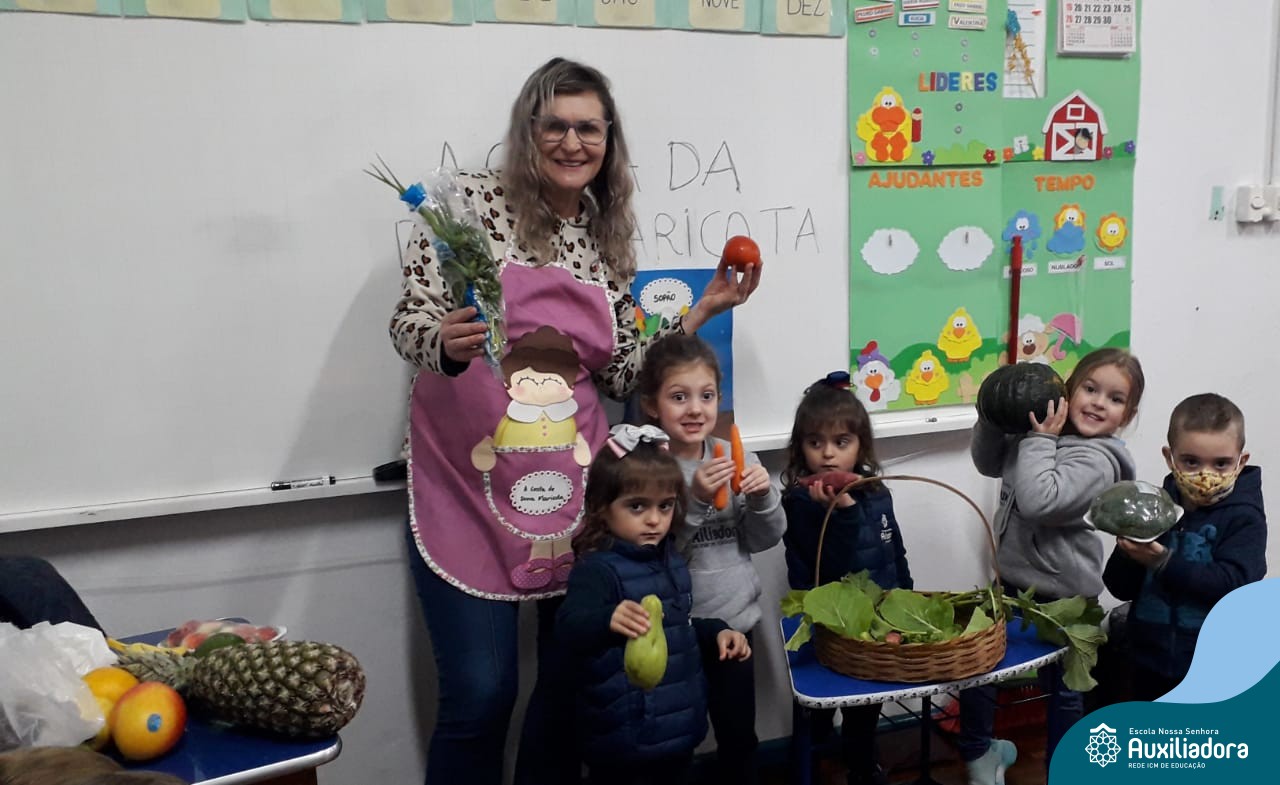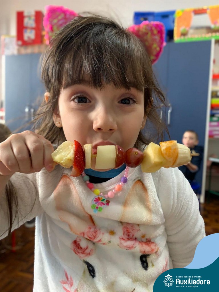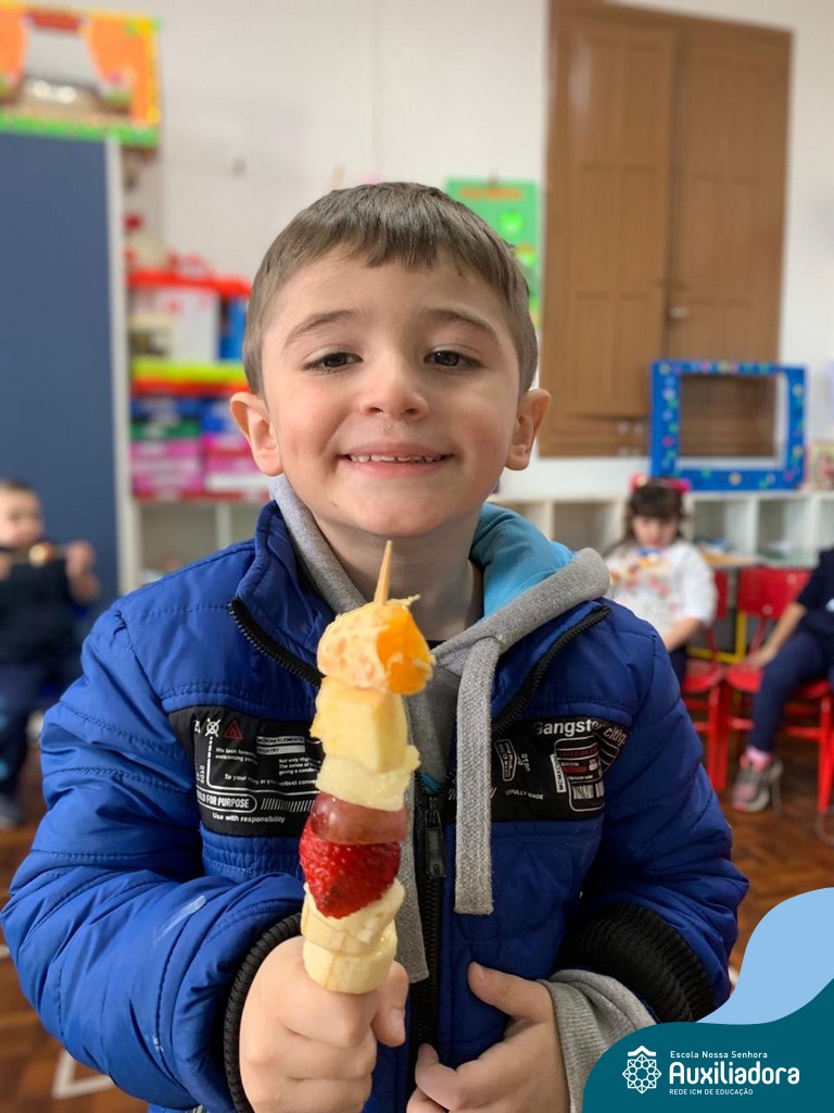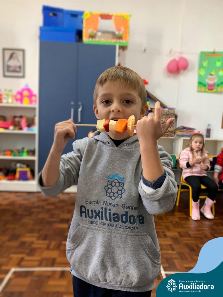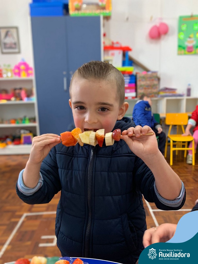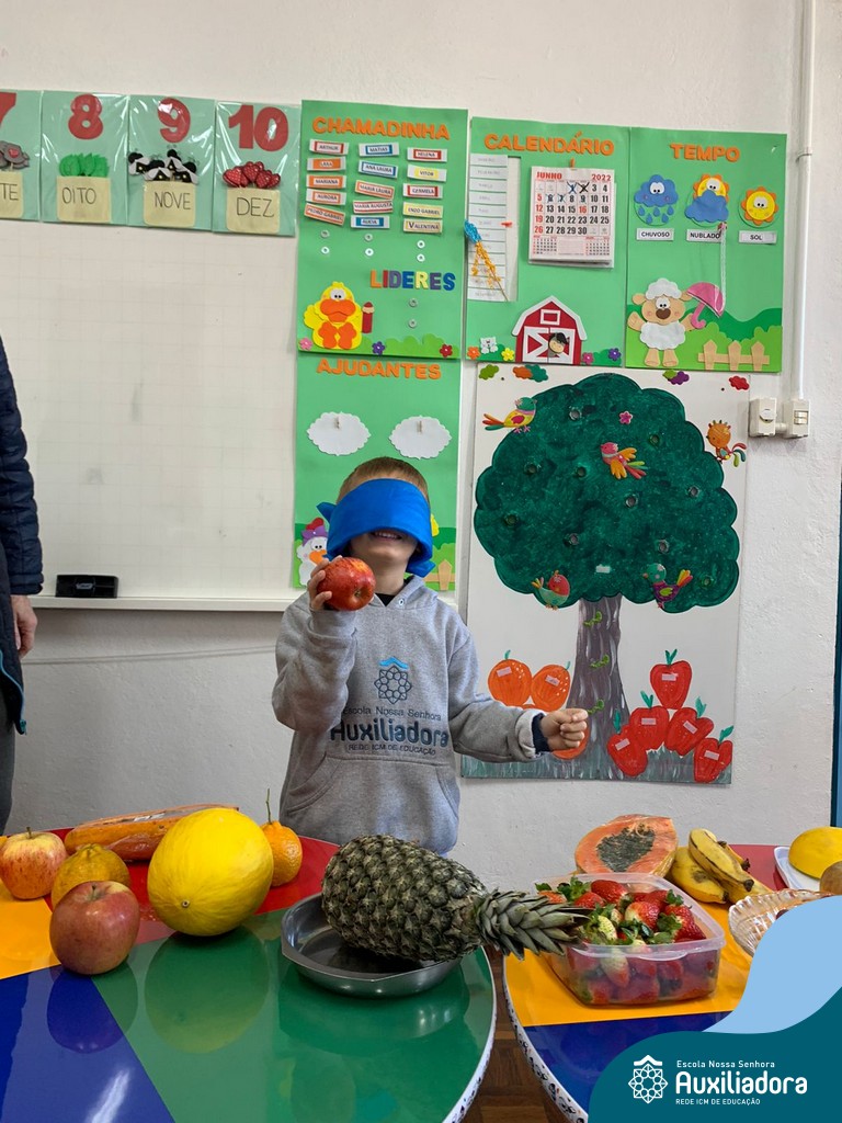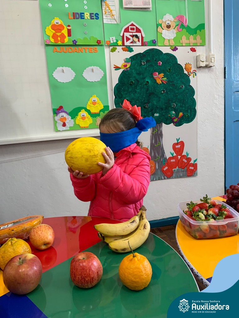 Alimentação Saudável. Que delícia! As crianças foram recepcionadas com uma novidade: A Cesta da Dona Maricota. A partir do contato direto com frutas, legumes e verduras as crianças puderam falar sobre seus gostos particulares e provar outros sabores que são importantes para nossa saúde!