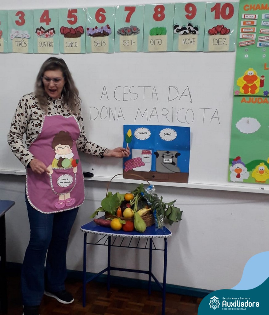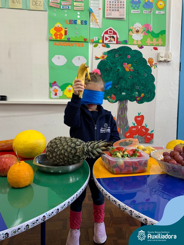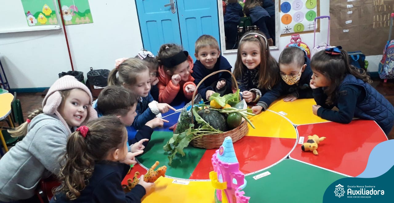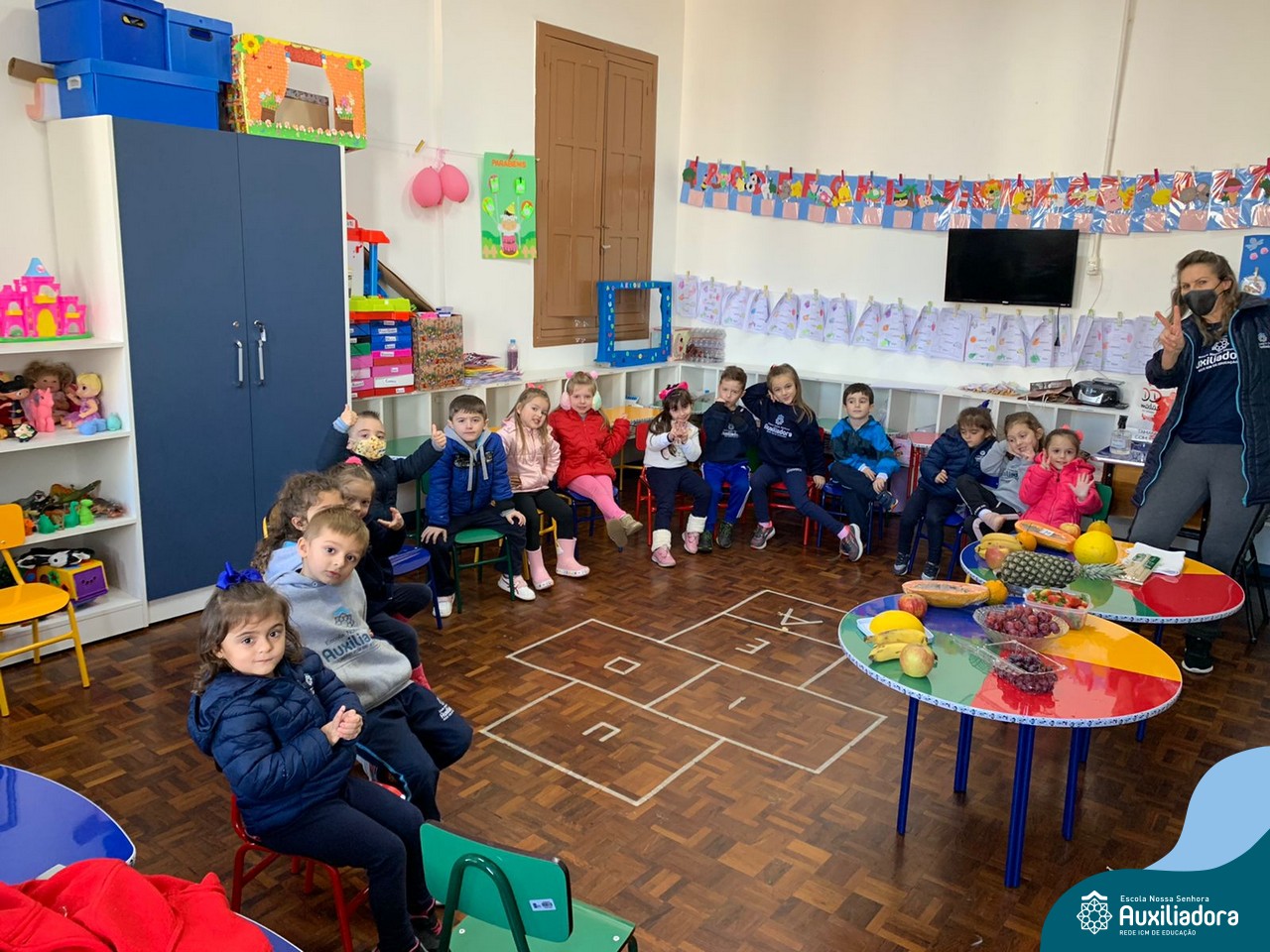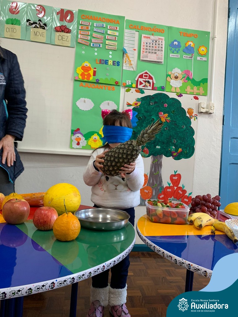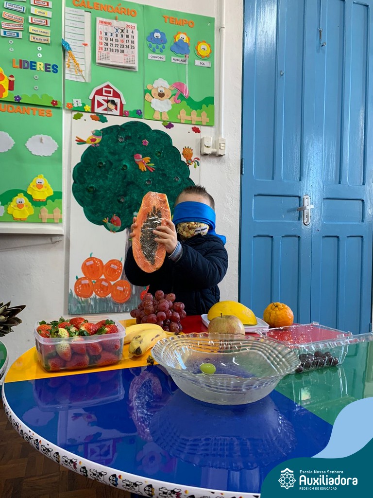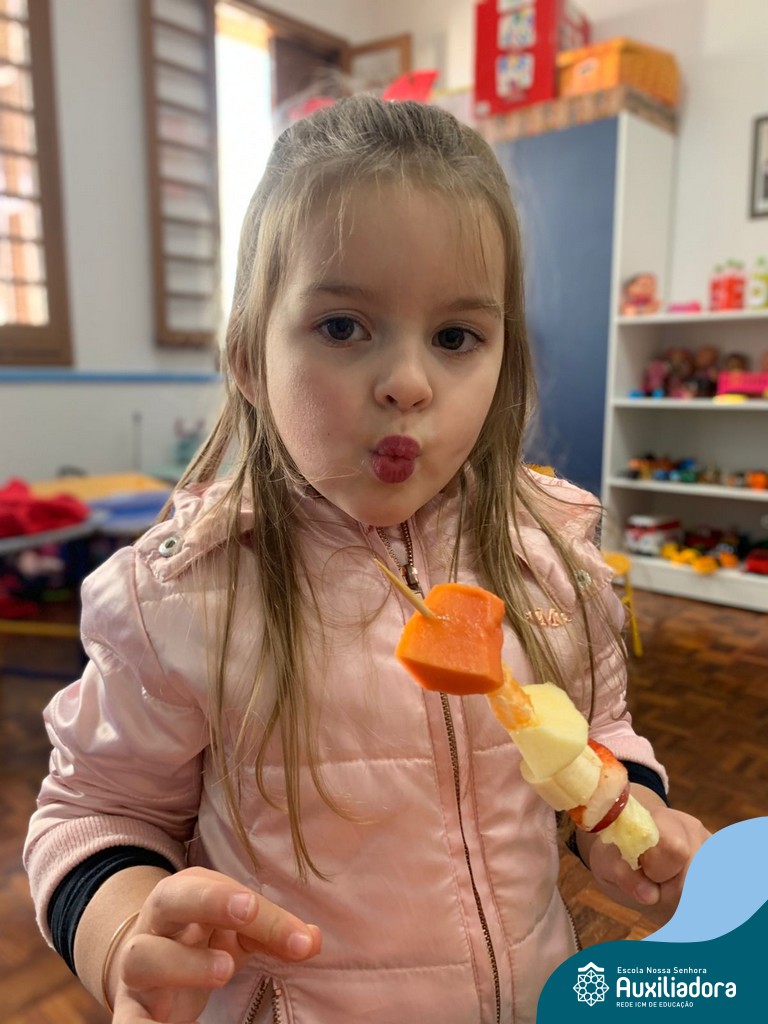 Alimentação Saudável. Que delícia! As crianças foram recepcionadas com uma novidade: A Cesta da Dona Maricota. A partir do contato direto com frutas, legumes e verduras as crianças puderam falar sobre seus gostos particulares e provar outros sabores que são importantes para nossa saúde!