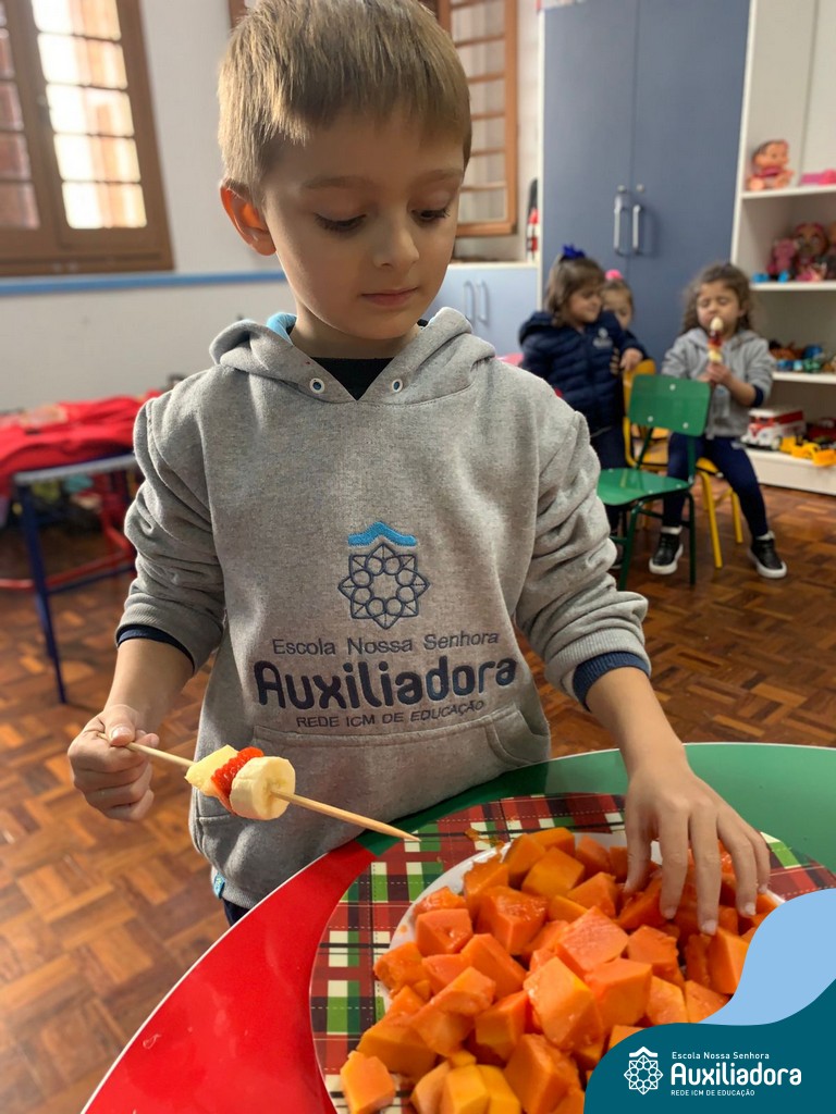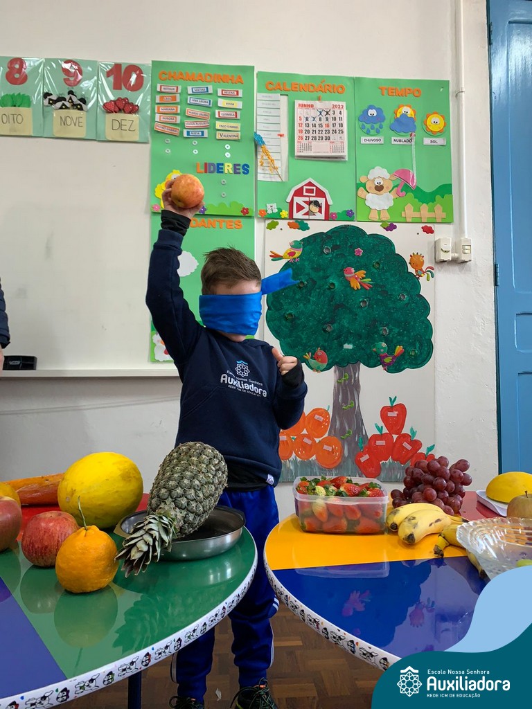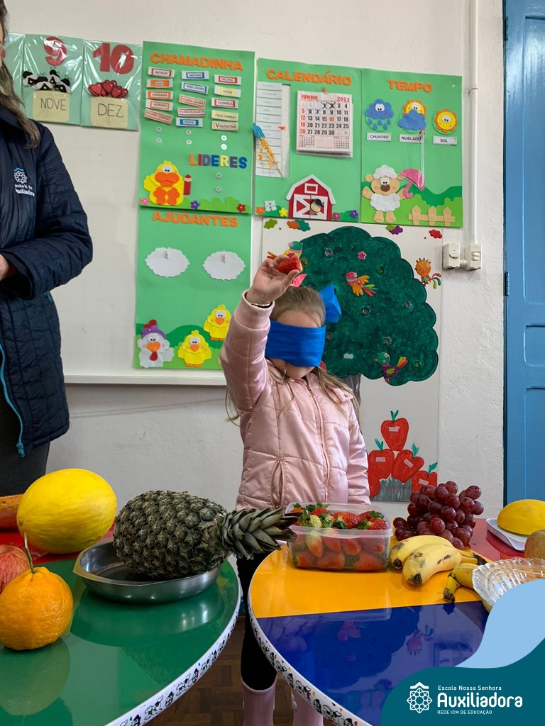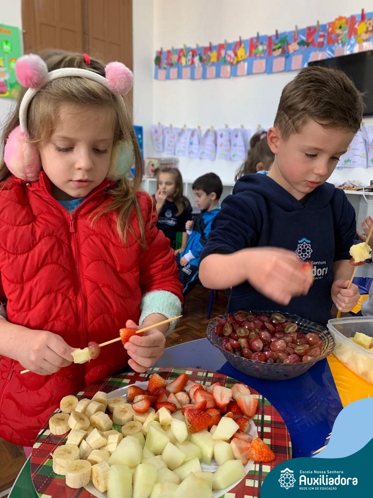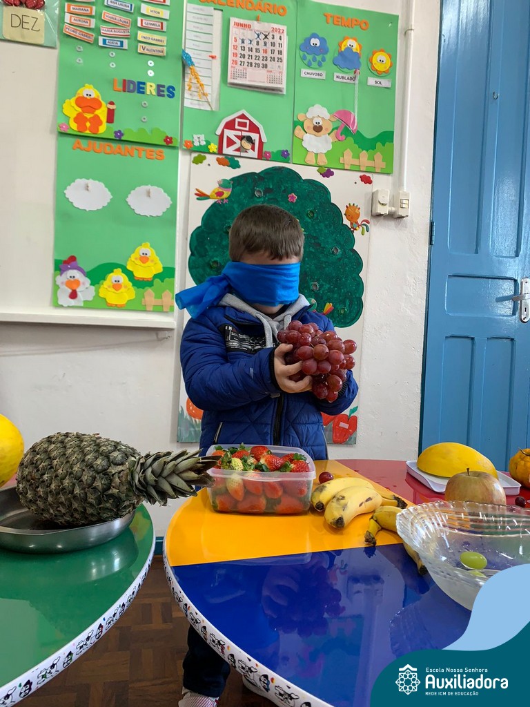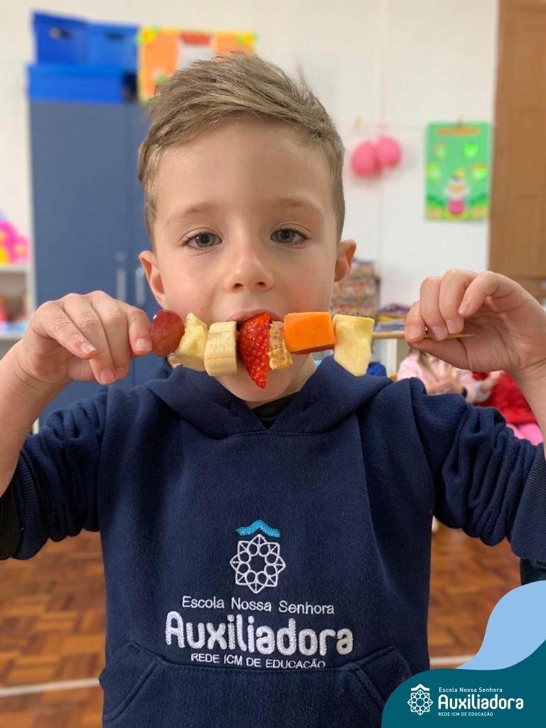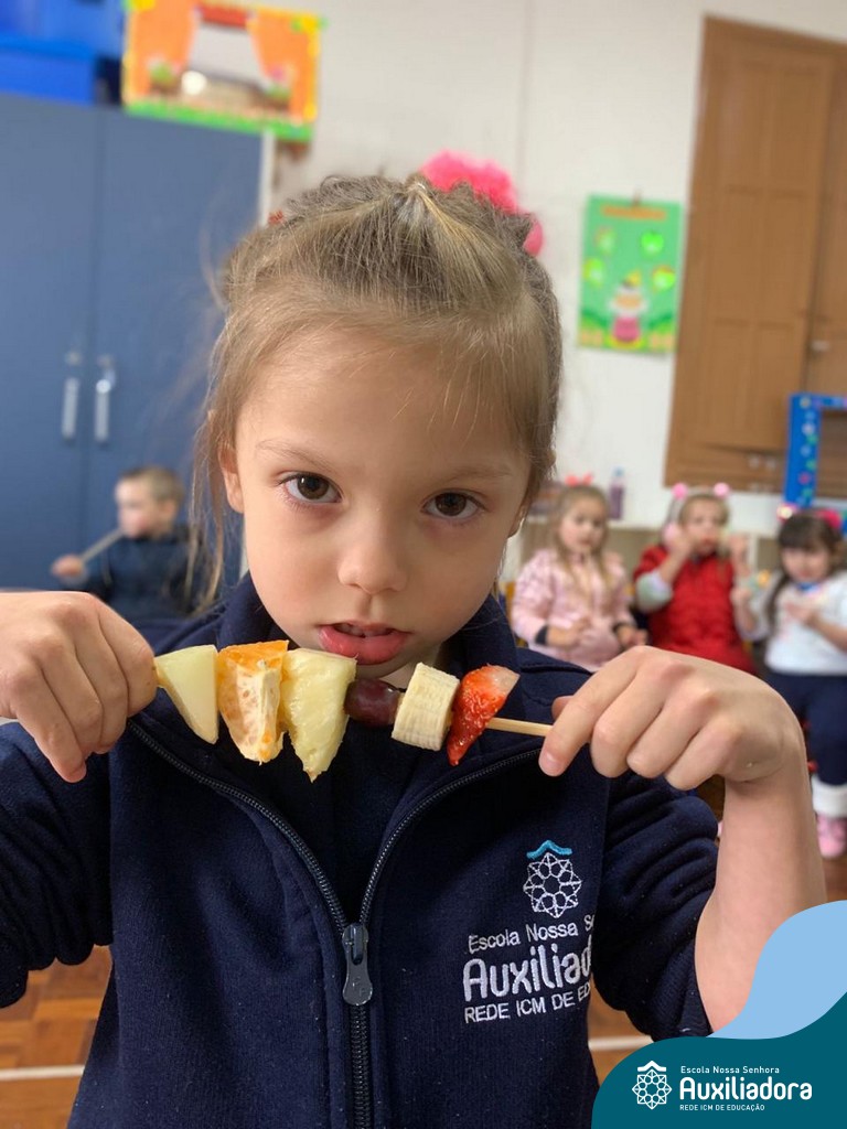 Alimentação Saudável. Que delícia! As crianças foram recepcionadas com uma novidade: A Cesta da Dona Maricota. A partir do contato direto com frutas, legumes e verduras as crianças puderam falar sobre seus gostos particulares e provar outros sabores que são importantes para nossa saúde!