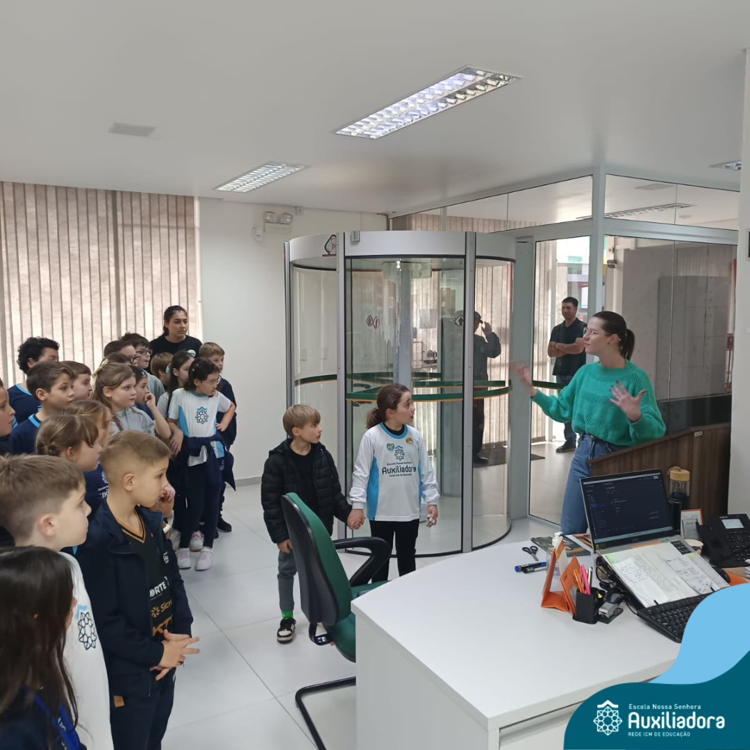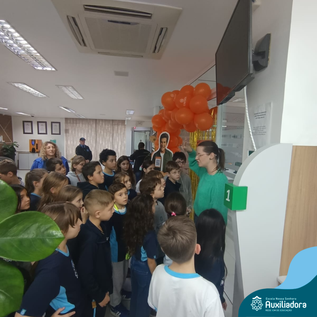 Os alunos do 3º ano da Escola Nossa Senhora Auxiliadora participaram de uma atividade especial fora da sala de aula: visitaram a agência da Cresol Raiz como parte do Projeto Mesadinha. O projeto, que é desenvolvido ao longo do ano na escola, tem como objetivo ensinar, de forma prática e divertida, conceitos importantes sobre educação financeira e cooperativismo.