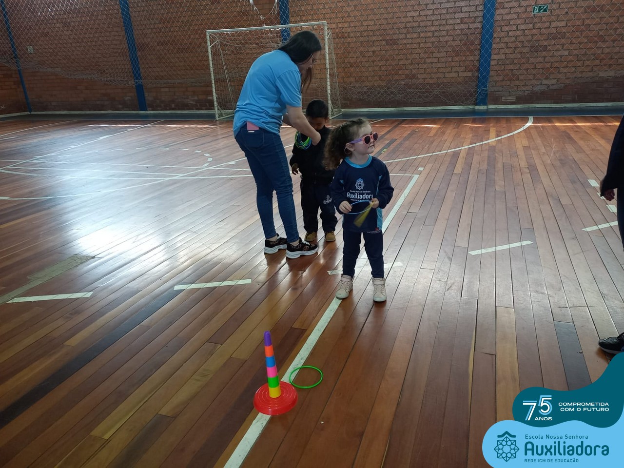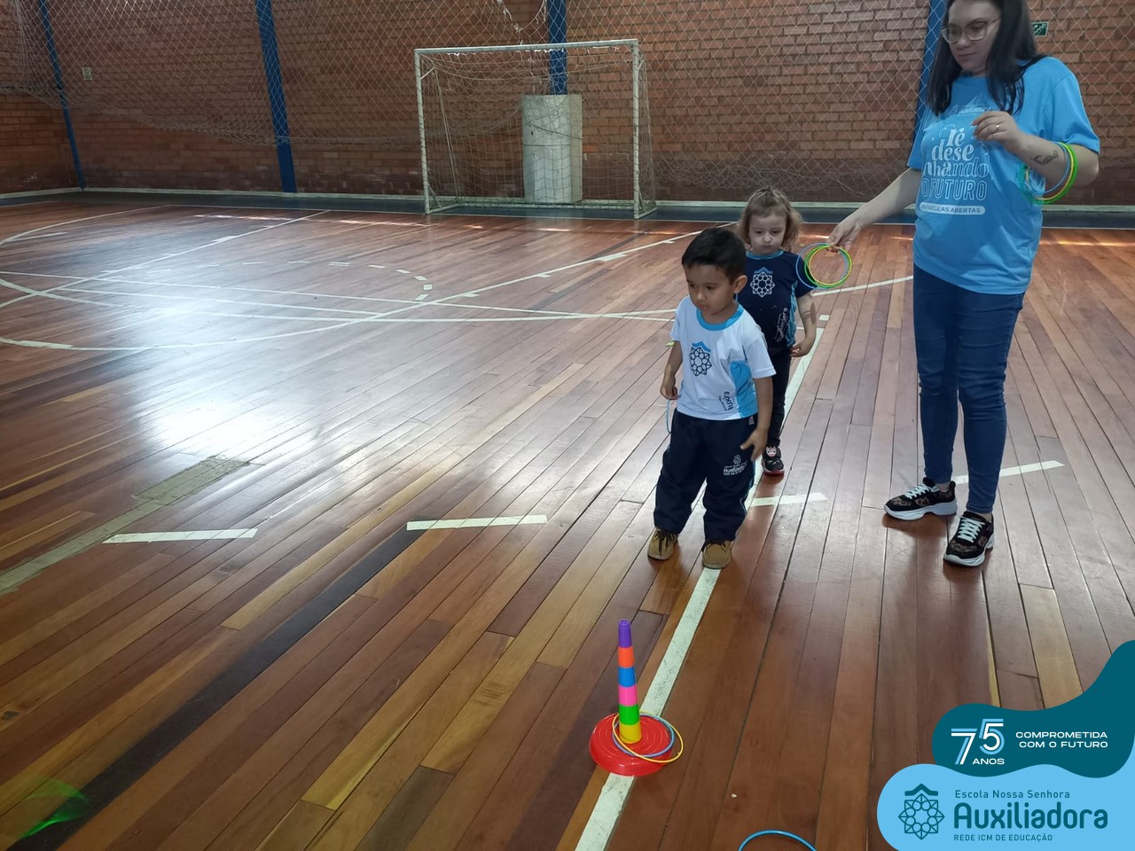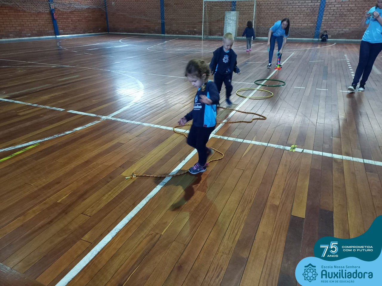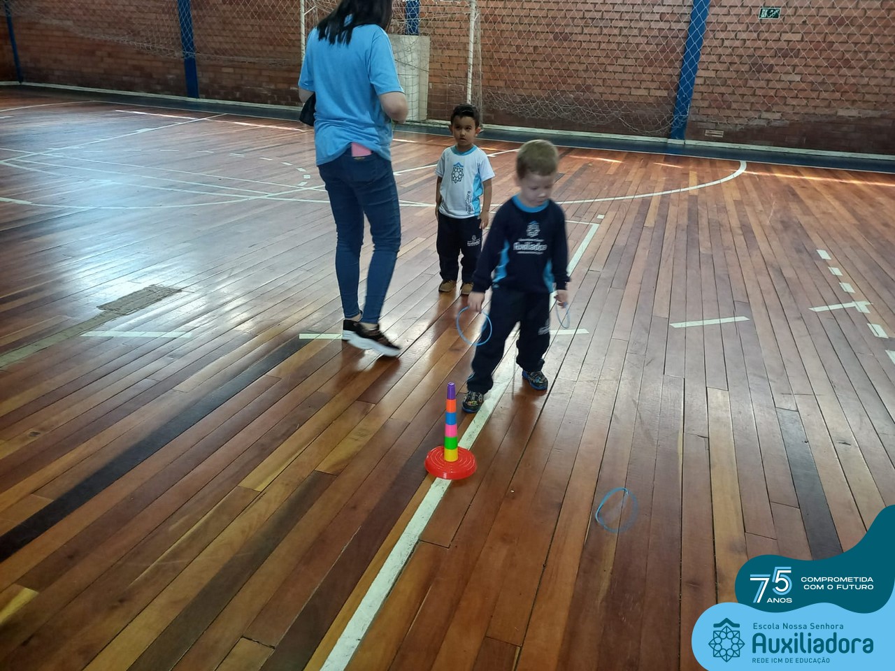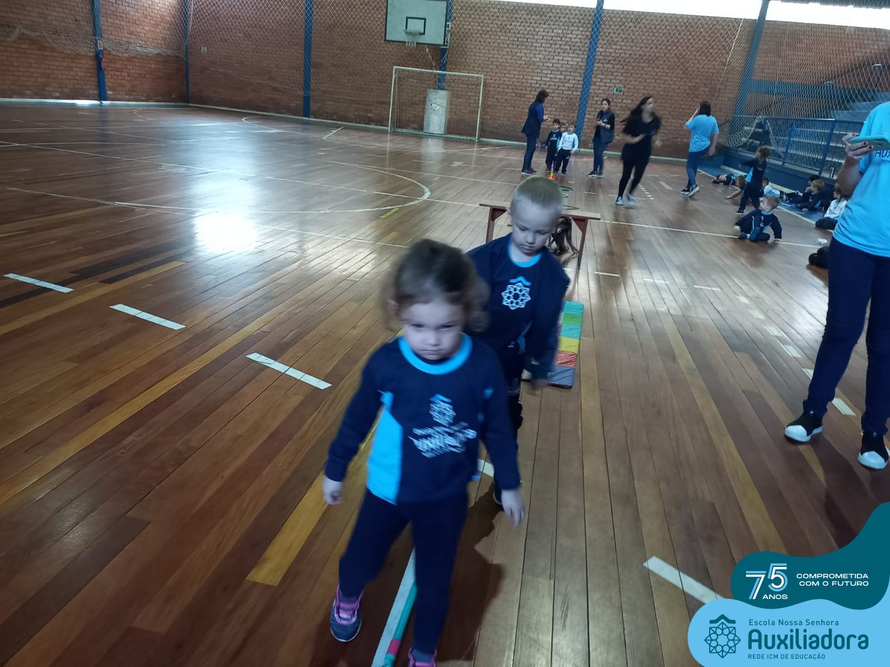 Após, através de um circuito motor, as crianças tiveram a oportunidade de realizarem várias atividades importantes para o seu desenvolvimento! Muita diversão e integração entre as turmas do Maternal 2.