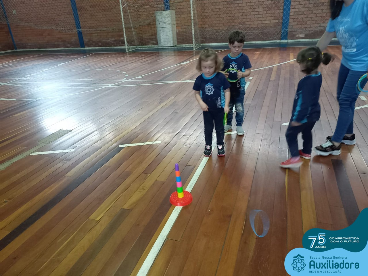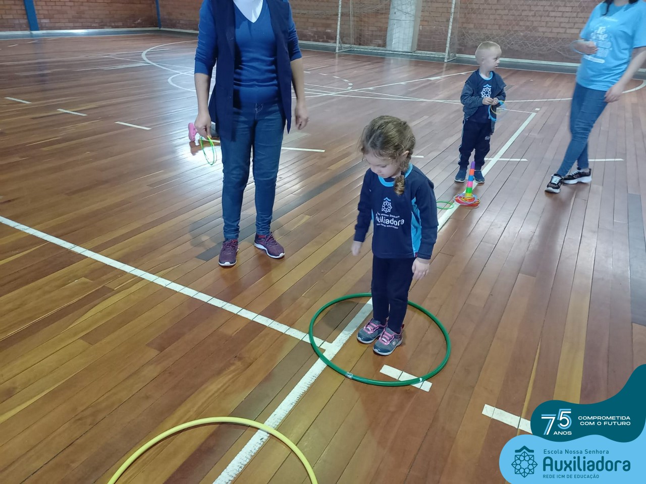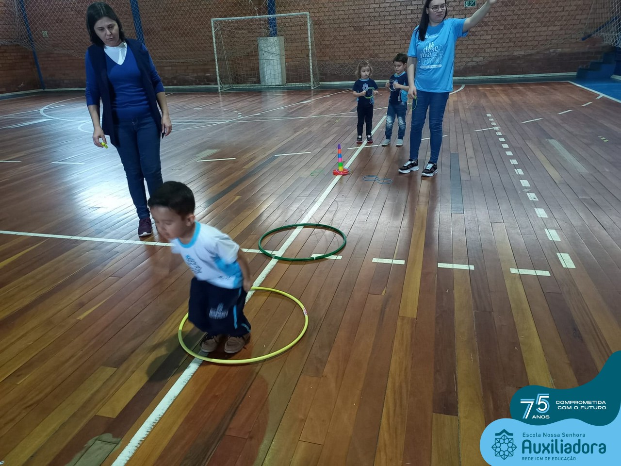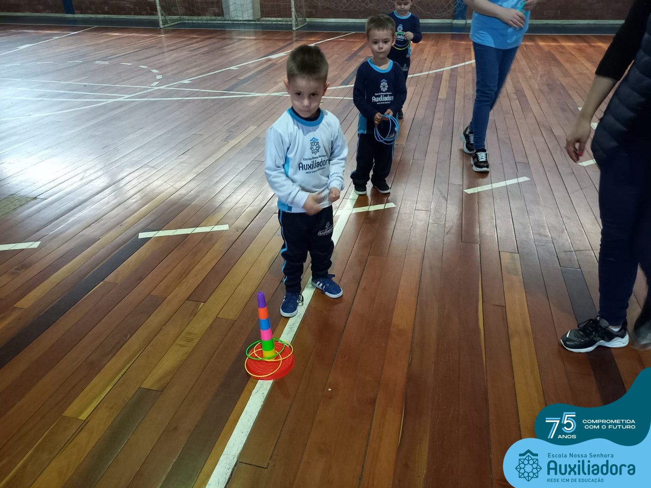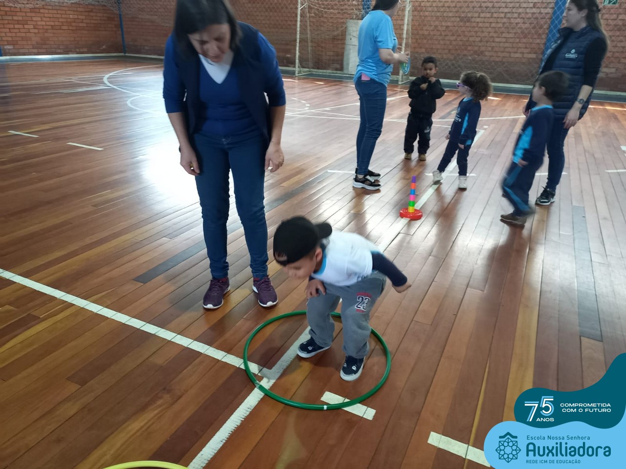 Após, através de um circuito motor, as crianças tiveram a oportunidade de realizarem várias atividades importantes para o seu desenvolvimento! Muita diversão e integração entre as turmas do Maternal 2.