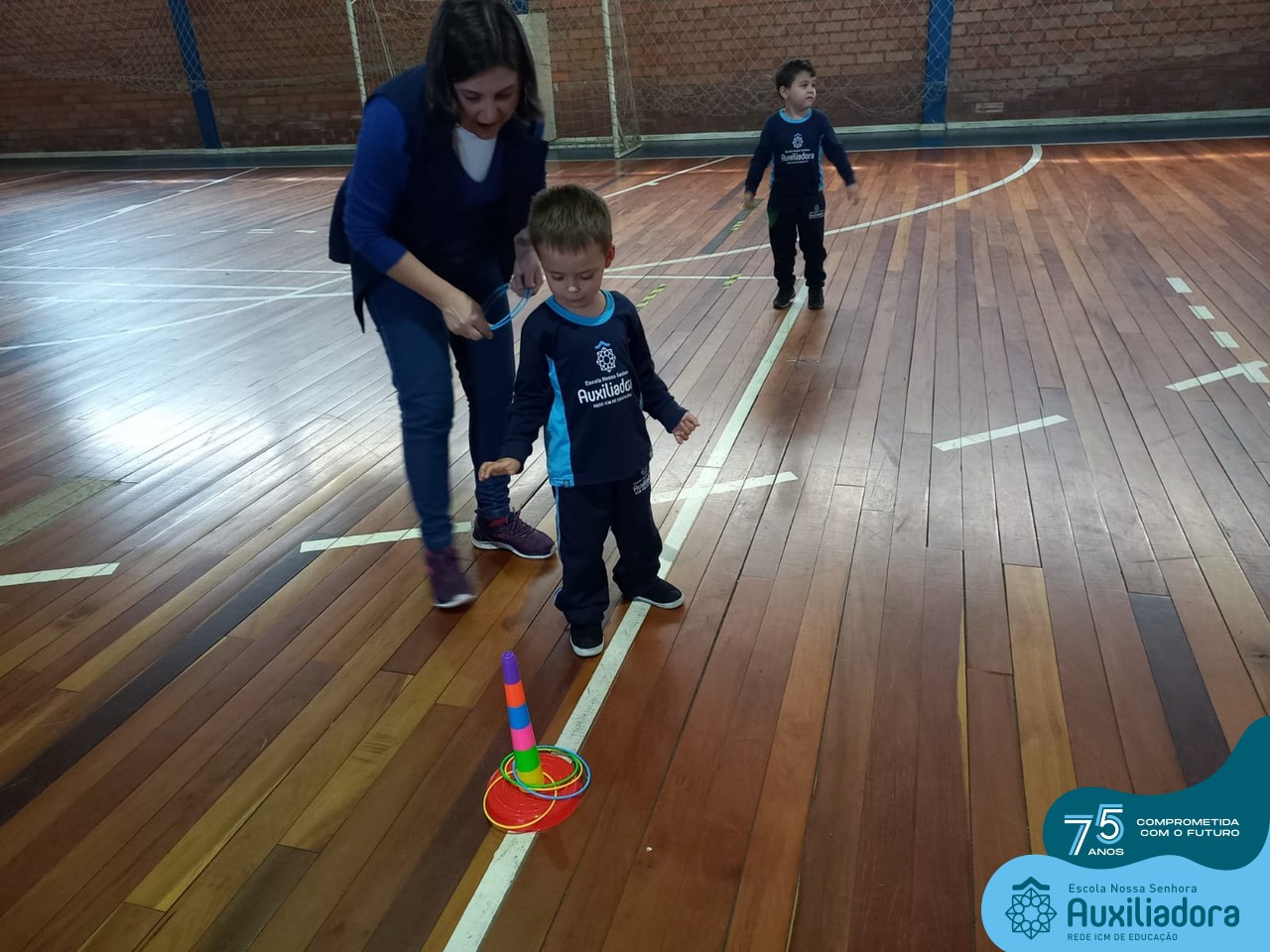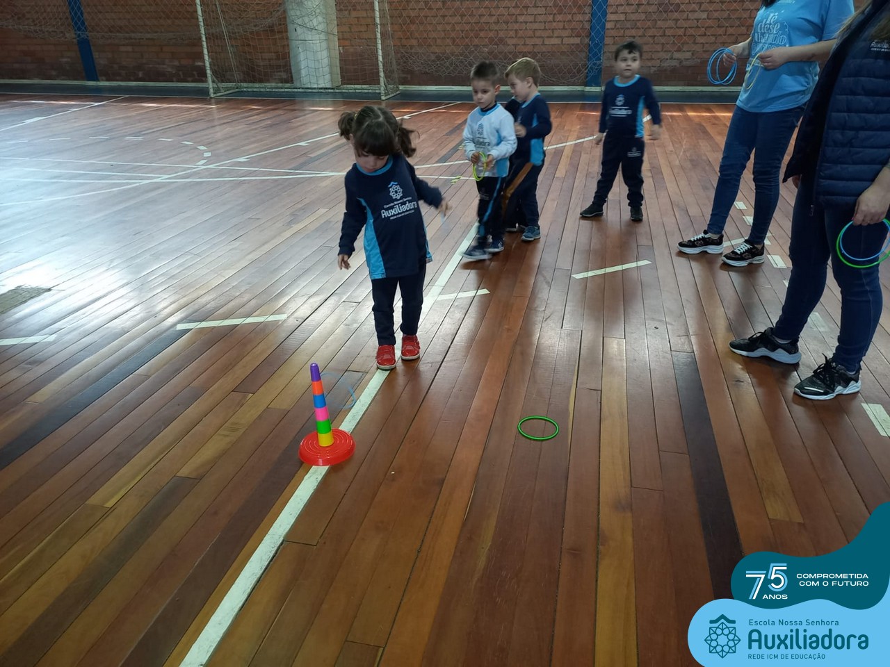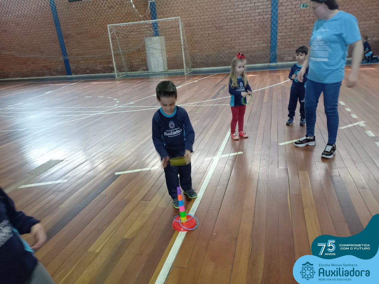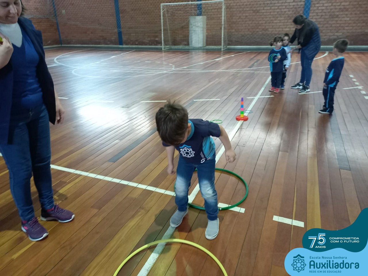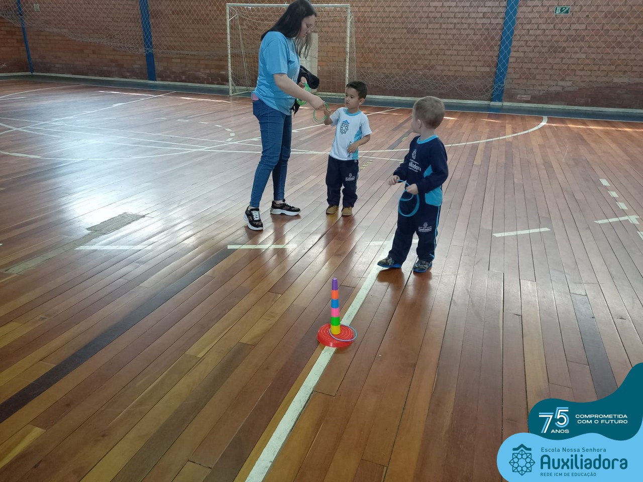 Após, através de um circuito motor, as crianças tiveram a oportunidade de realizarem várias atividades importantes para o seu desenvolvimento! Muita diversão e integração entre as turmas do Maternal 2.