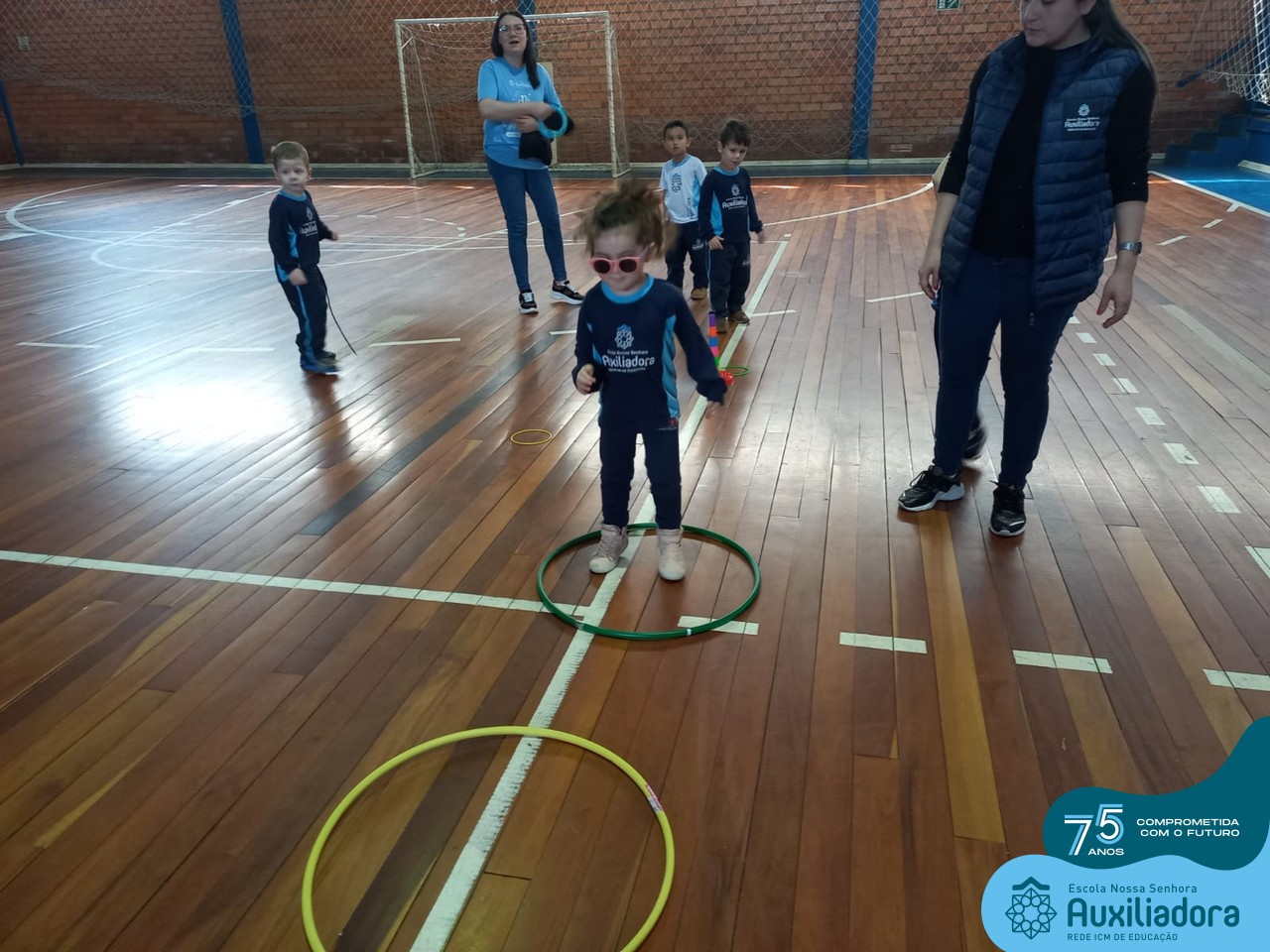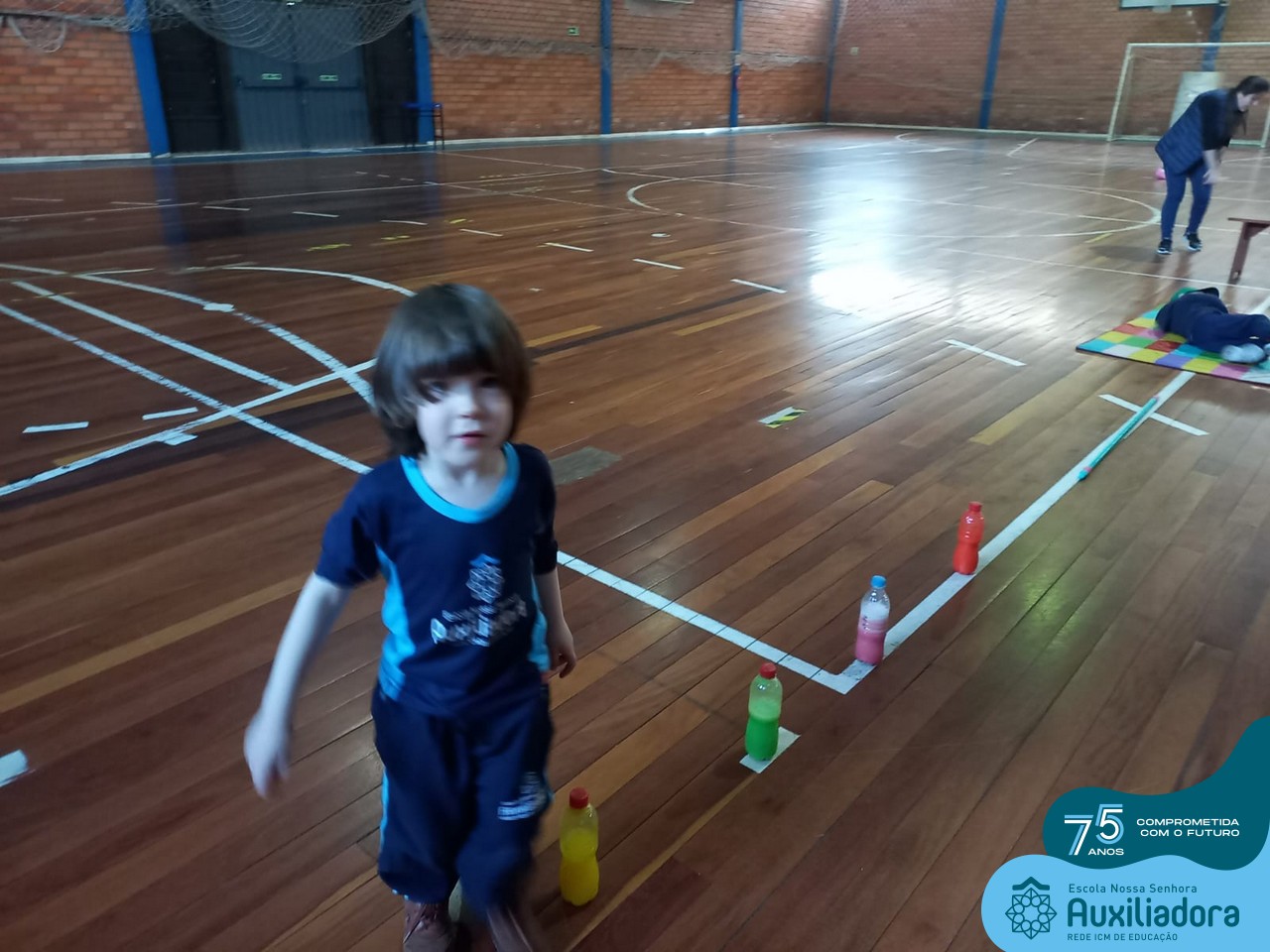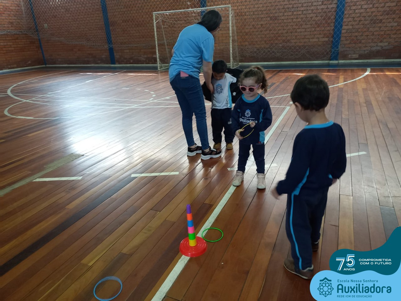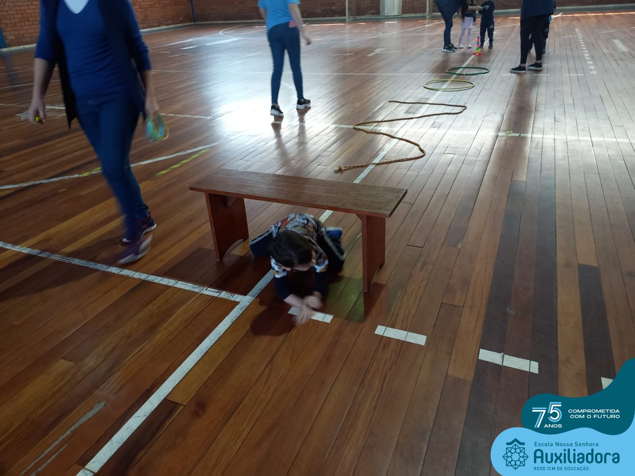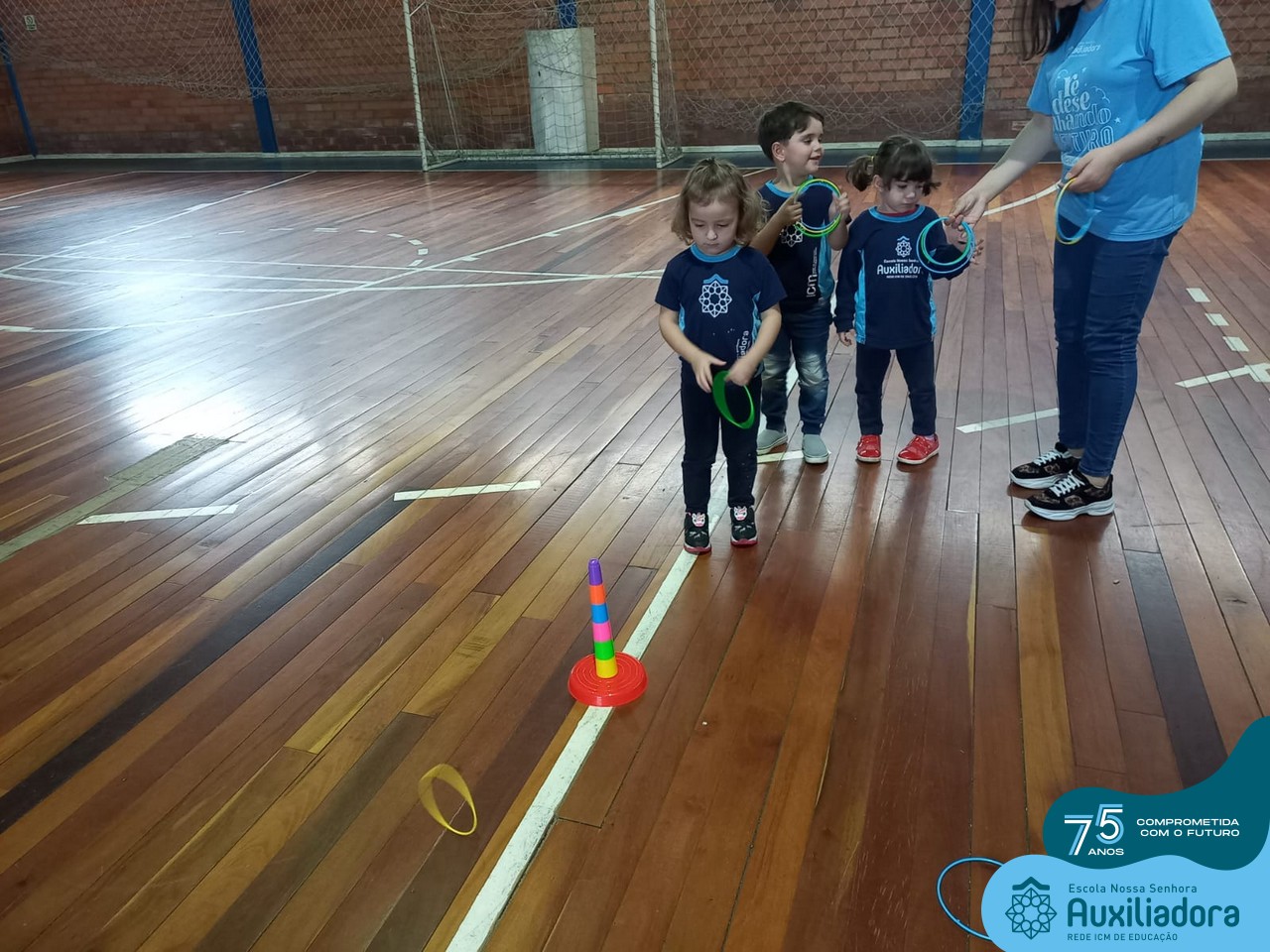 Após, através de um circuito motor, as crianças tiveram a oportunidade de realizarem várias atividades importantes para o seu desenvolvimento! Muita diversão e integração entre as turmas do Maternal 2.