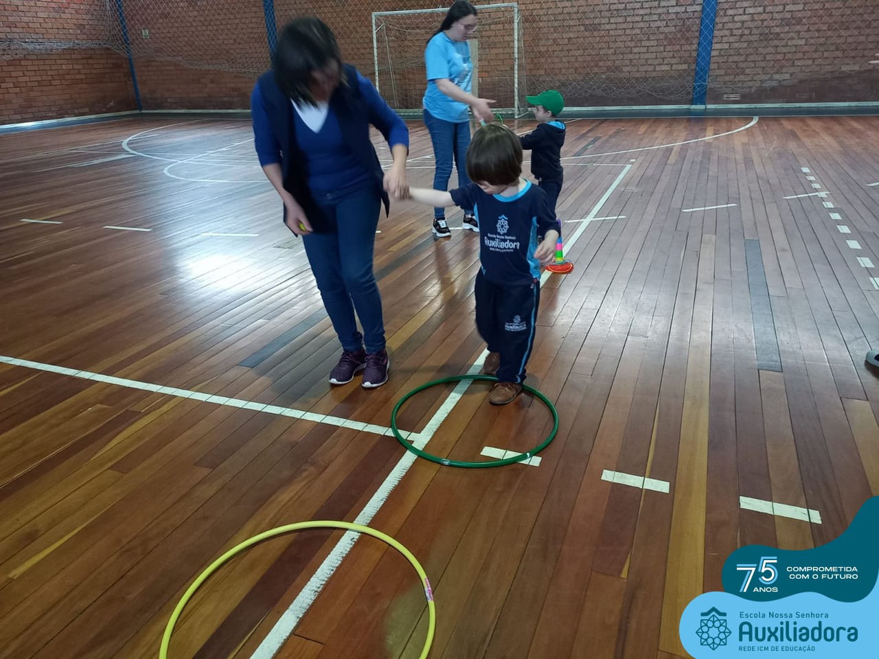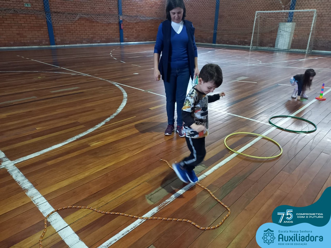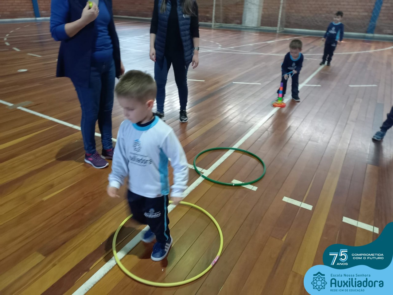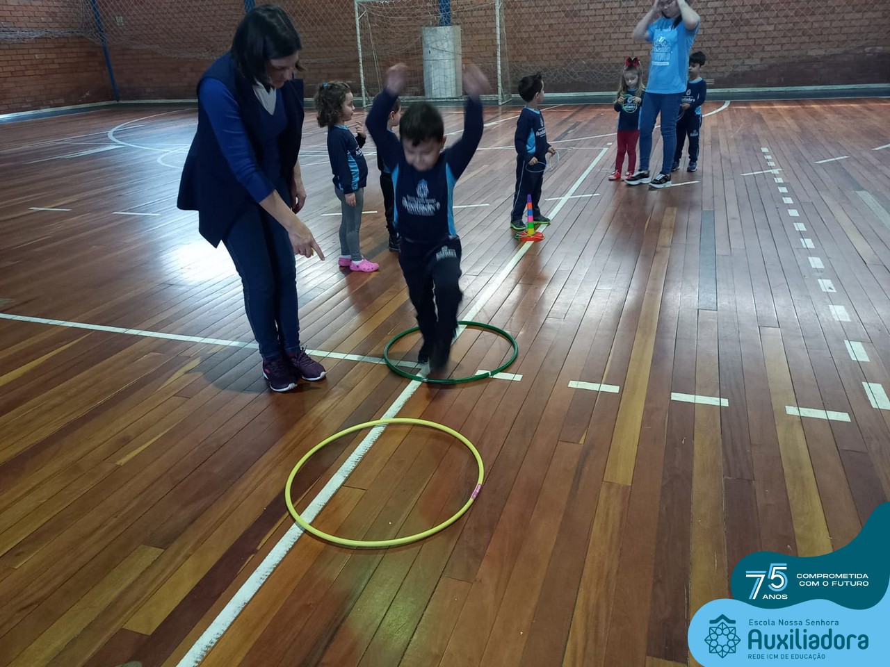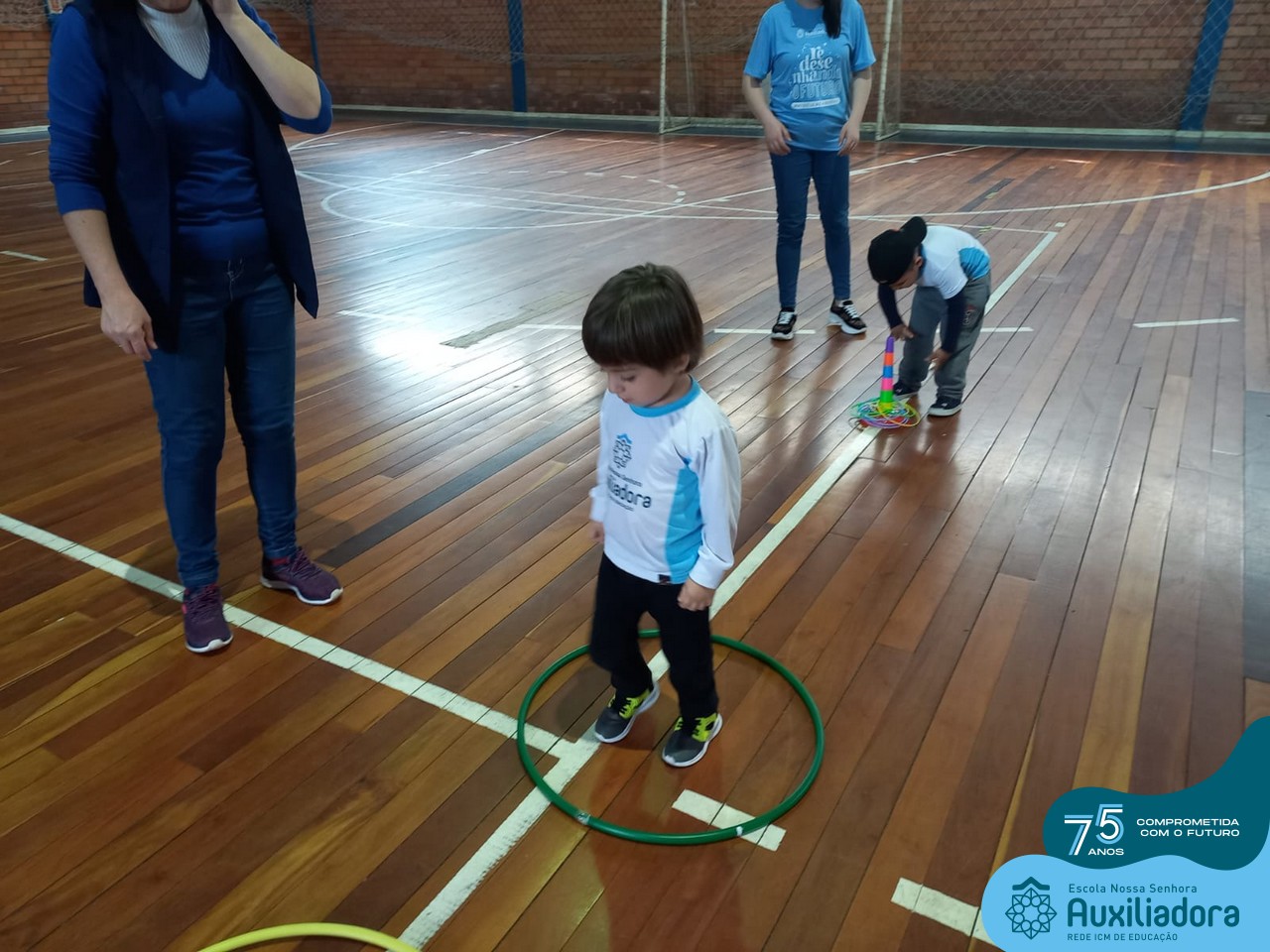 Após, através de um circuito motor, as crianças tiveram a oportunidade de realizarem várias atividades importantes para o seu desenvolvimento! Muita diversão e integração entre as turmas do Maternal 2.