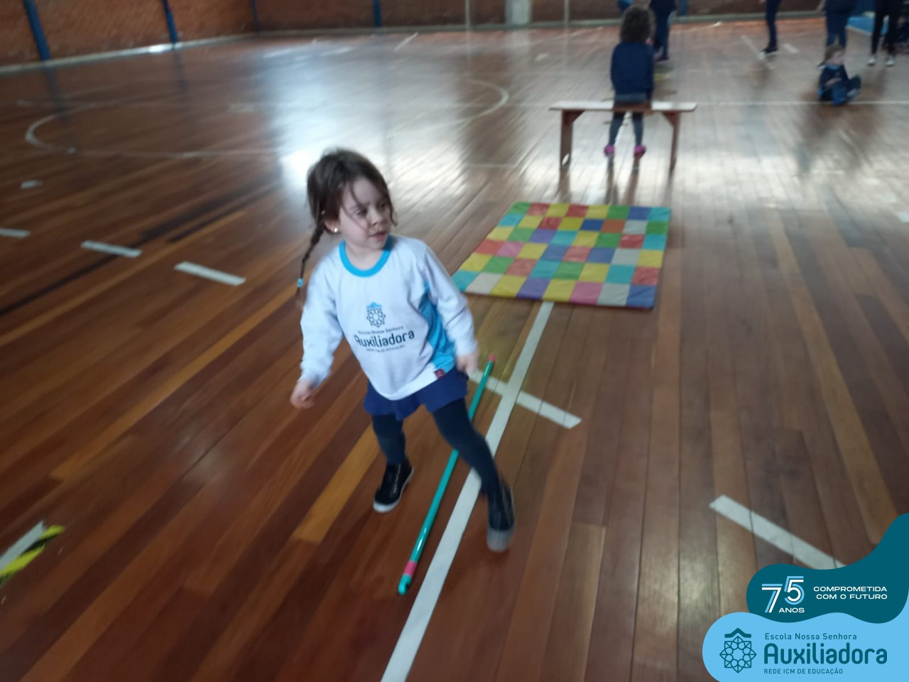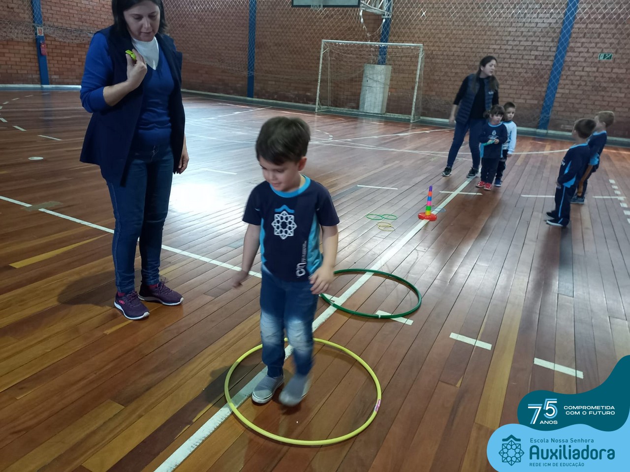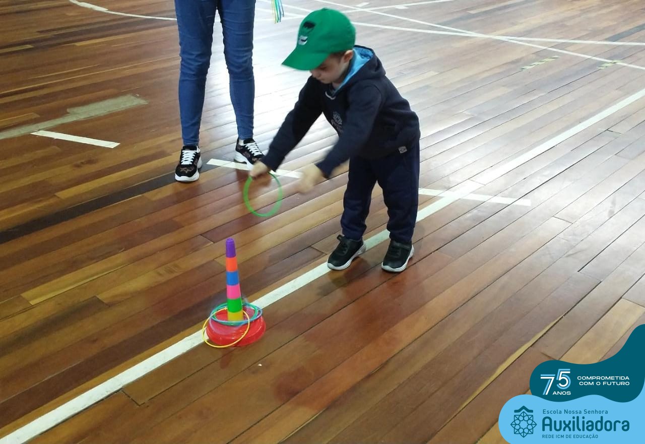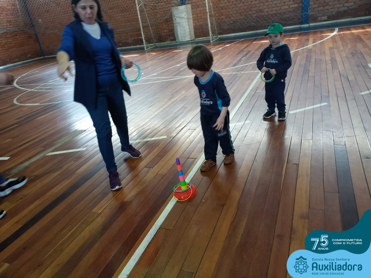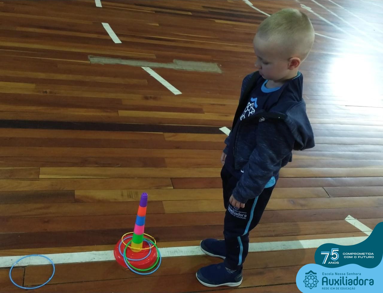 Após, através de um circuito motor, as crianças tiveram a oportunidade de realizarem várias atividades importantes para o seu desenvolvimento! Muita diversão e integração entre as turmas do Maternal 2.