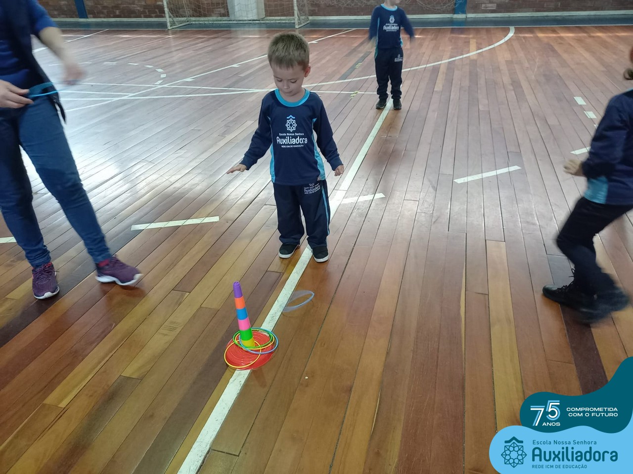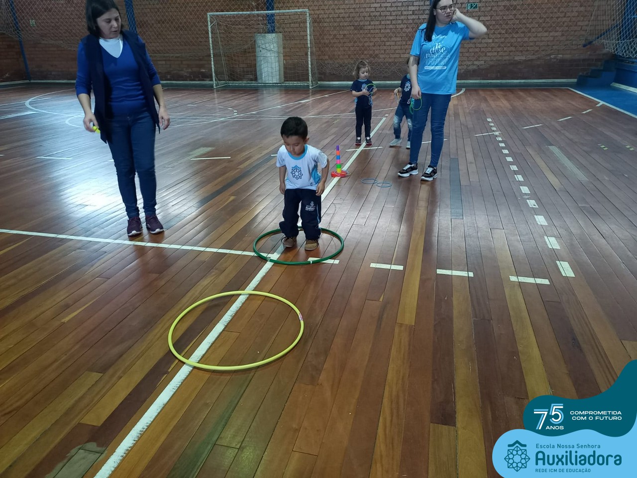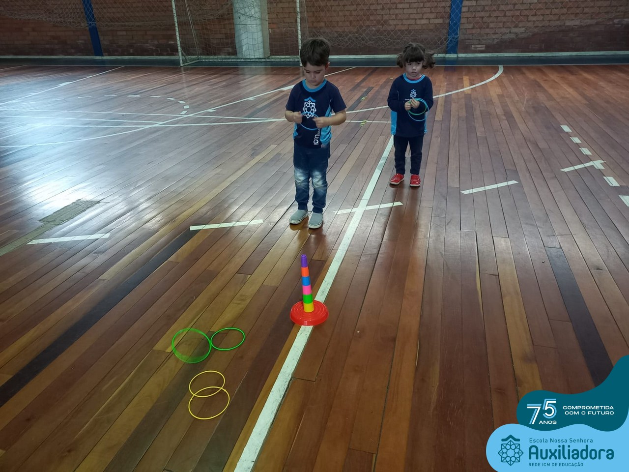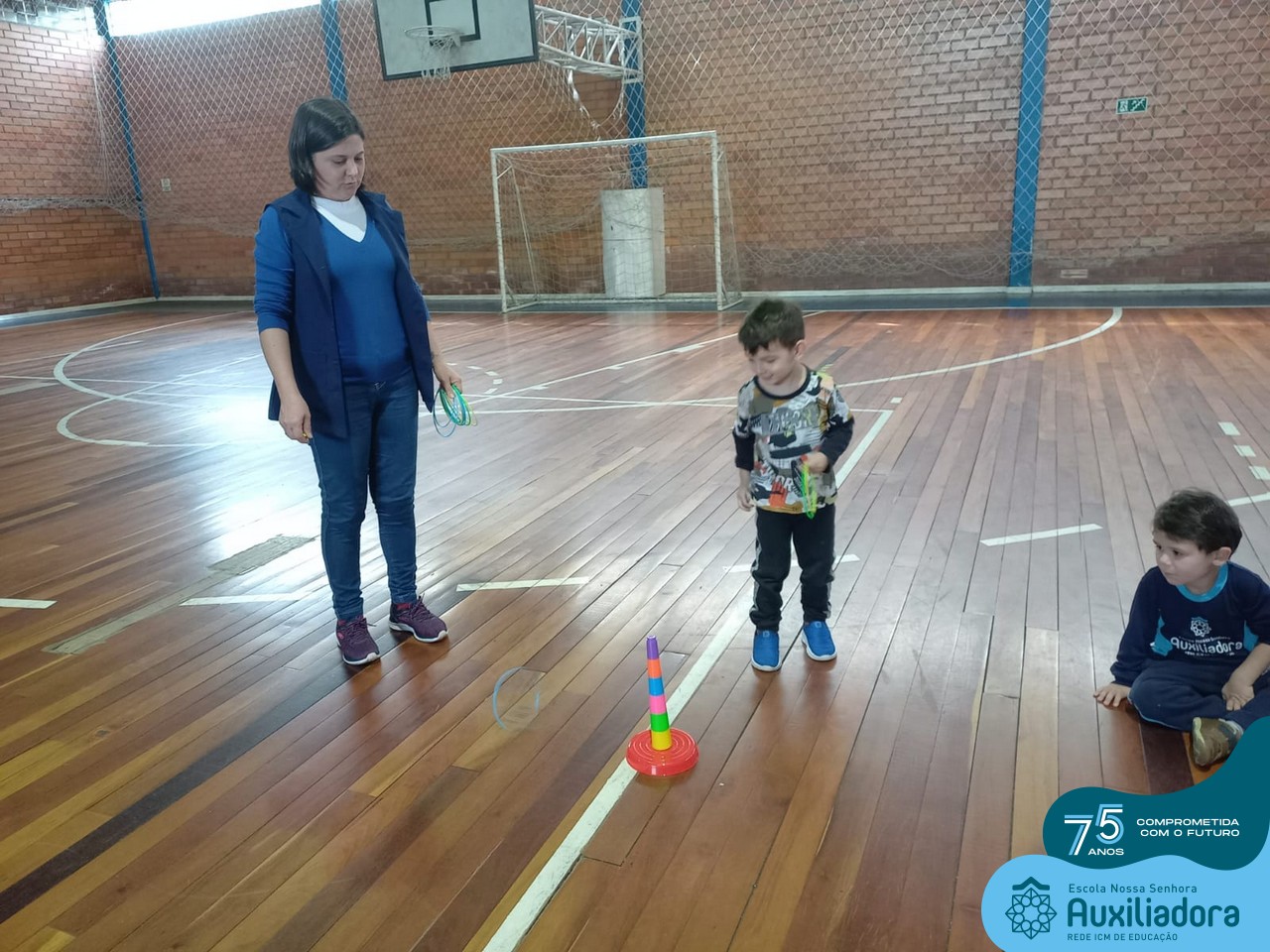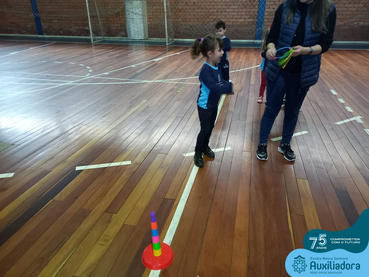 Após, através de um circuito motor, as crianças tiveram a oportunidade de realizarem várias atividades importantes para o seu desenvolvimento! Muita diversão e integração entre as turmas do Maternal 2.
