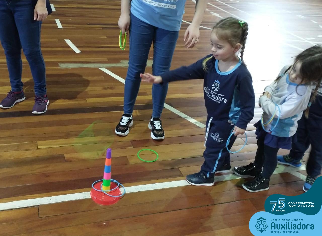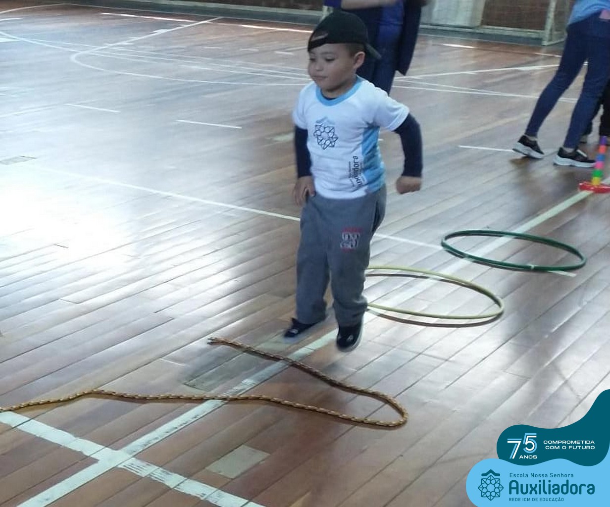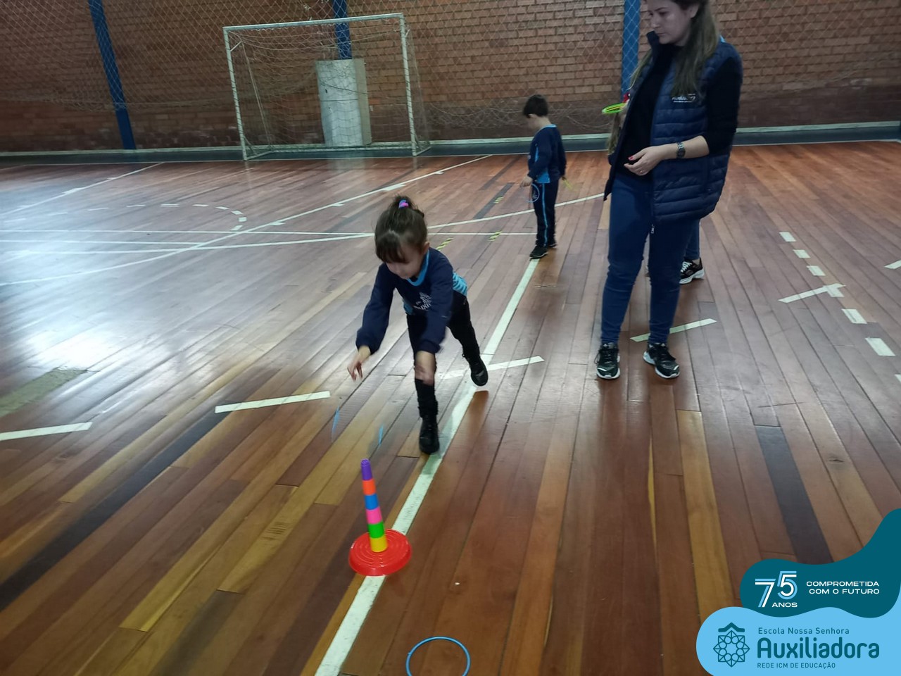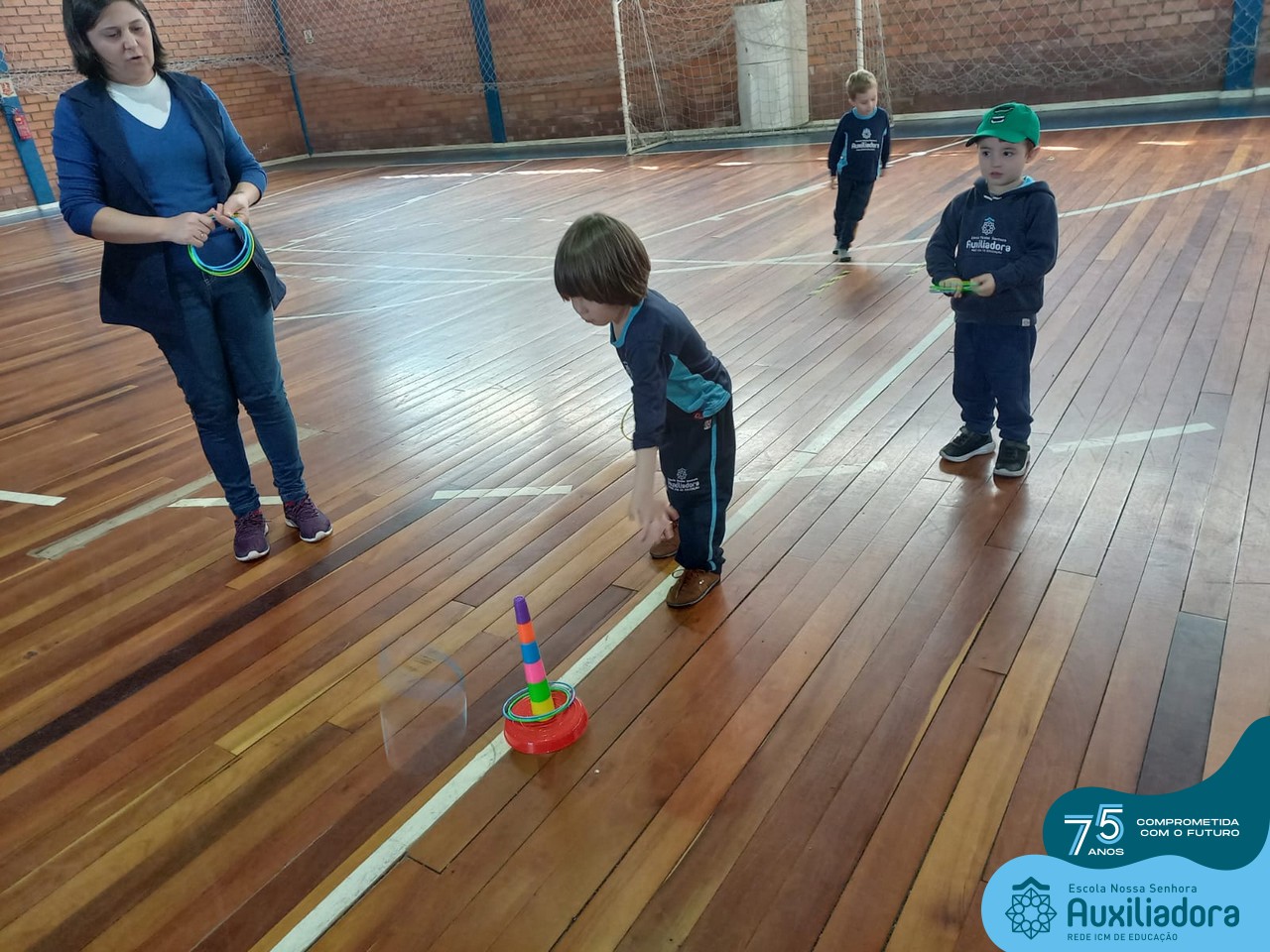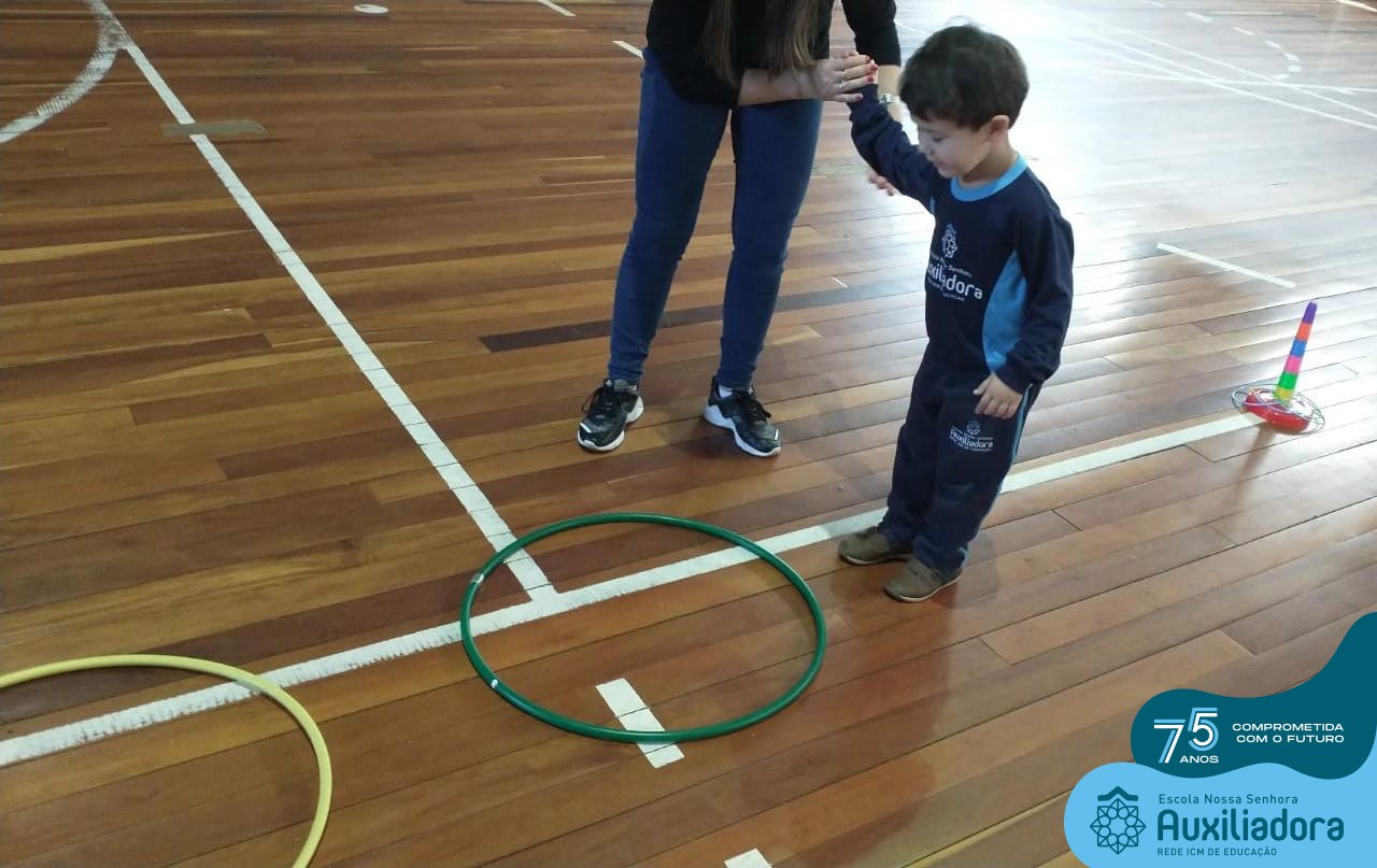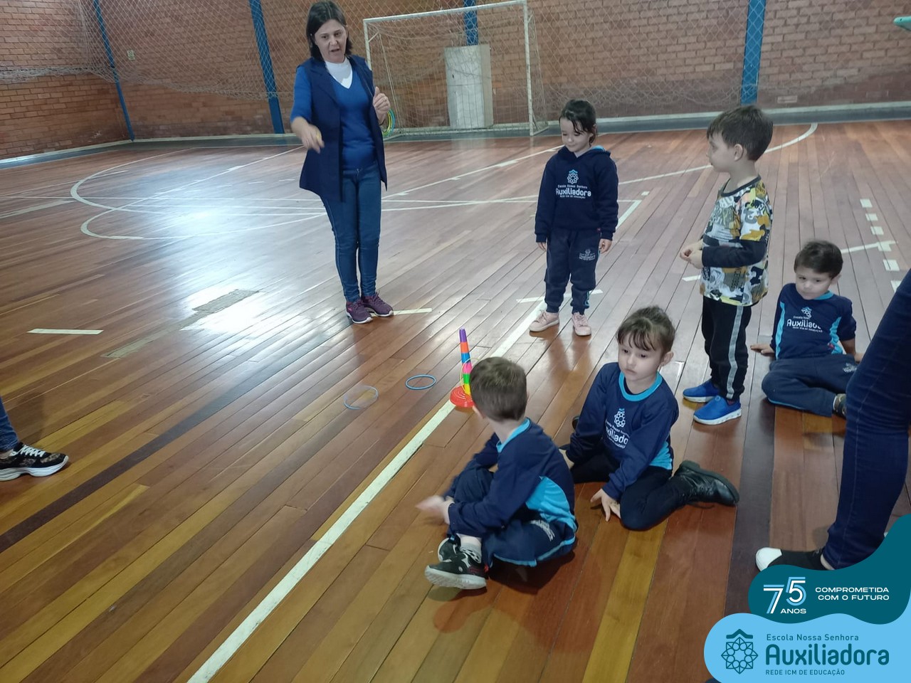 Após, através de um circuito motor, as crianças tiveram a oportunidade de realizarem várias atividades importantes para o seu desenvolvimento! Muita diversão e integração entre as turmas do Maternal 2.