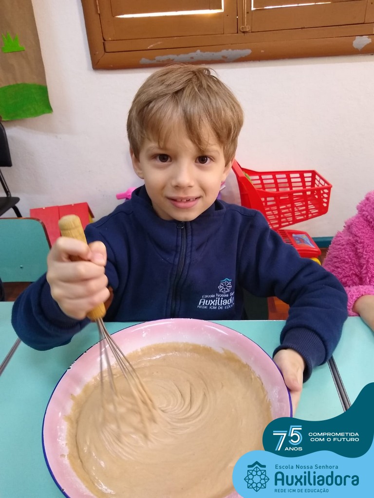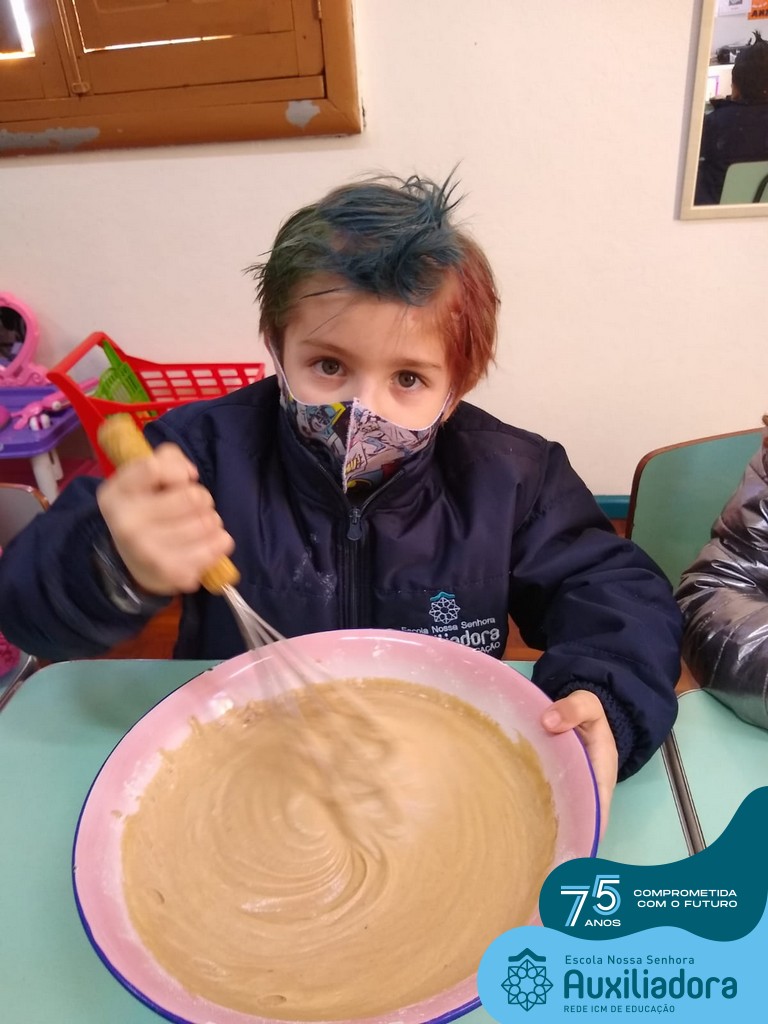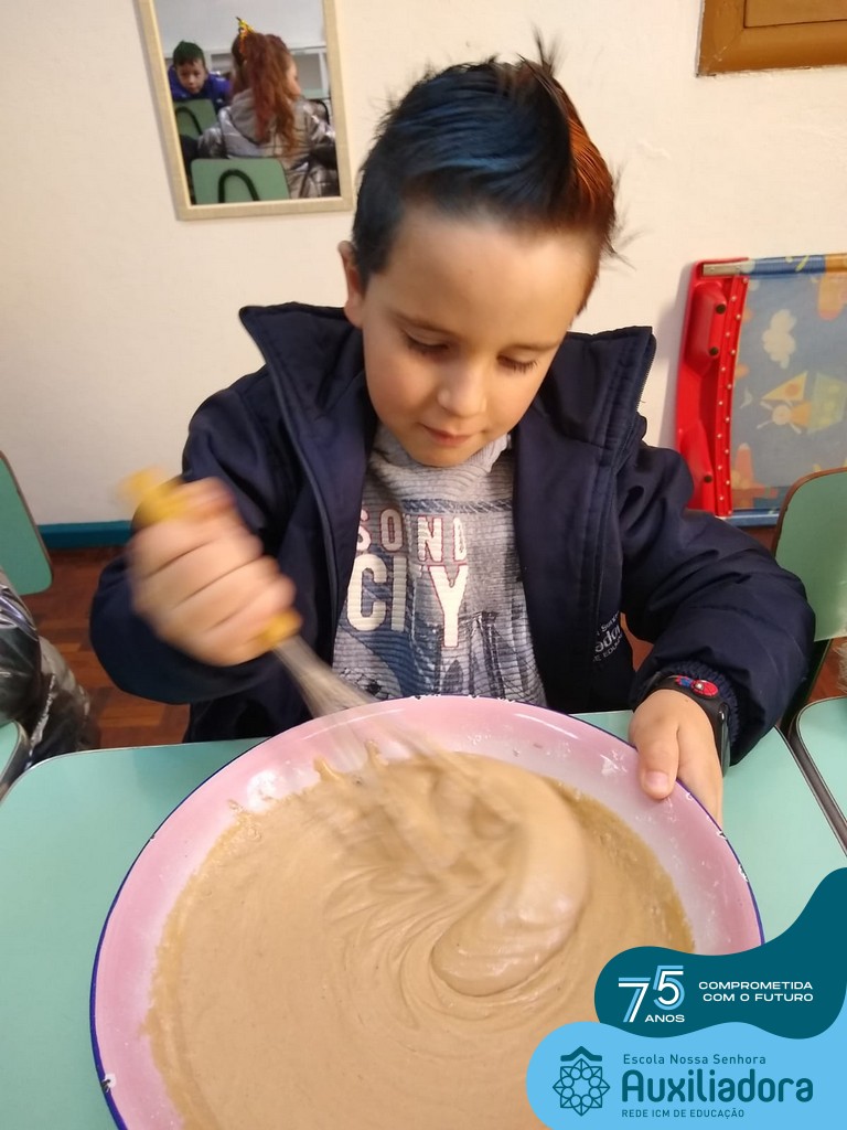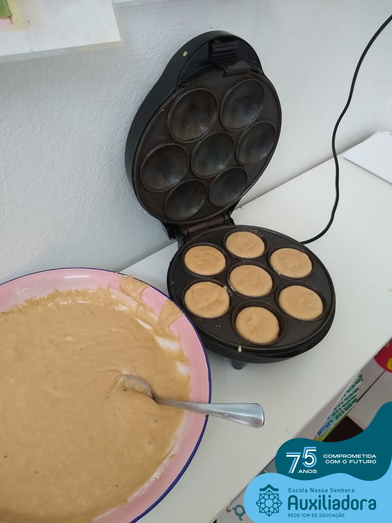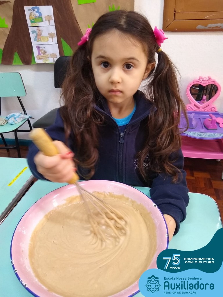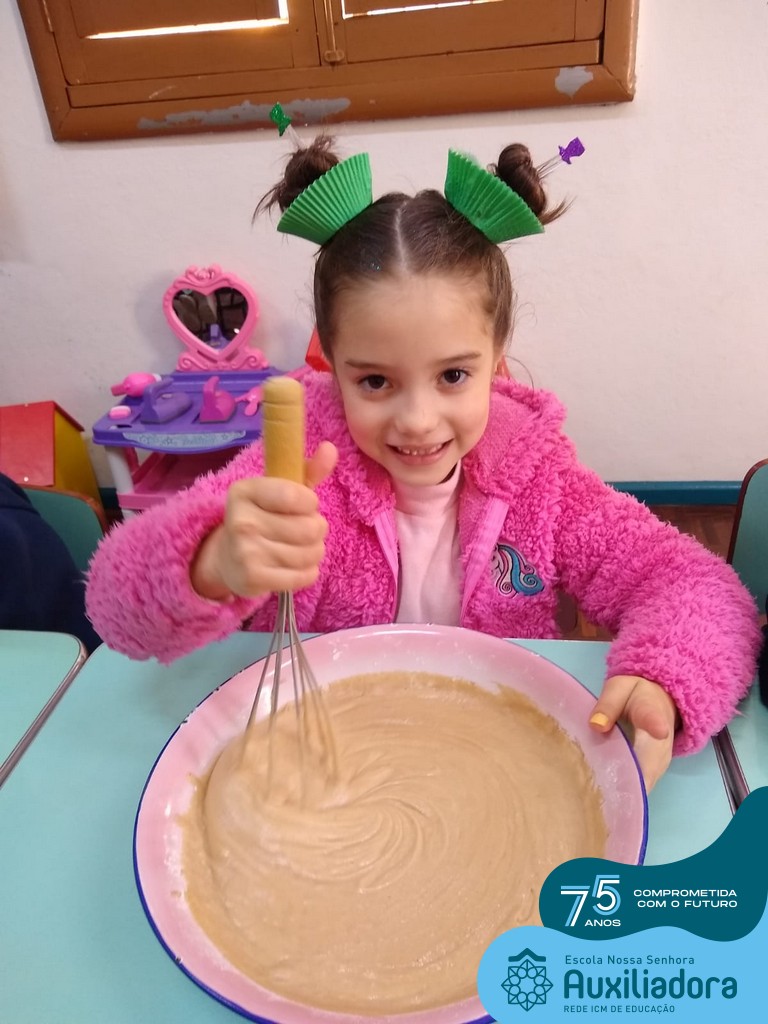 As turmas do Pré 2 realizaram a receita de cupcake de chocolate em comemoração ao aniversário da escola.
