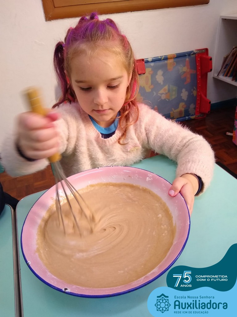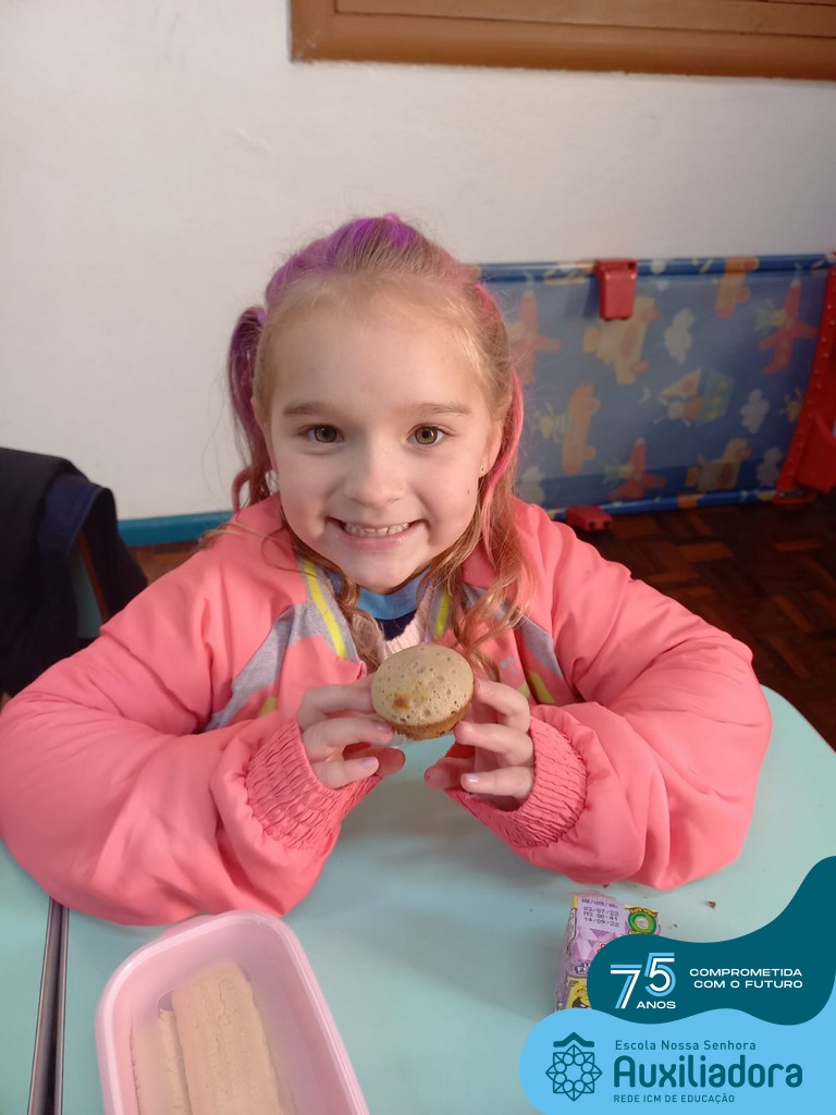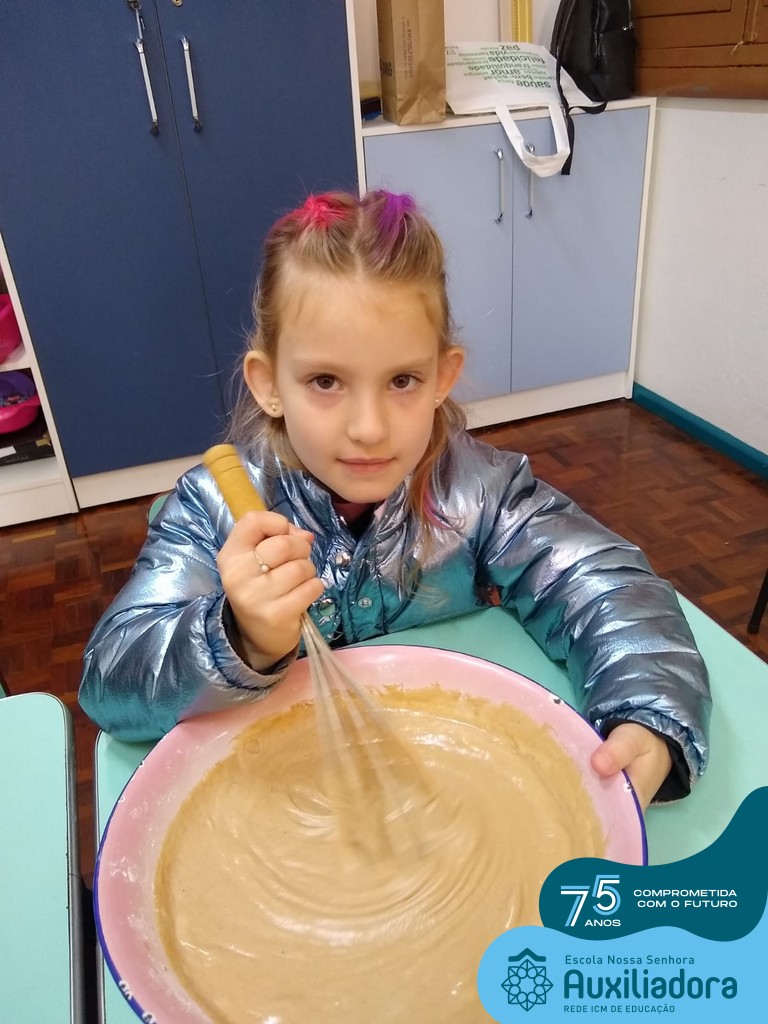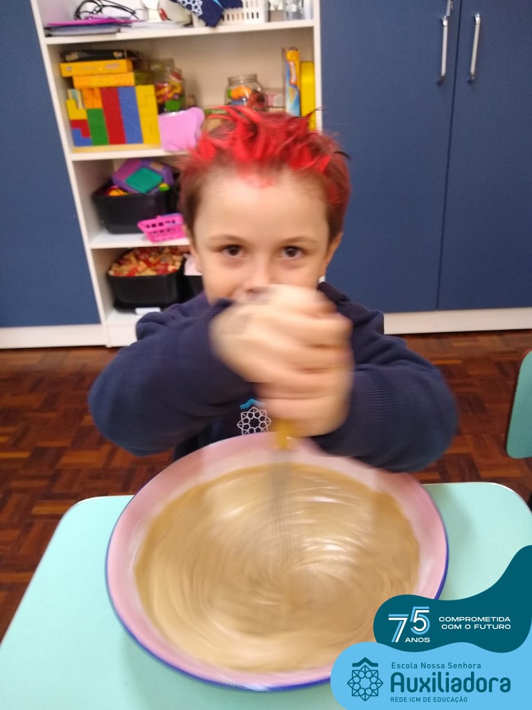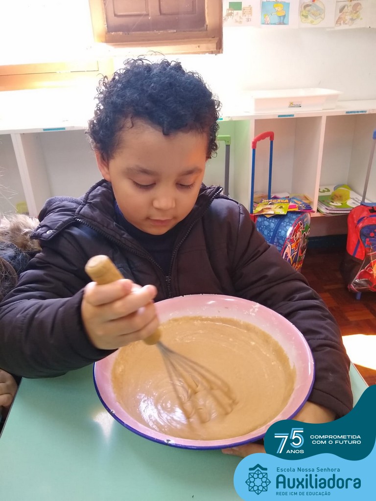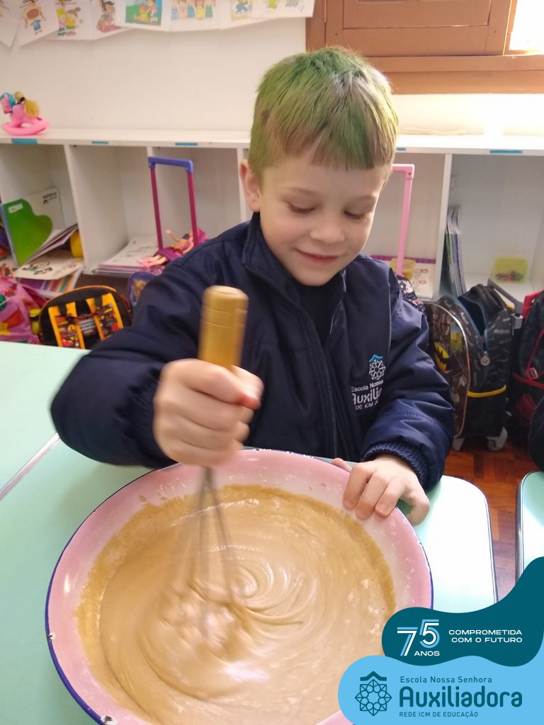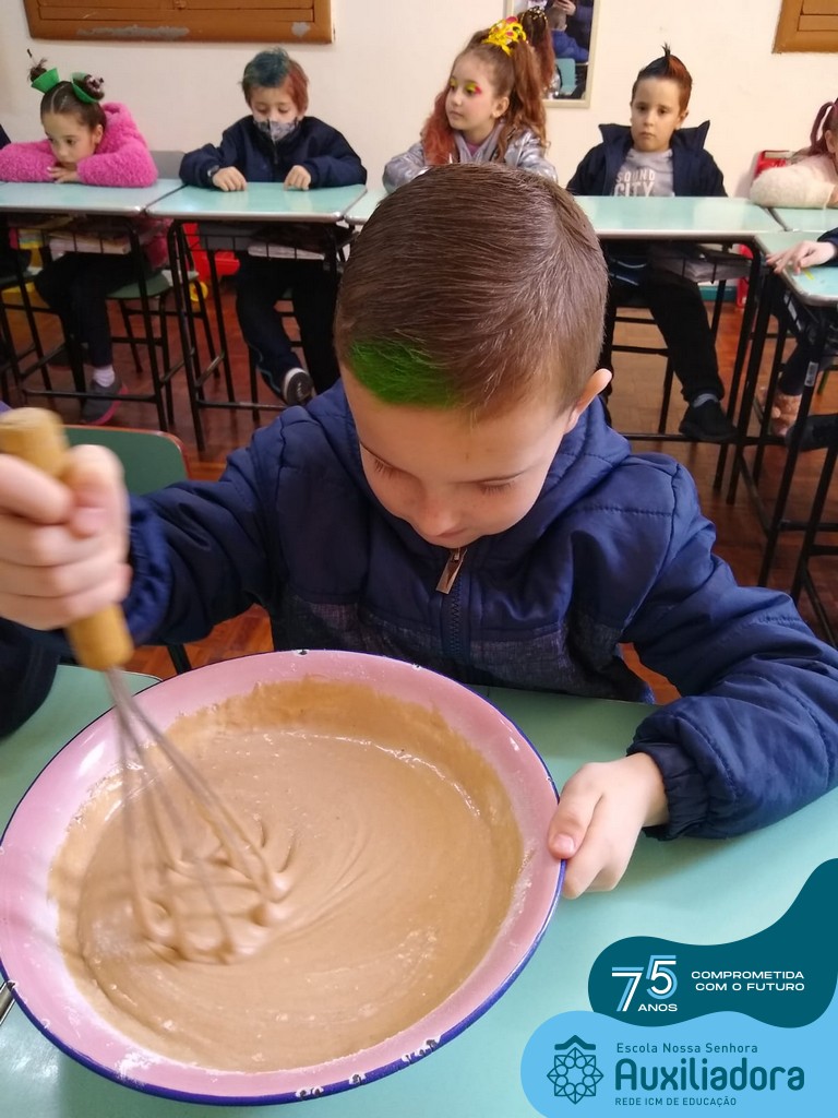 As turmas do Pré 2 realizaram a receita de cupcake de chocolate em comemoração ao aniversário da escola.