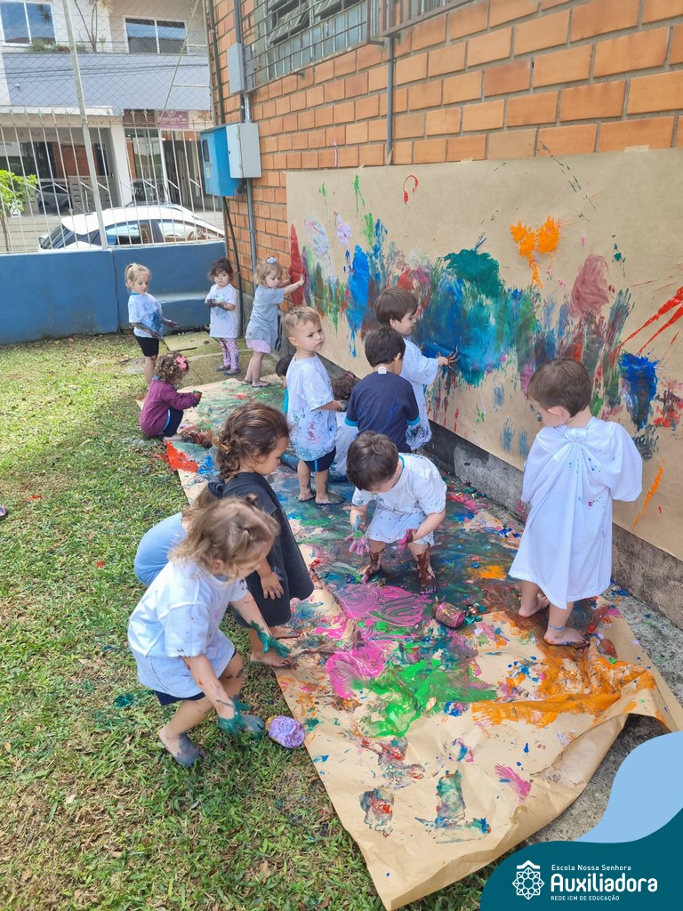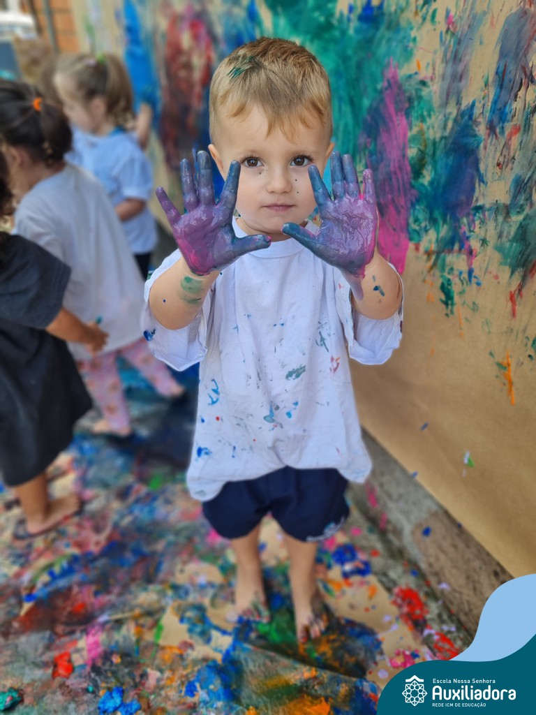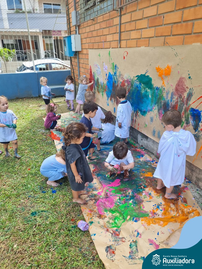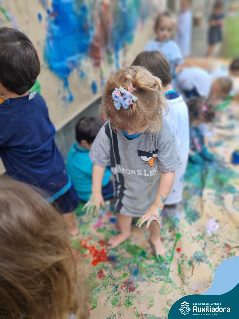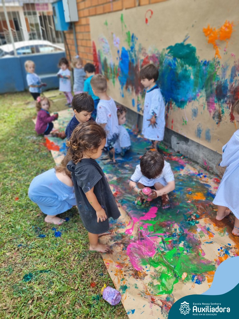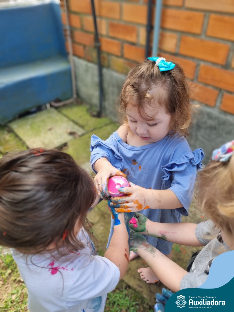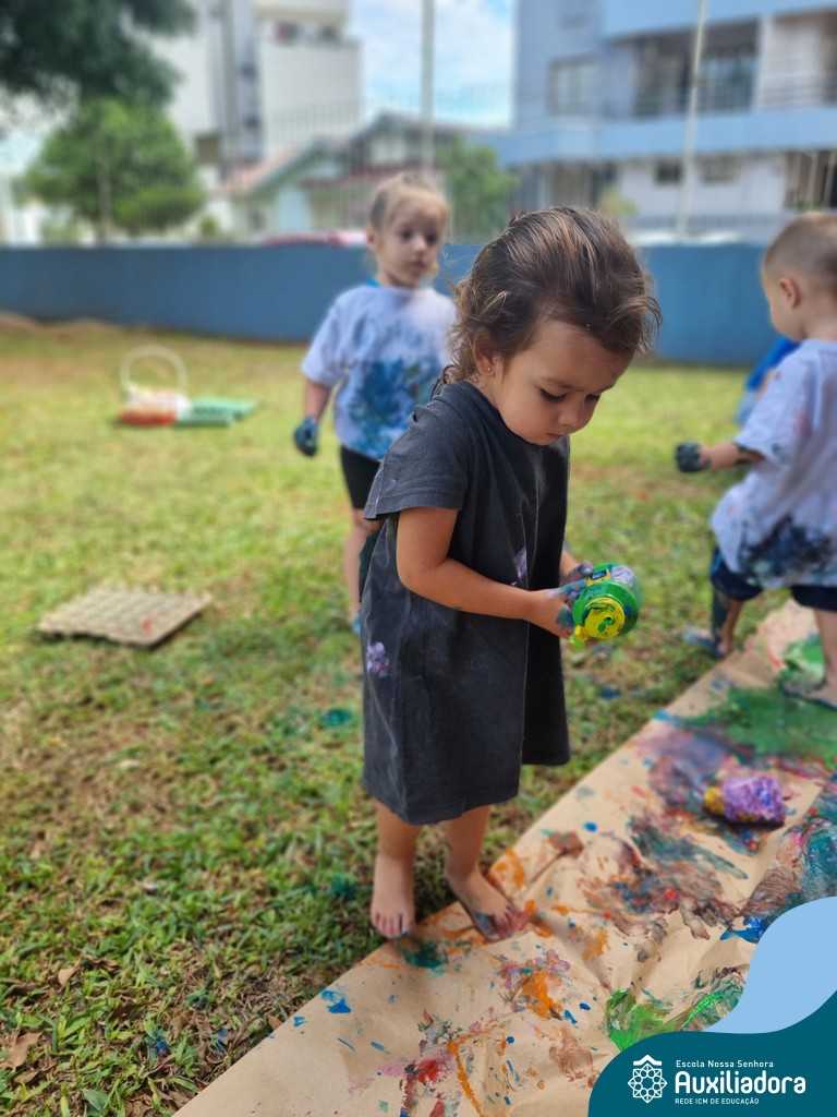 A atividade desenvolvida com as turmas de Maternal 1A e Maternal 1B proporcionou aos alunos a oportunidade de explorar a combinação de cores e padrões ao arremessar os ovos, promovendo a expressão artística. Ao arremessar os ovos, habilidades motoras finas e grossas foram aprimoradas, auxiliando no desenvolvimento físico das crianças. A integração das turmas promoveu a cooperação e a comunicação entre os pares, incentivando o trabalho em equipe.