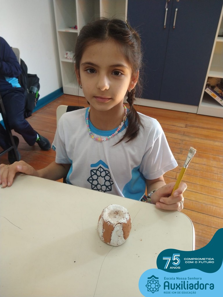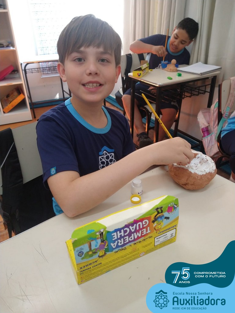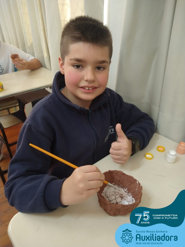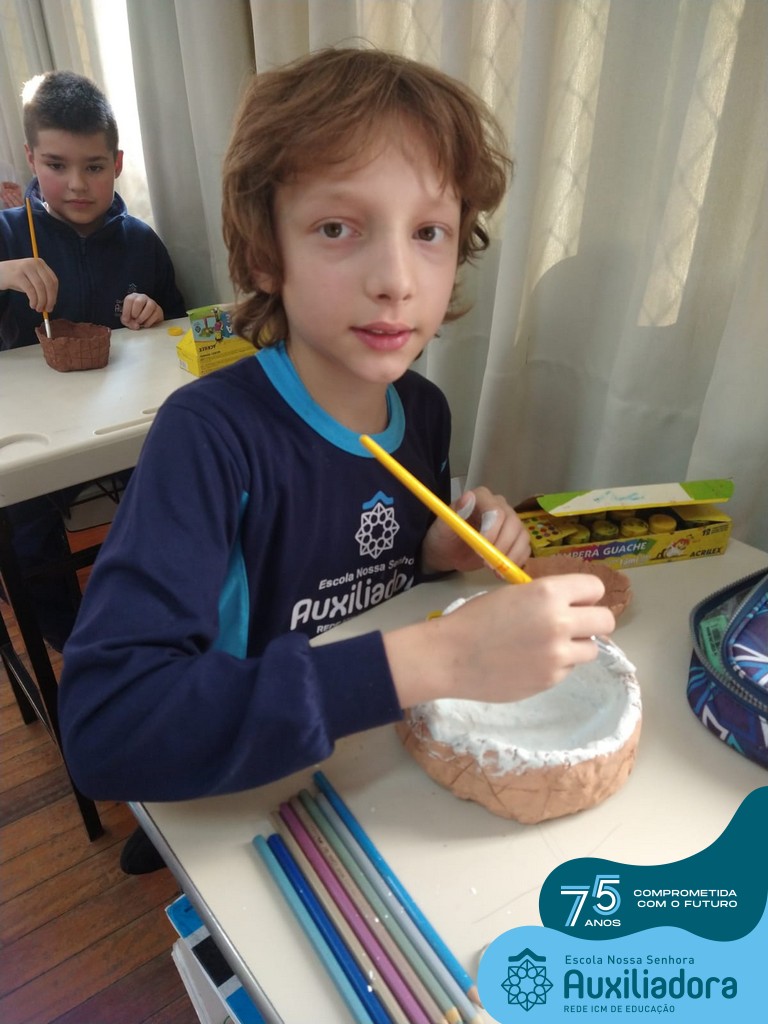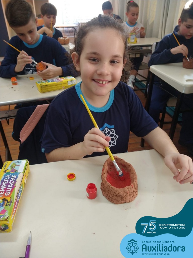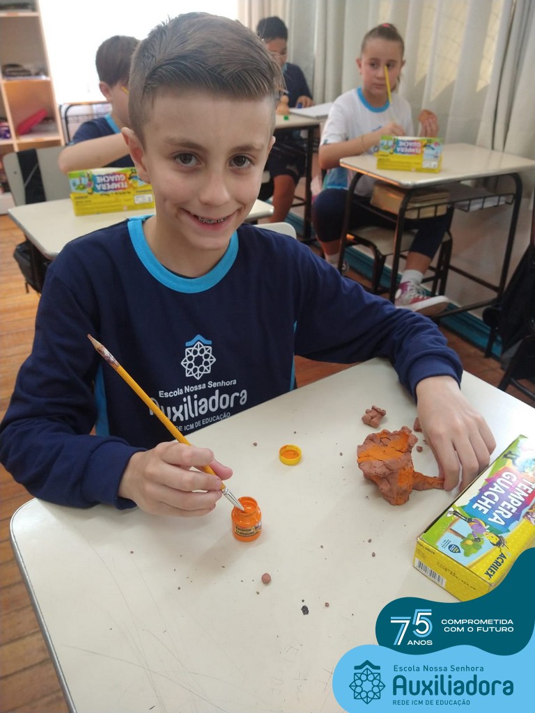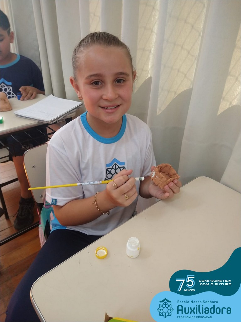Arte Marajoara: ao estudar a cultura indígena presente em território brasileiro os estudantes do 4º ano reproduziram, a partir do uso de argila, objetos da Arte Marajoara, que são traços da história cultural baseada na produção de um gênero de cerâmica que era desenvolvida por índios que moravam na ilha de Marajó.
