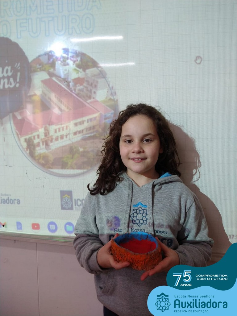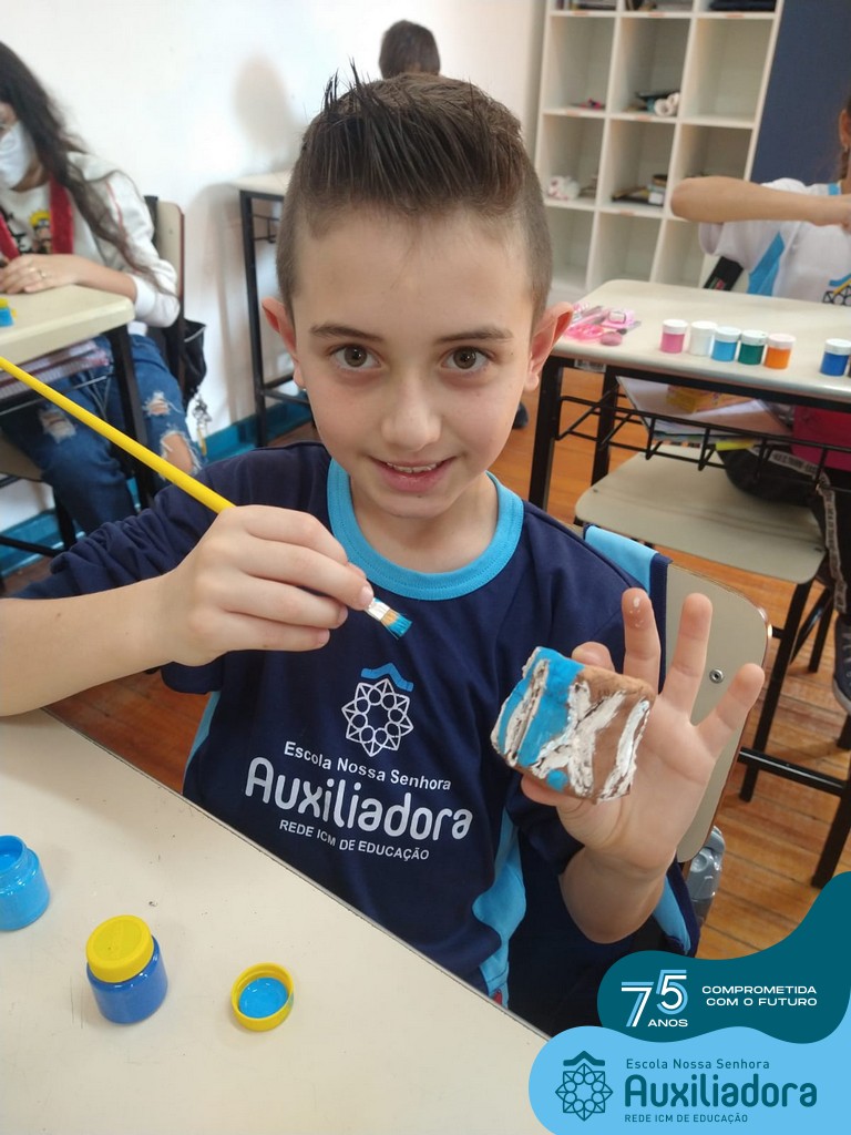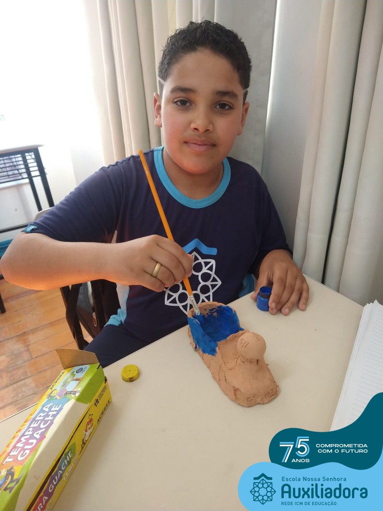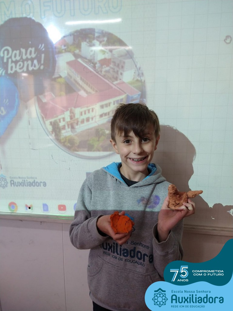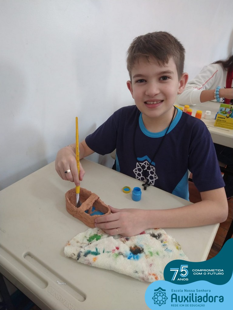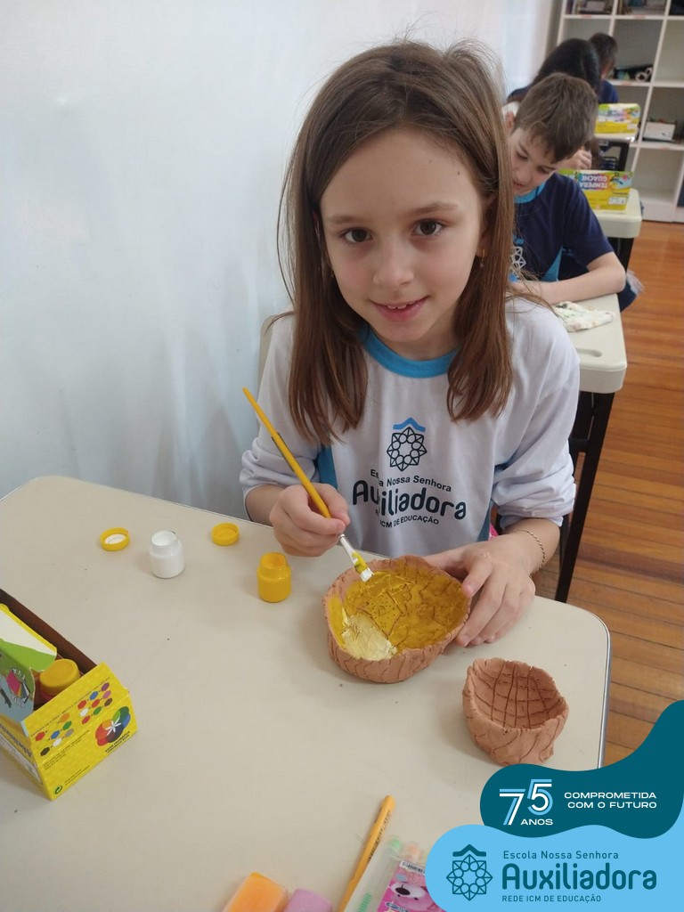 Arte Marajoara: ao estudar a cultura indígena presente em território brasileiro os estudantes do 4º ano reproduziram, a partir do uso de argila, objetos da Arte Marajoara, que são traços da história cultural baseada na produção de um gênero de cerâmica que era desenvolvida por índios que moravam na ilha de Marajó.