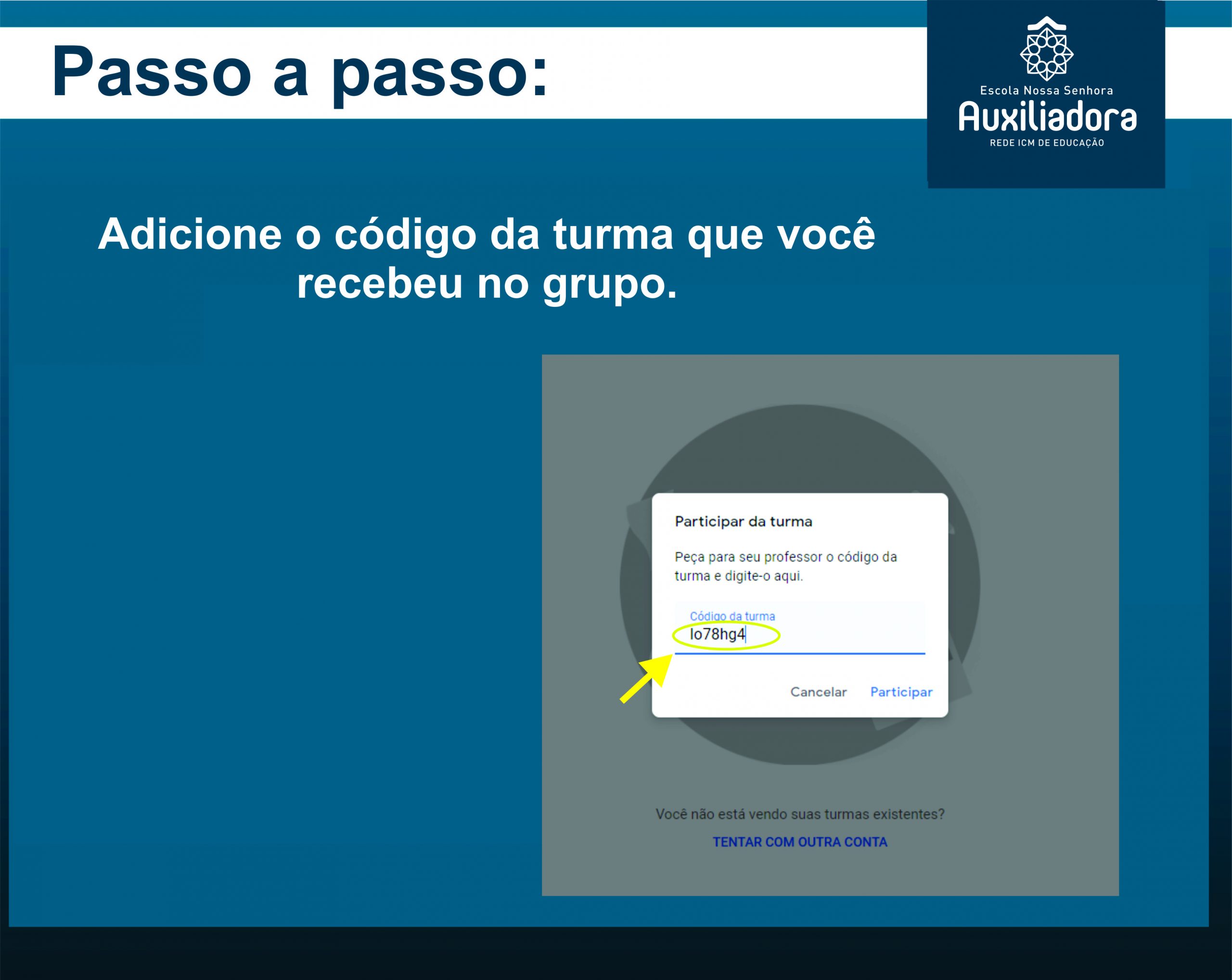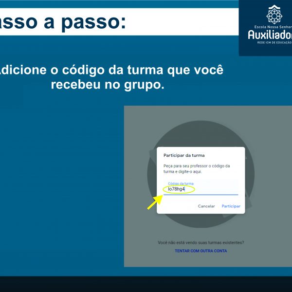 - Todos os alunos já foram inseridos nas turmas; portanto, não há necessidade de envio do código das mesmas. Basta que os alunos cliquem no ícone “Participar” para aceitar o convite da professora.