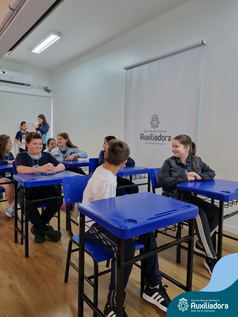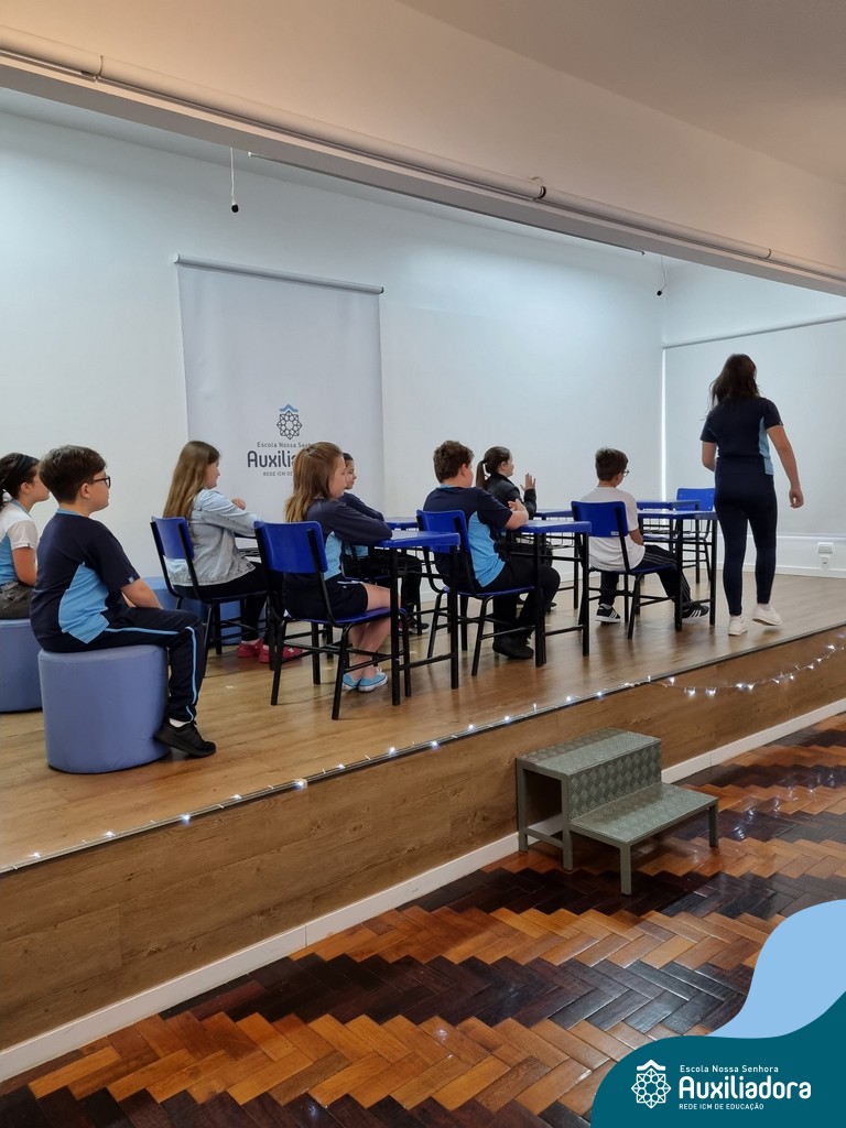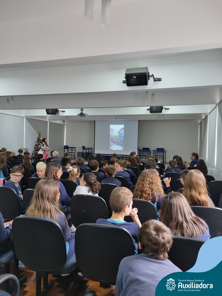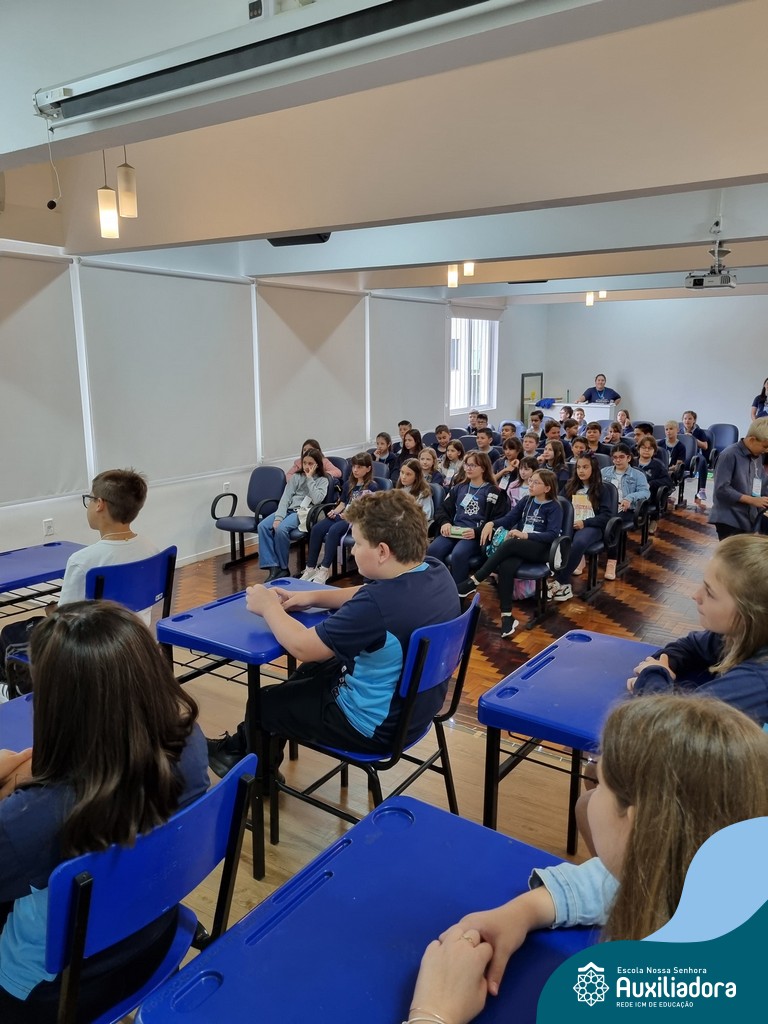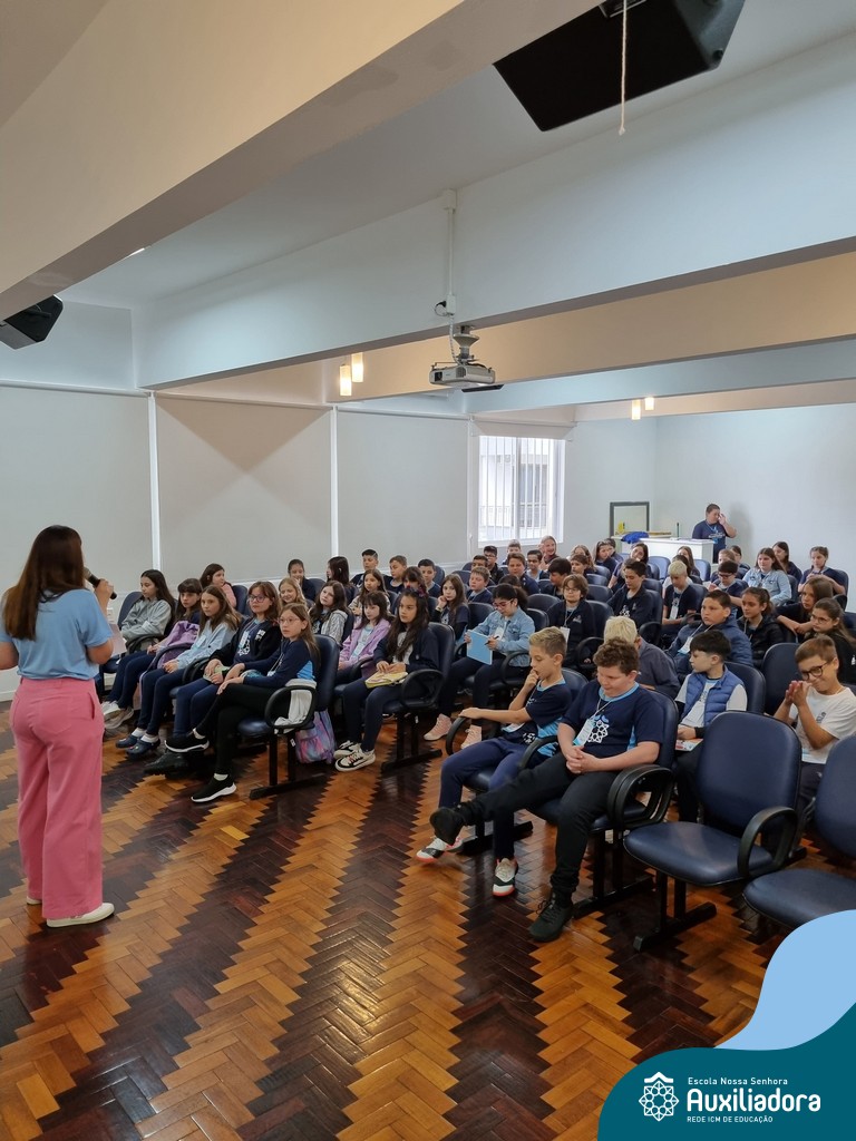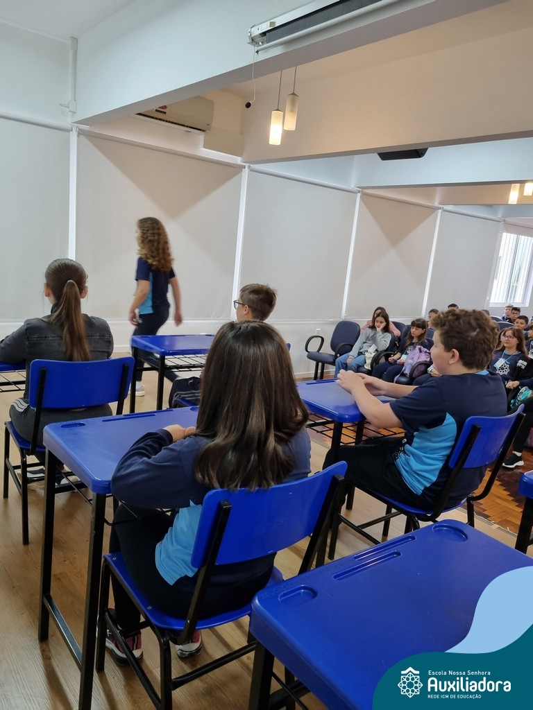 Realizada no auditório da escola, a atividade incluiu momentos de aprendizado dinâmico, onde os estudantes mais velhos compartilharam seus conhecimentos de forma educativa e divertida.