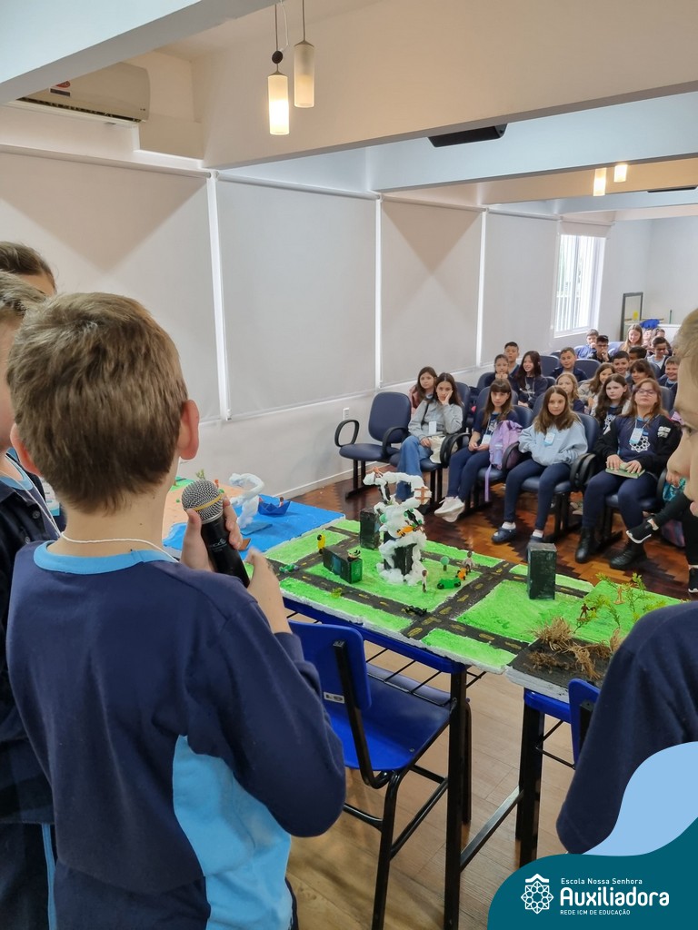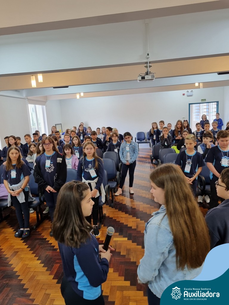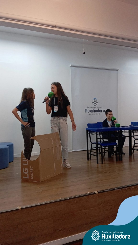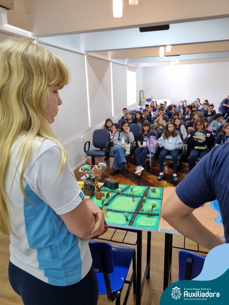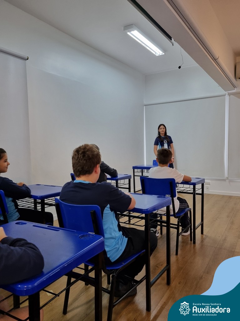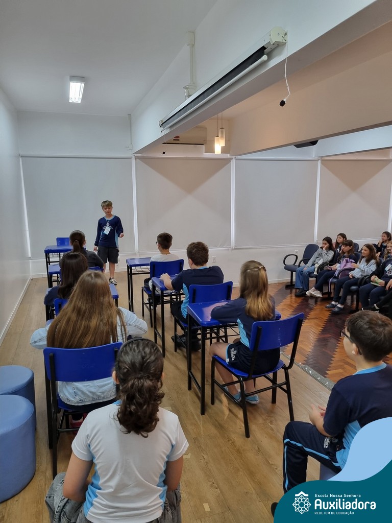 Realizada no auditório da escola, a atividade incluiu momentos de aprendizado dinâmico, onde os estudantes mais velhos compartilharam seus conhecimentos de forma educativa e divertida.
