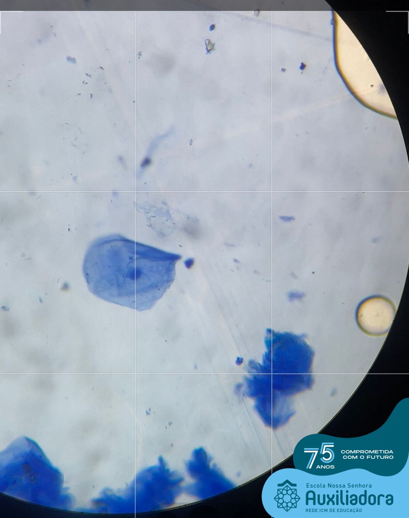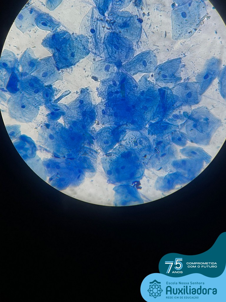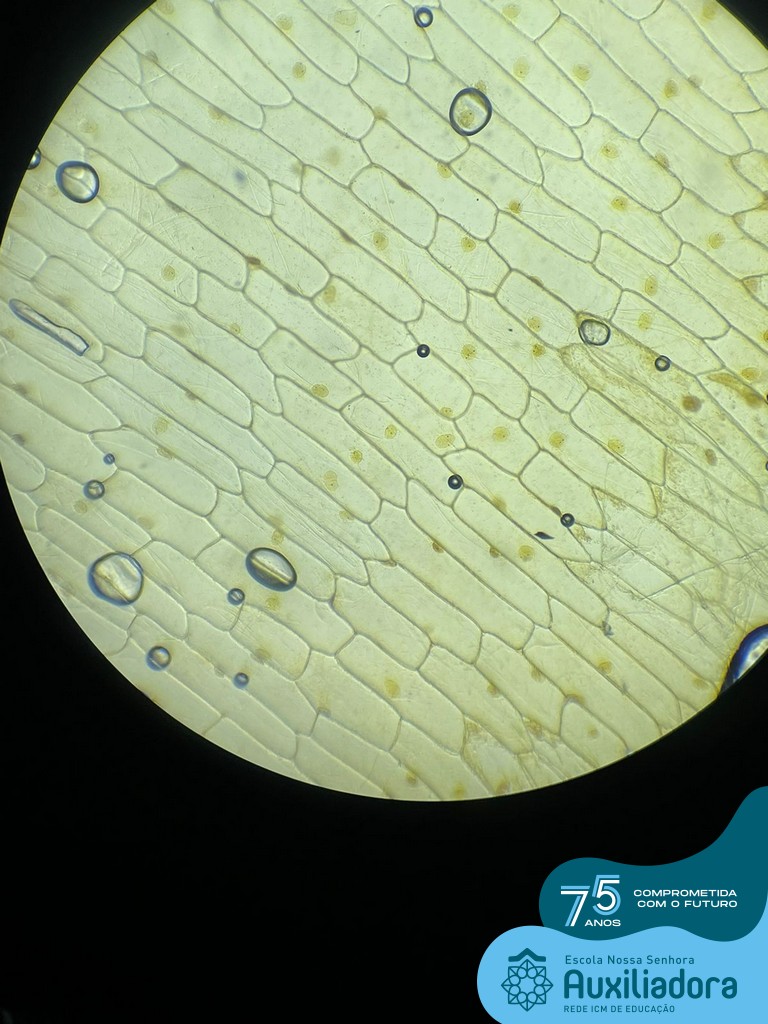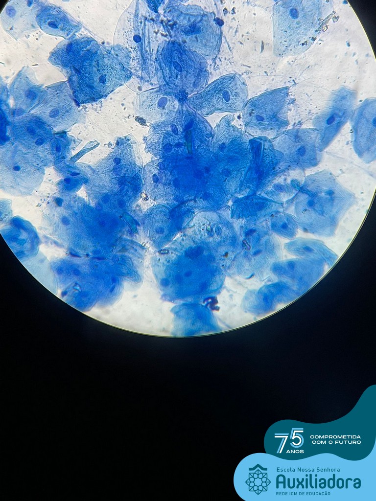 A nossa ancestralidade em relação ao reino vegetal, são as células. Claro que, células vegetais são diferentes de células animais, no que tangem a presença de organelas que realizam a fotossíntese, isto é, plantas produzem seu próprio alimento, sendo autotróficas. Nós, animais, somos heterotróficos, buscamos a fonte de energia necessária na respiração e na alimentação. Com o objetivo de observar as diferenças de células eucariontes animais e vegetais, os 8ºs anos realizaram aula prática de visualização celular. Com a técnica de raspado da bochecha, coletamos células animais, e com uma película da cebola, visualizamos as células vegetais. Os vegetais possuem cloroplastos, responsáveis pela obtenção de energia do sol para a fotossíntese, além do formato retangular. Já as células animais, são mais arredondadas, e não possuem cloroplastos.