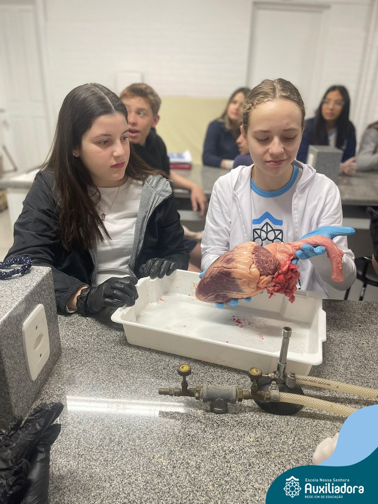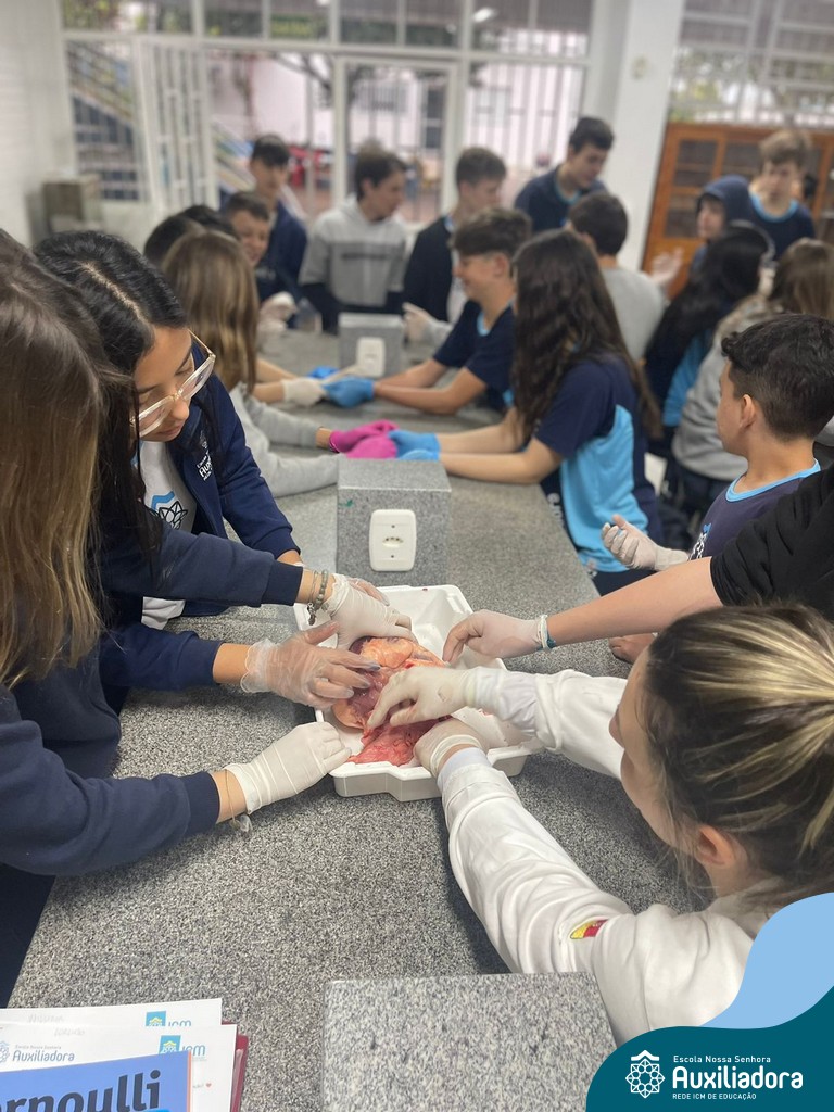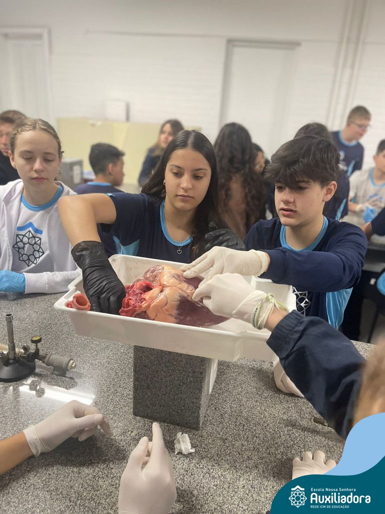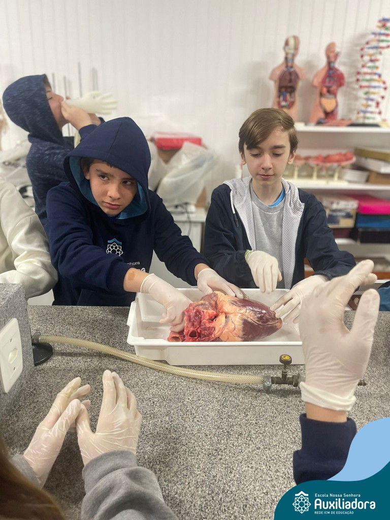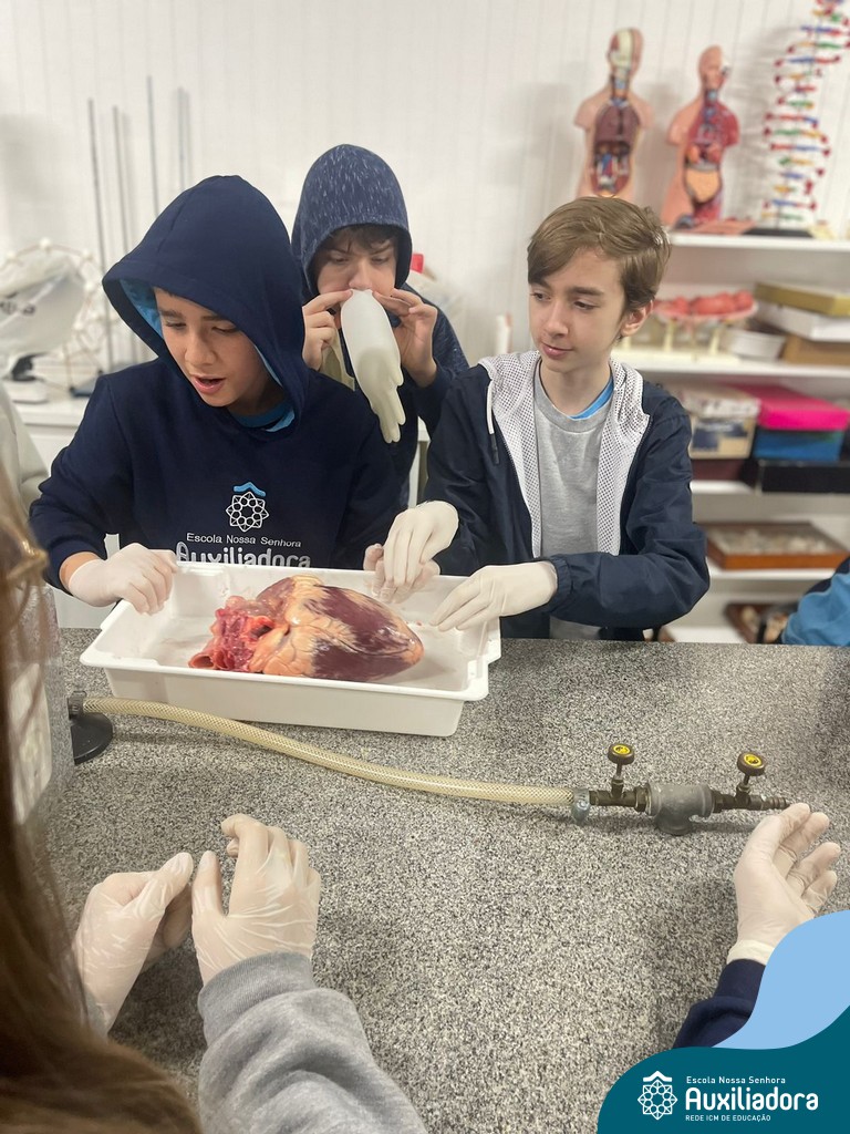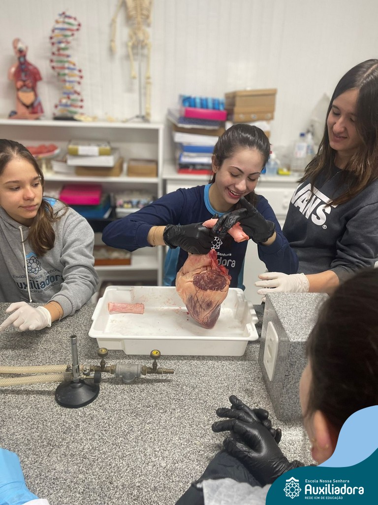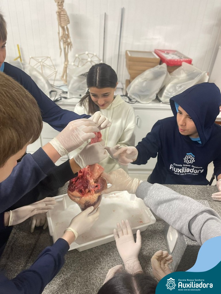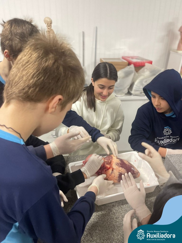 A aula prática é sempre uma experiência que desenvolve aptidões e conexões com a teoria estudada. Neste sentido, os 8ºs anos realizaram observação e manuseio de um coração bovino, que tem muitas semelhanças com o coração humano. Conhecendo a fisiologia e a organização da bomba que é responsável pela distribuição do sangue, em todo o ser vivo, puderam aprender que cada espécie tem suas particularidades. O coração deve ser cuidado! Bons alimentos, exercícios físicos, bom sono e também, exames médicos periódicos, são essenciais!