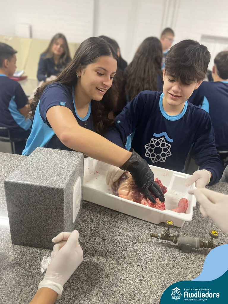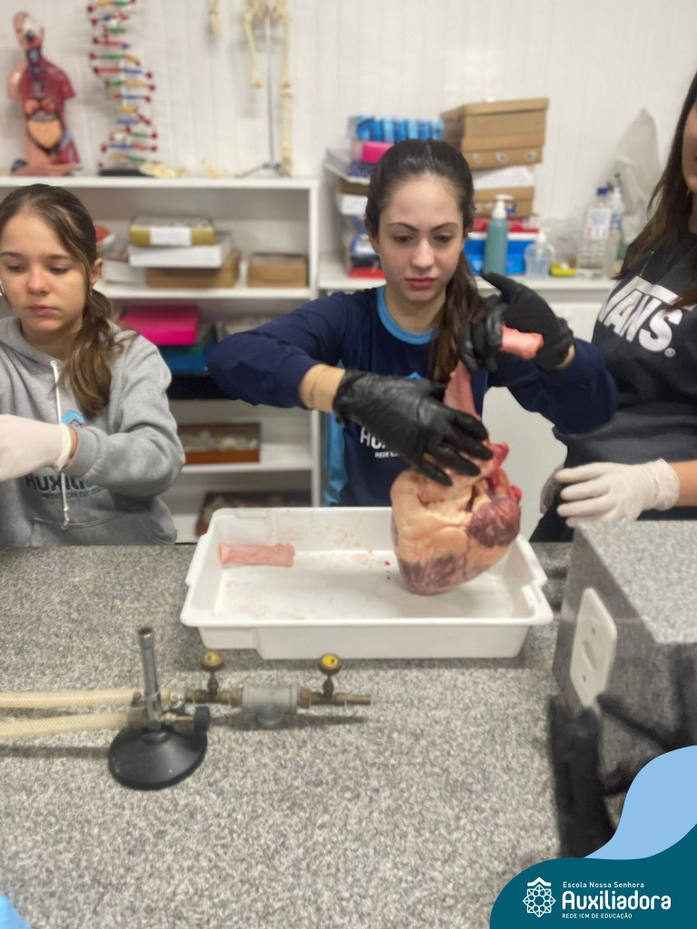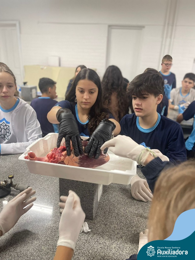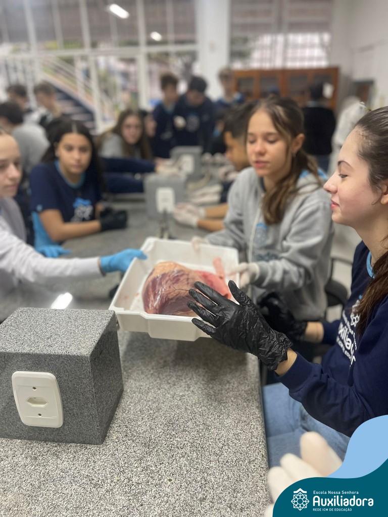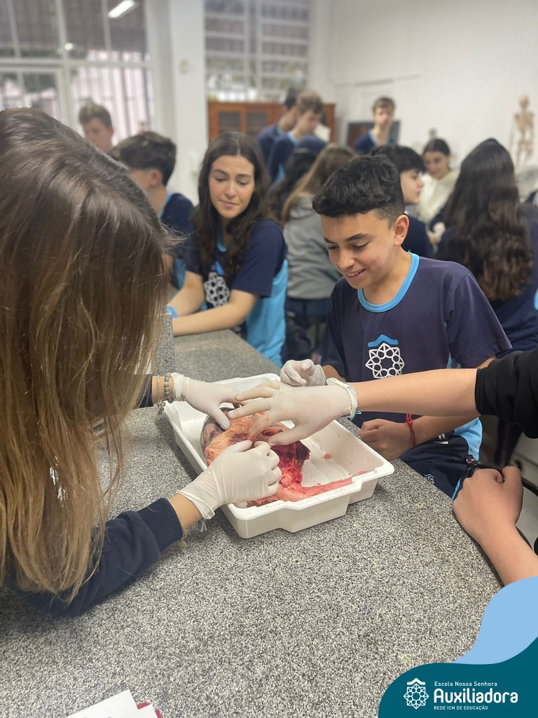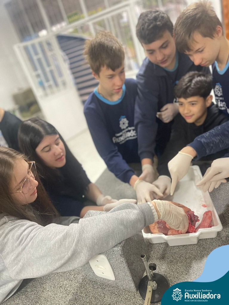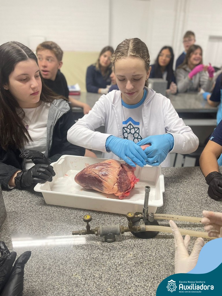 A aula prática é sempre uma experiência que desenvolve aptidões e conexões com a teoria estudada. Neste sentido, os 8ºs anos realizaram observação e manuseio de um coração bovino, que tem muitas semelhanças com o coração humano. Conhecendo a fisiologia e a organização da bomba que é responsável pela distribuição do sangue, em todo o ser vivo, puderam aprender que cada espécie tem suas particularidades. O coração deve ser cuidado! Bons alimentos, exercícios físicos, bom sono e também, exames médicos periódicos, são essenciais!