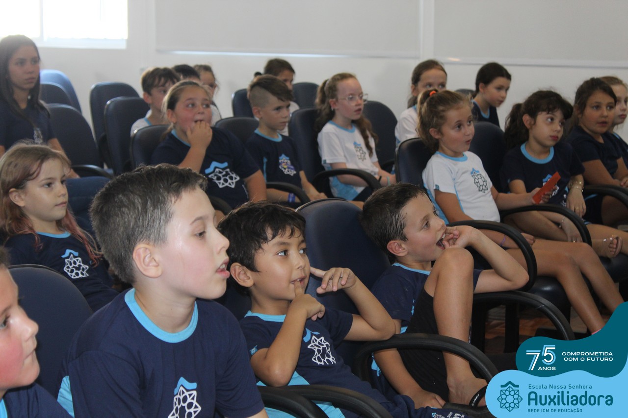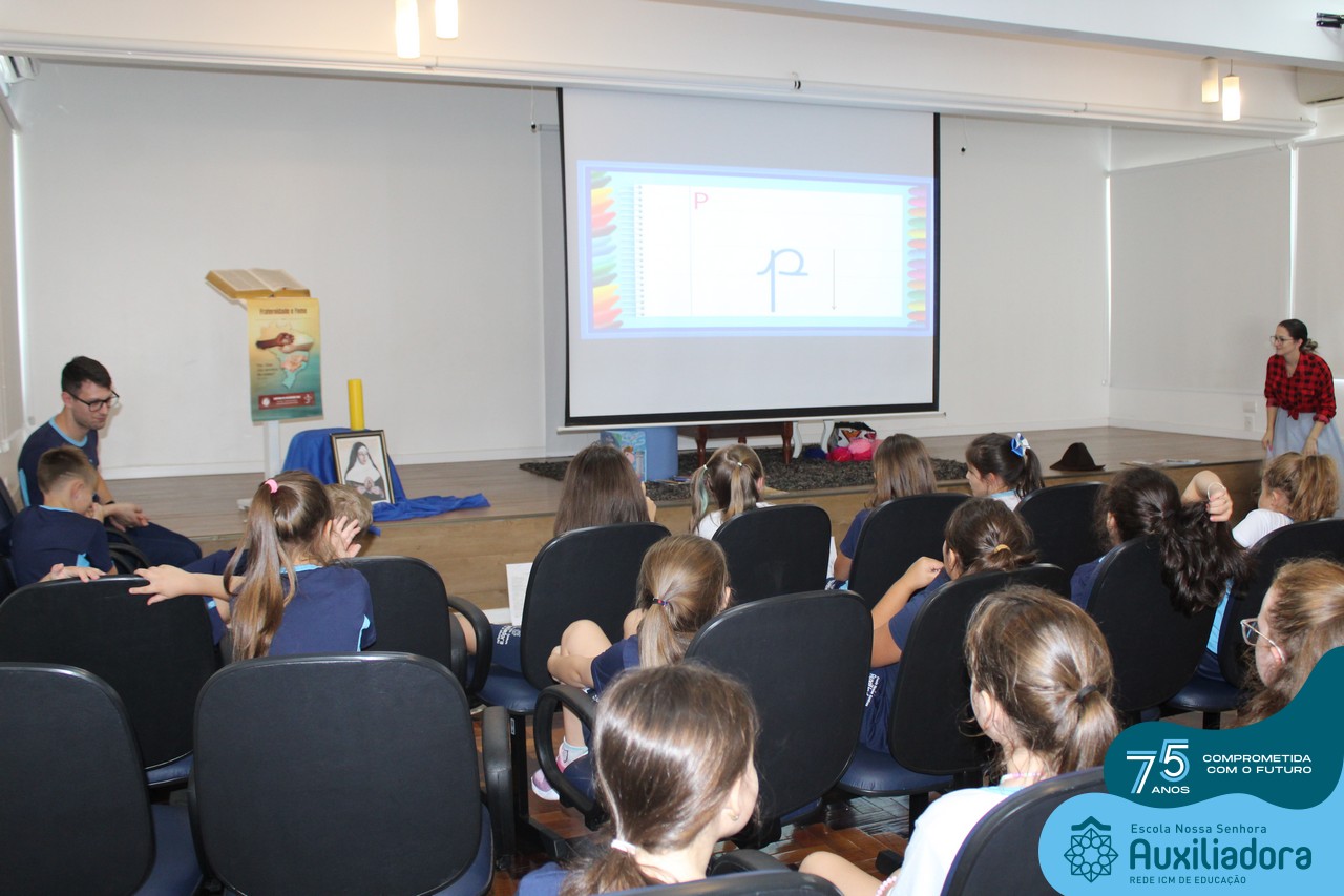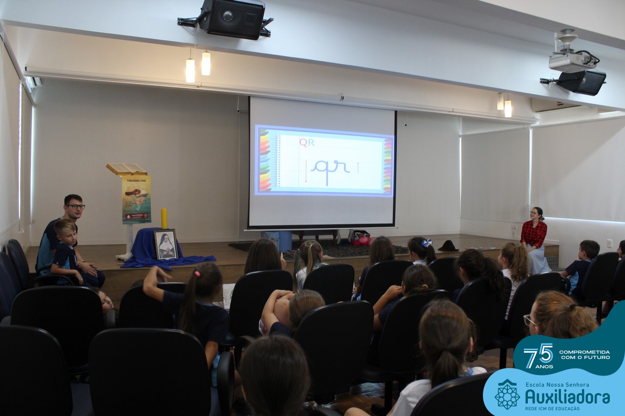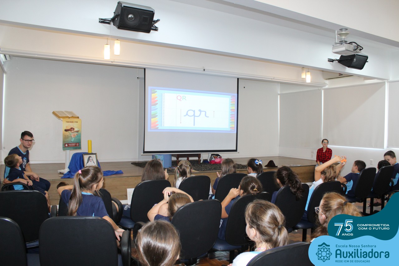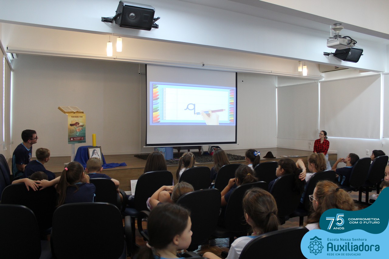 As turmas reuniram-se no auditório da escola para prestigiar a história A CALIGRAFIA DE DONA SOFIA, do autor André Neves. Através do enredo, as crianças encantaram-se com os personagens e aumentaram, ainda mais, a expectativa pela leitura e escrita cursiva, ouvindo as dicas e segredos de escrever bem.