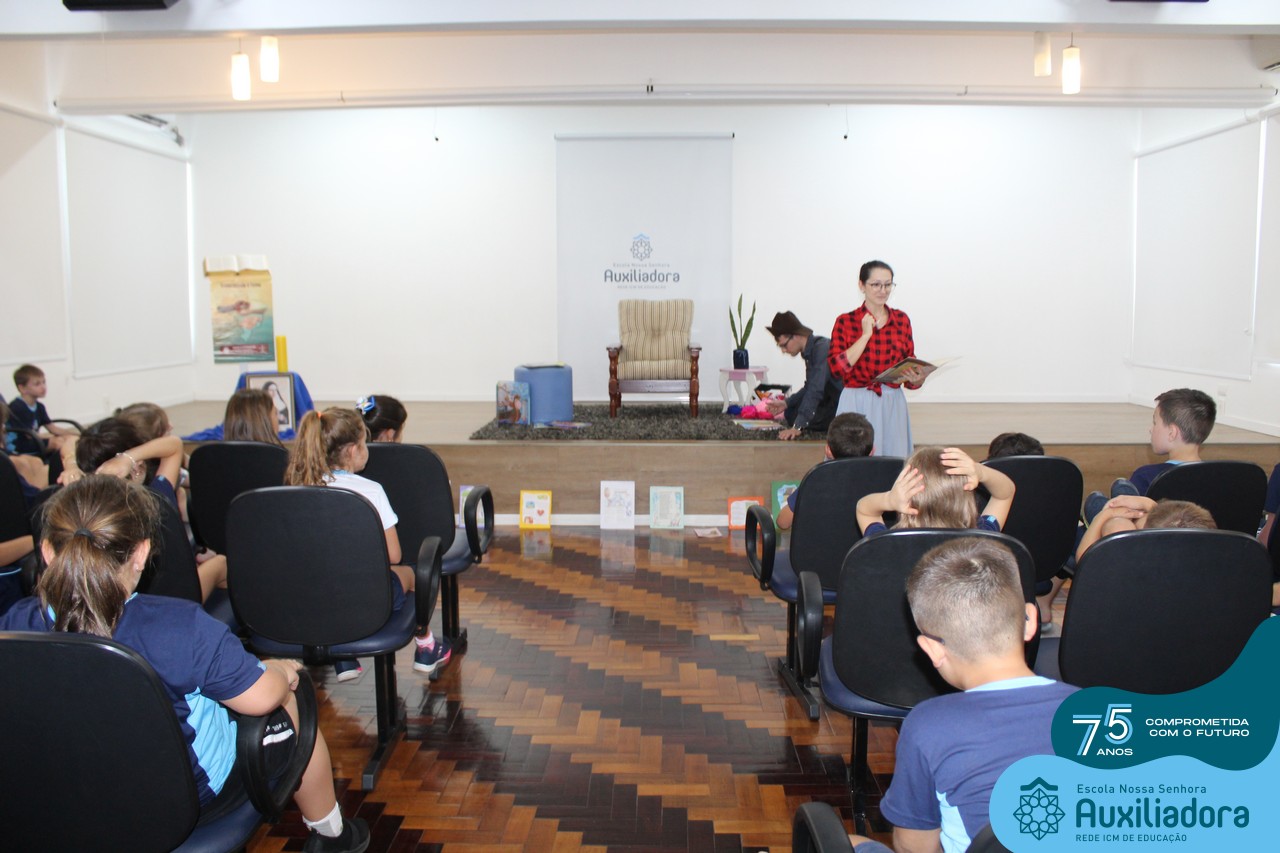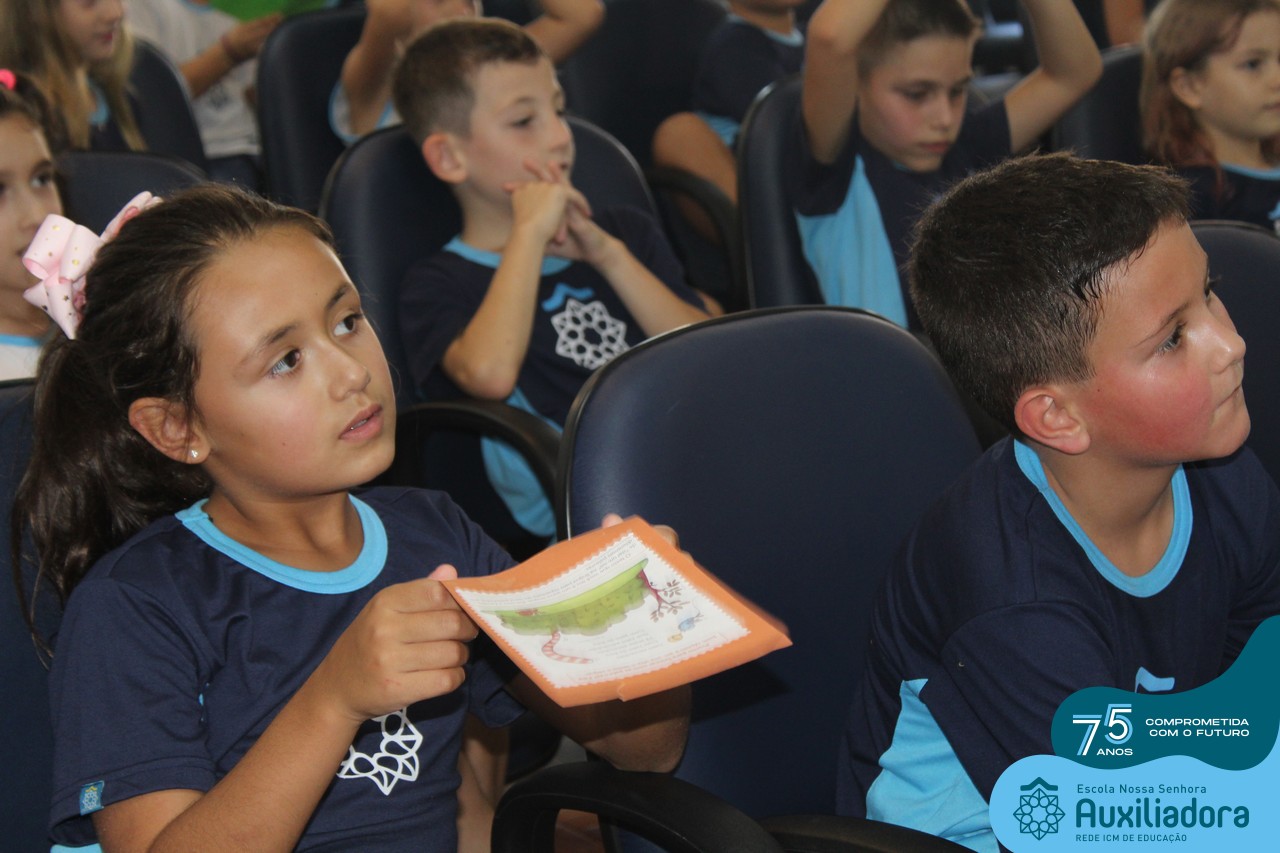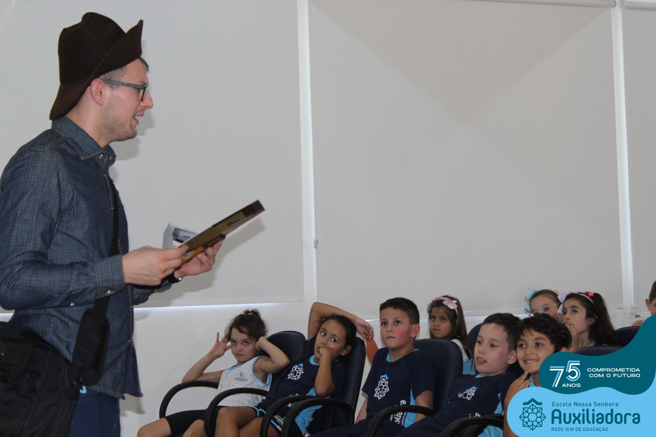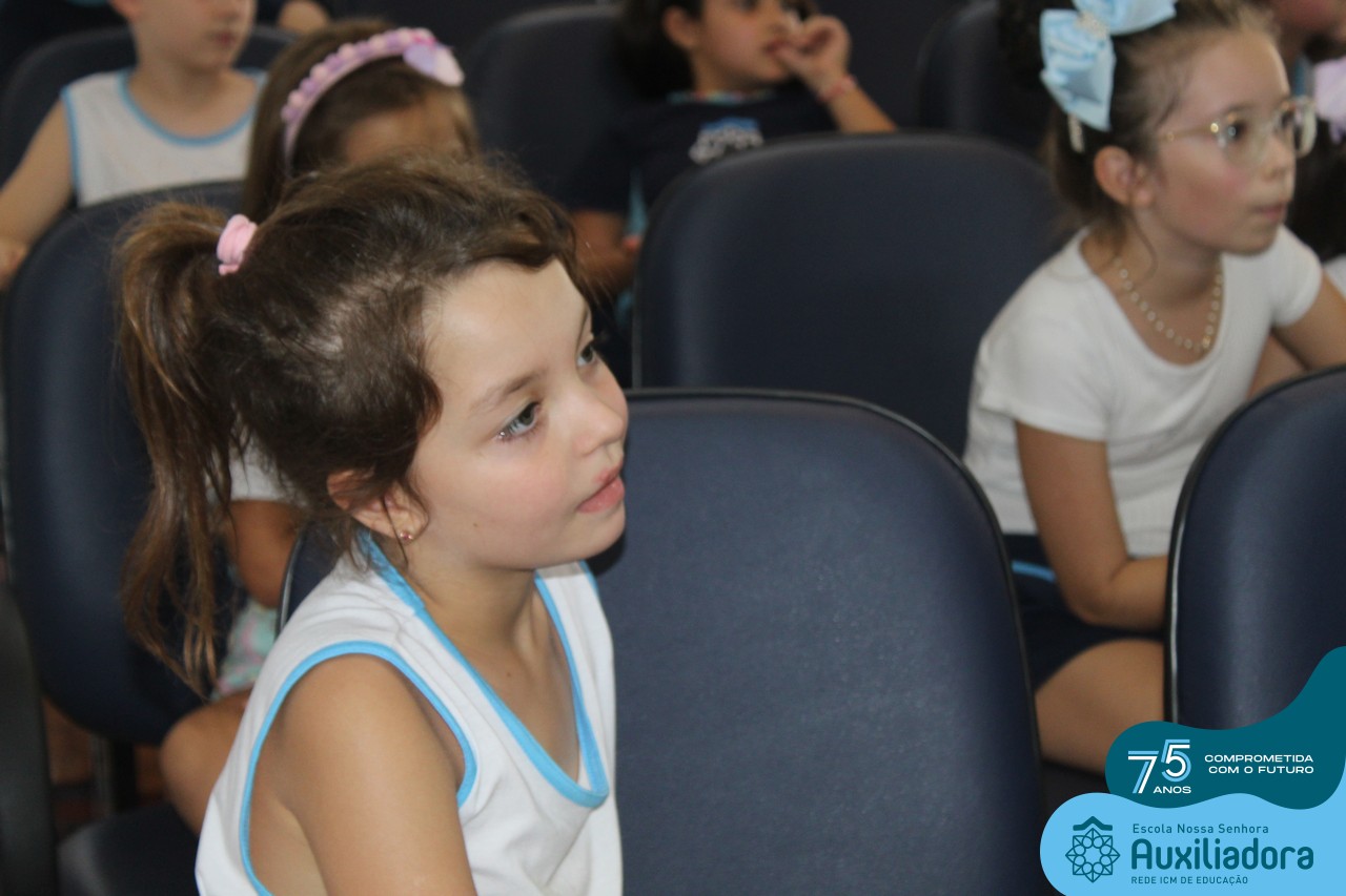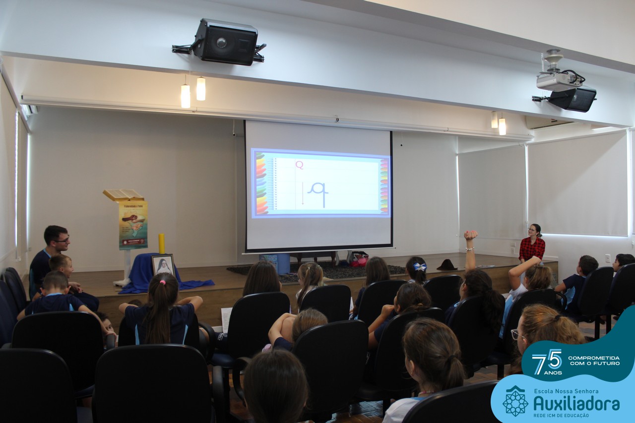 As turmas reuniram-se no auditório da escola para prestigiar a história A CALIGRAFIA DE DONA SOFIA, do autor André Neves. Através do enredo, as crianças encantaram-se com os personagens e aumentaram, ainda mais, a expectativa pela leitura e escrita cursiva, ouvindo as dicas e segredos de escrever bem.