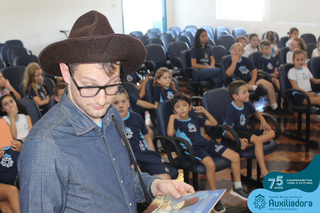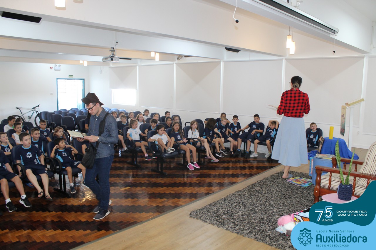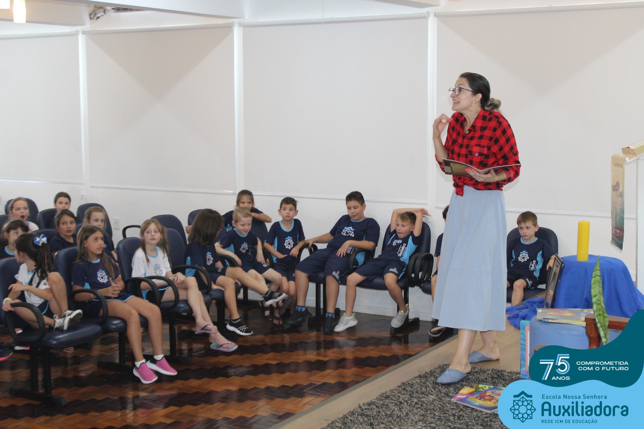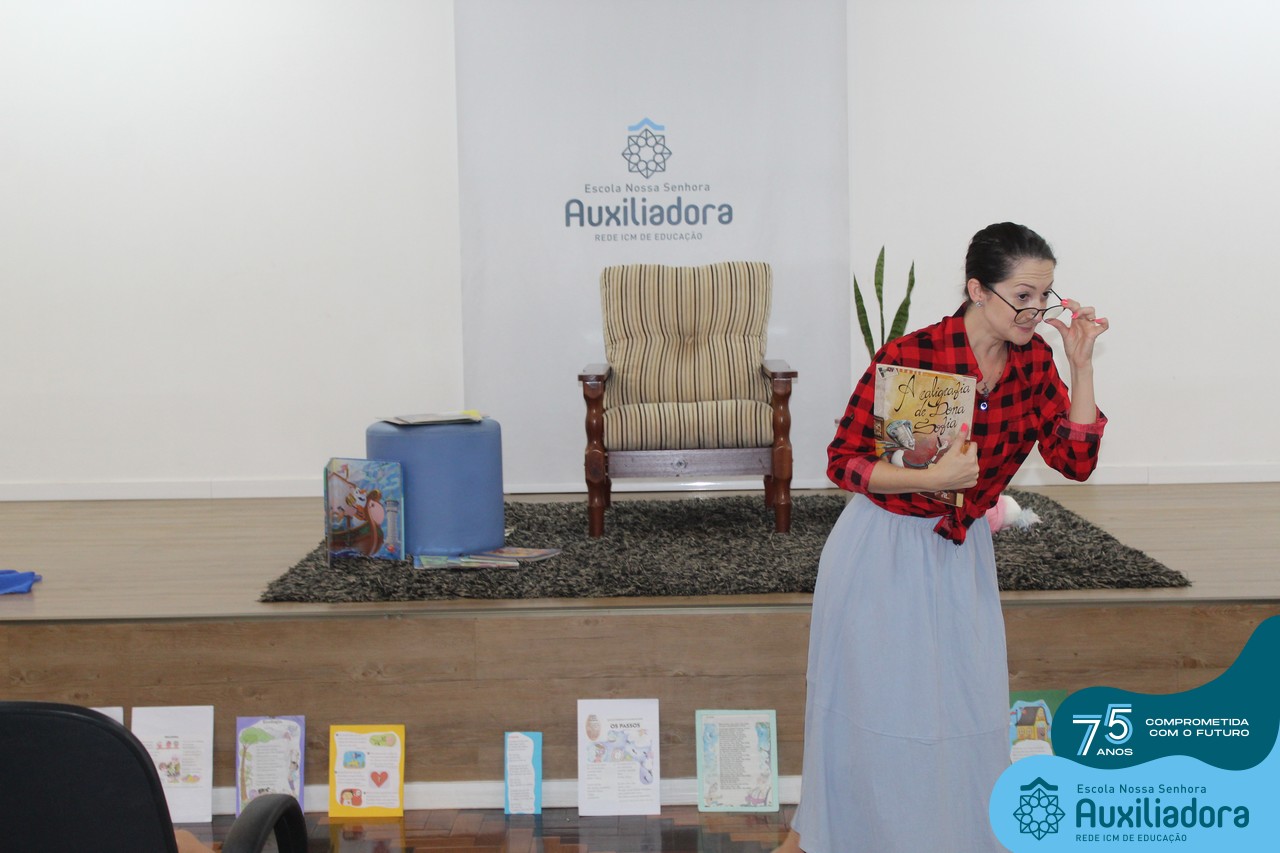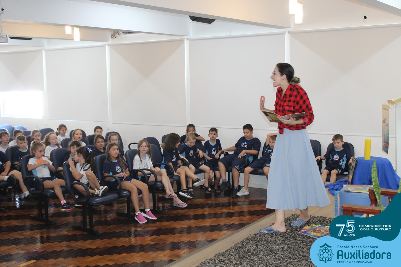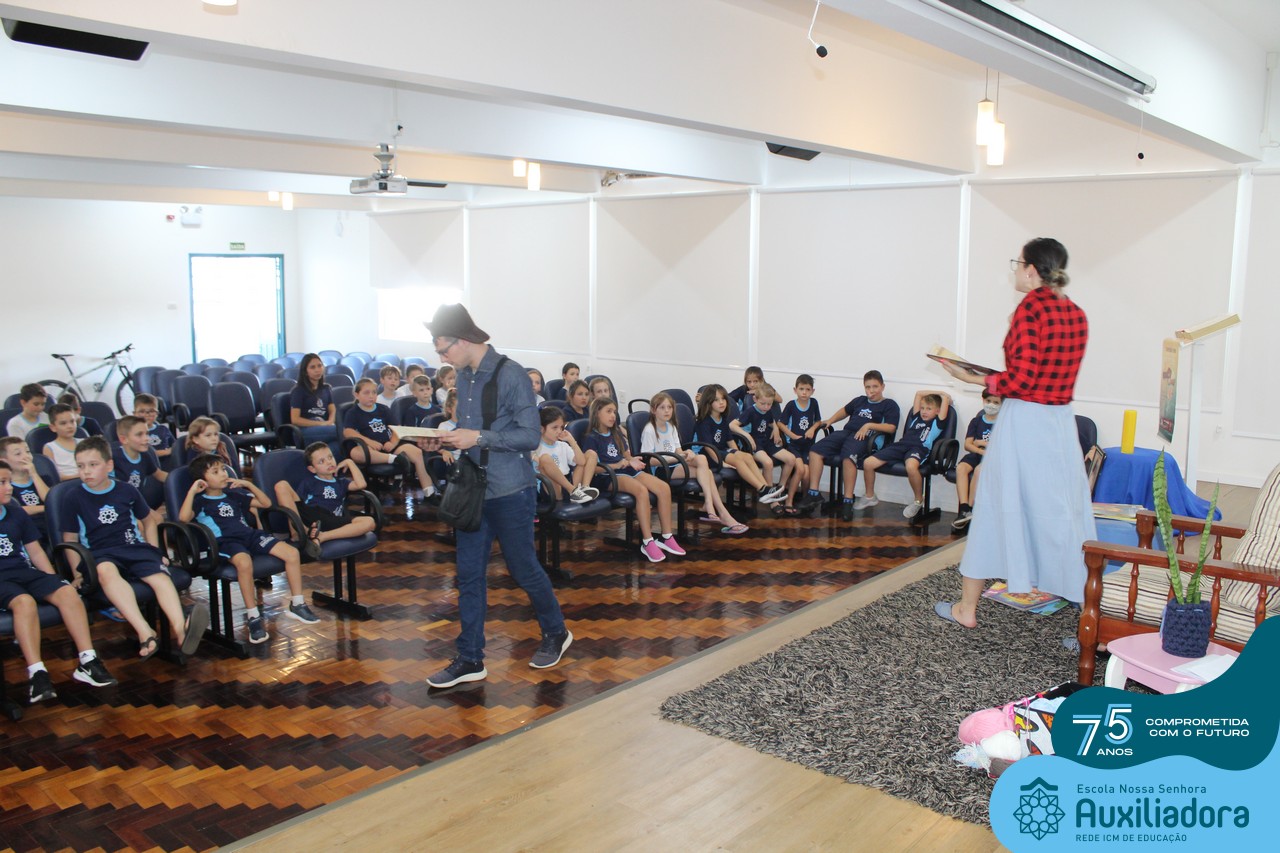 As turmas reuniram-se no auditório da escola para prestigiar a história A CALIGRAFIA DE DONA SOFIA, do autor André Neves. Através do enredo, as crianças encantaram-se com os personagens e aumentaram, ainda mais, a expectativa pela leitura e escrita cursiva, ouvindo as dicas e segredos de escrever bem.