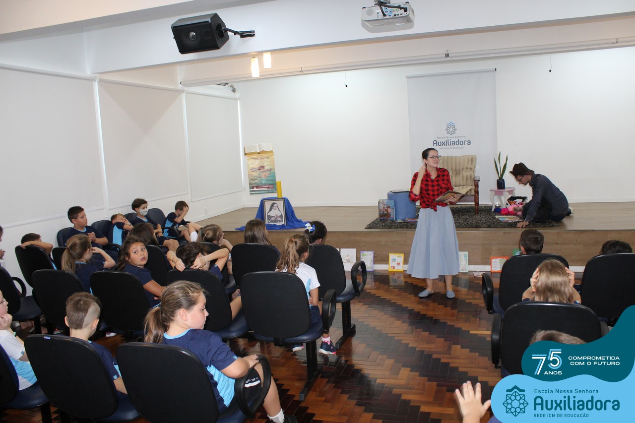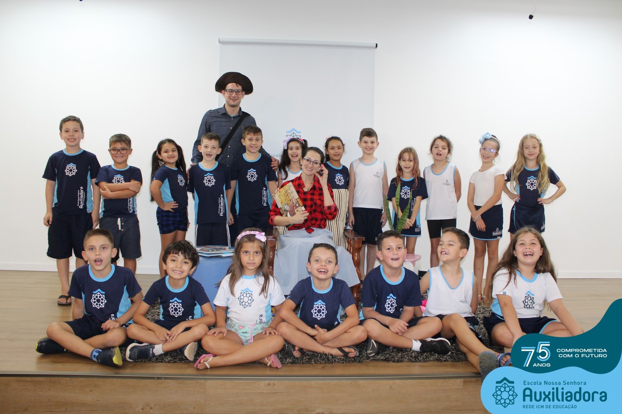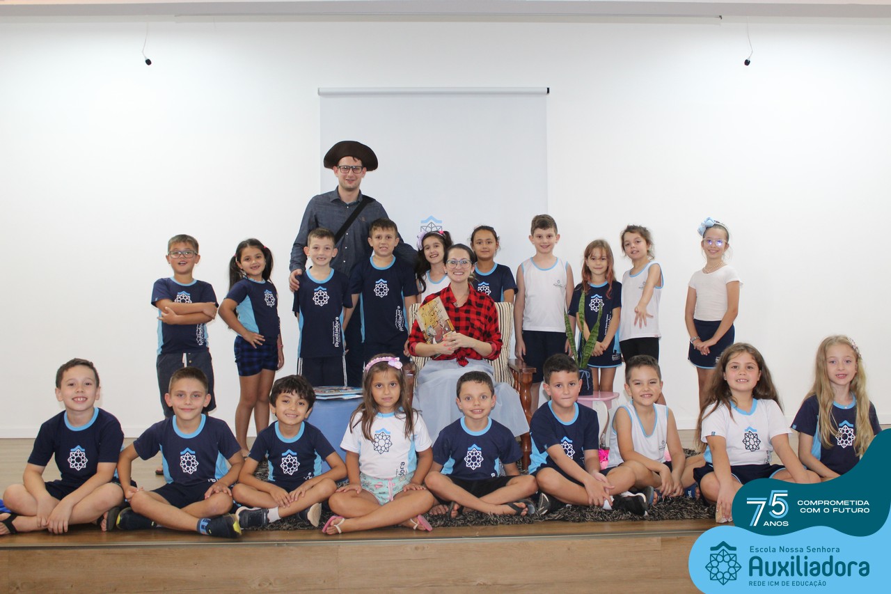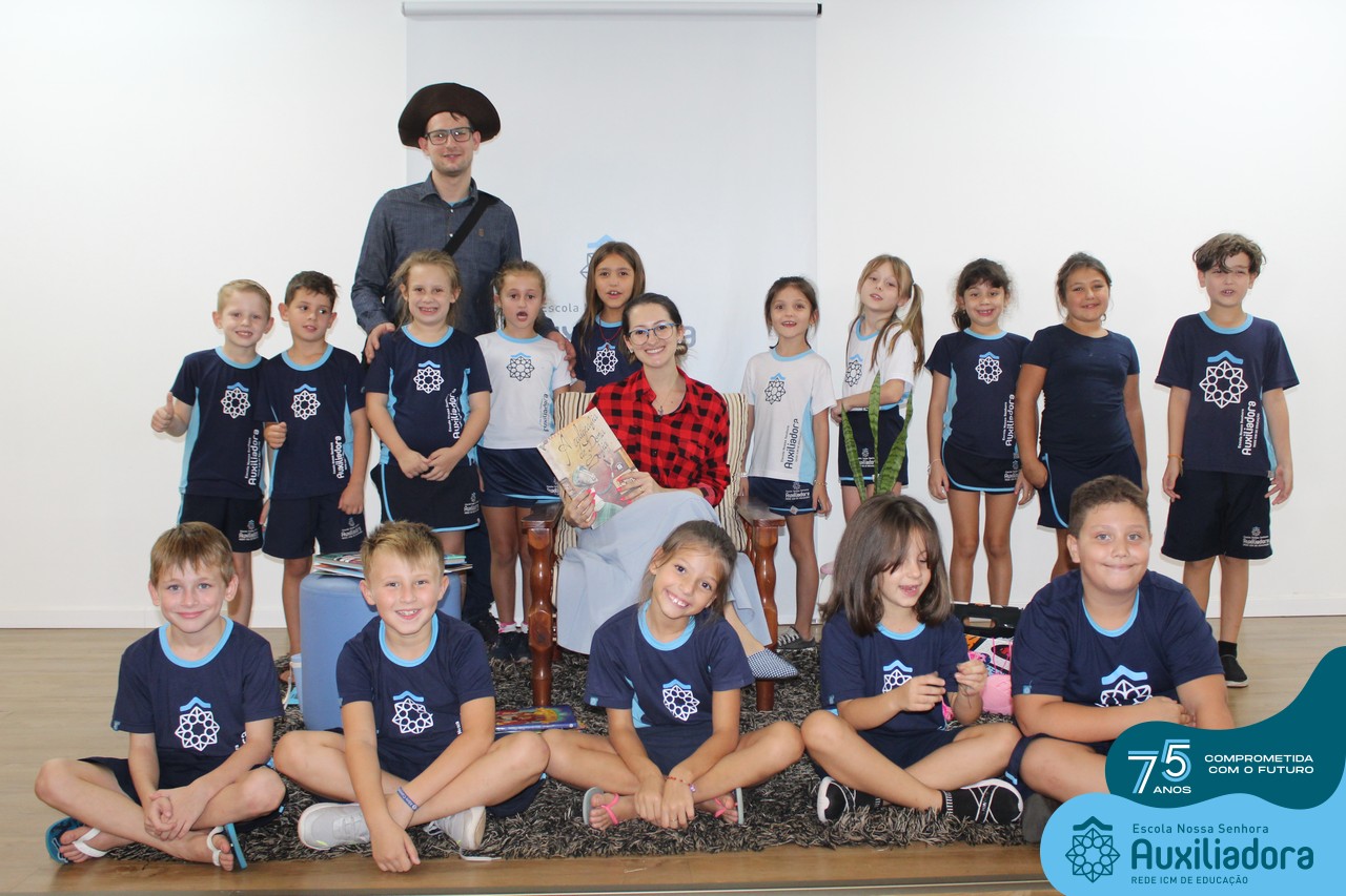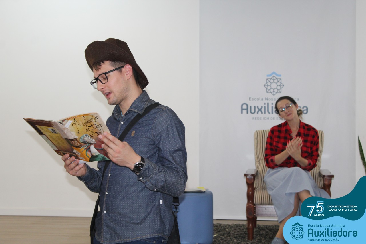 As turmas reuniram-se no auditório da escola para prestigiar a história A CALIGRAFIA DE DONA SOFIA, do autor André Neves. Através do enredo, as crianças encantaram-se com os personagens e aumentaram, ainda mais, a expectativa pela leitura e escrita cursiva, ouvindo as dicas e segredos de escrever bem.