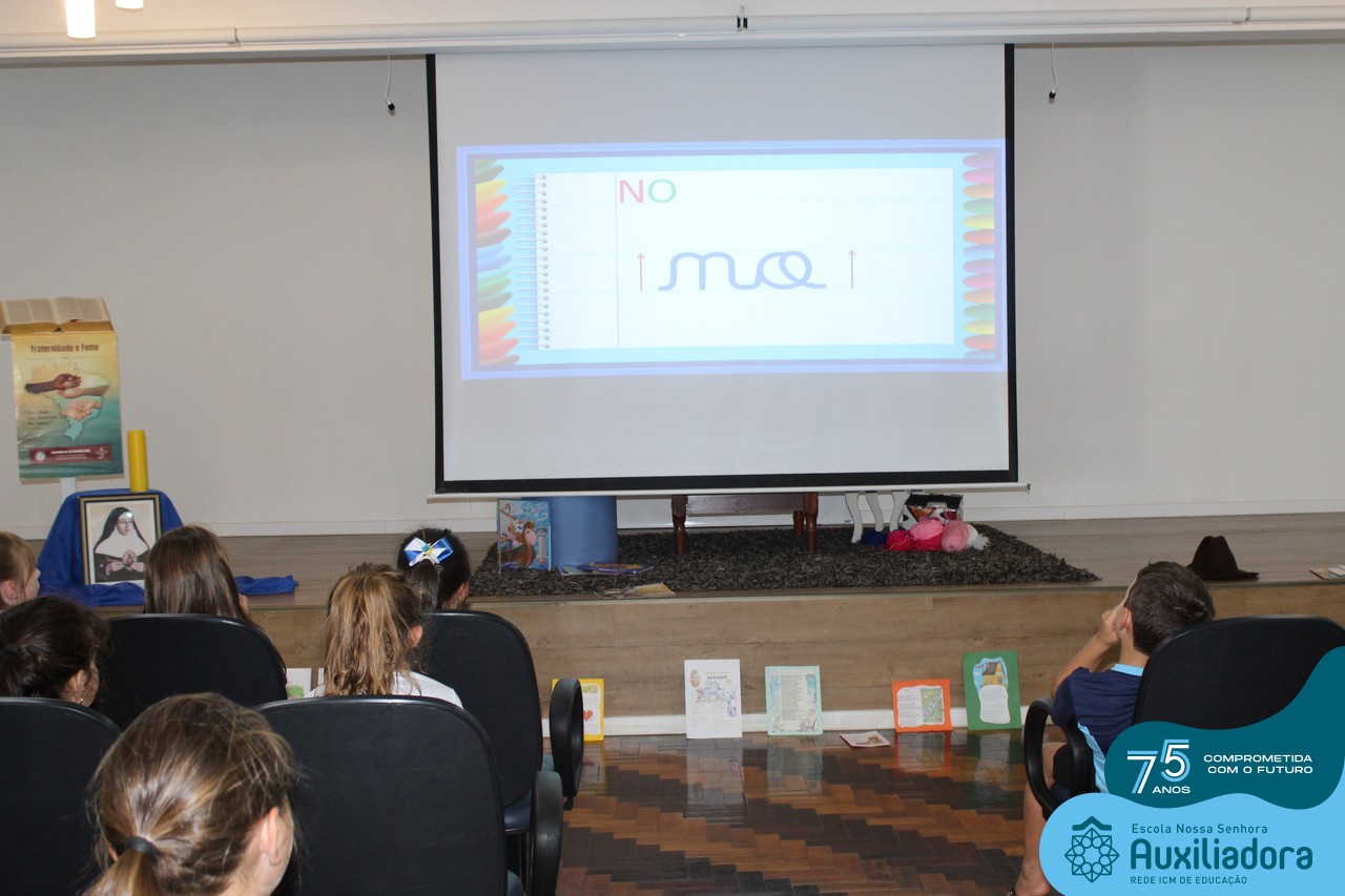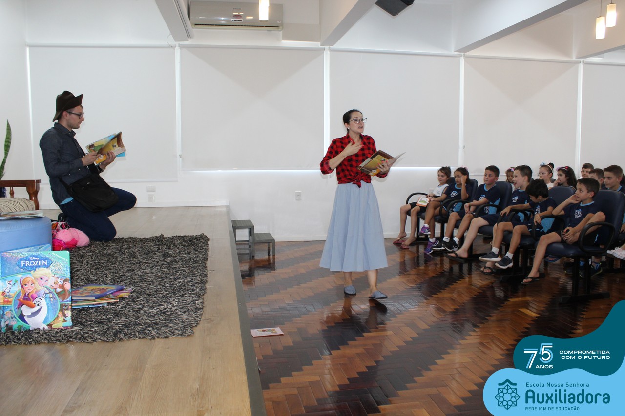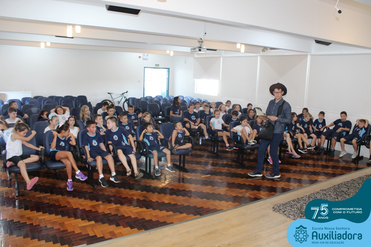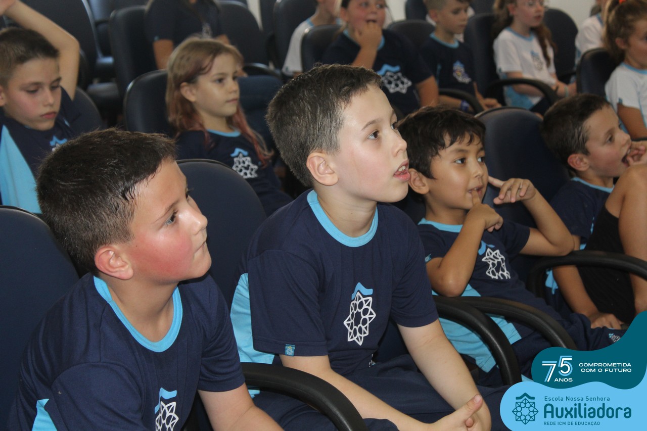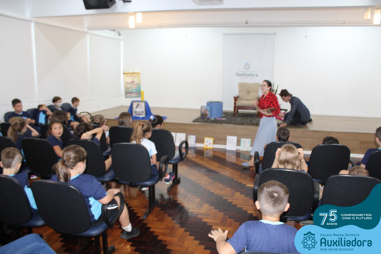 As turmas reuniram-se no auditório da escola para prestigiar a história A CALIGRAFIA DE DONA SOFIA, do autor André Neves. Através do enredo, as crianças encantaram-se com os personagens e aumentaram, ainda mais, a expectativa pela leitura e escrita cursiva, ouvindo as dicas e segredos de escrever bem.