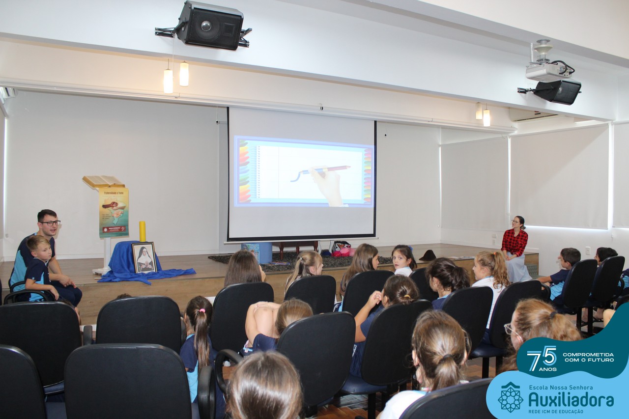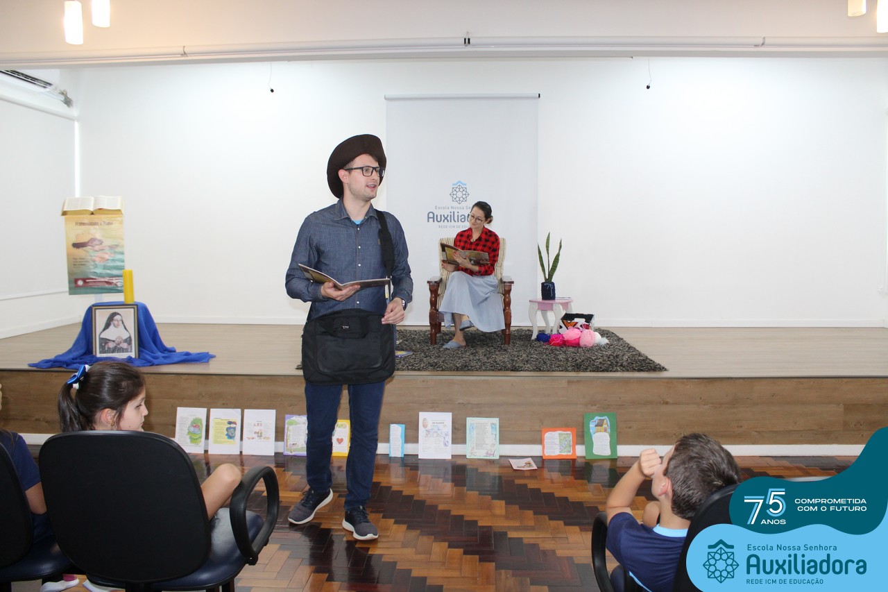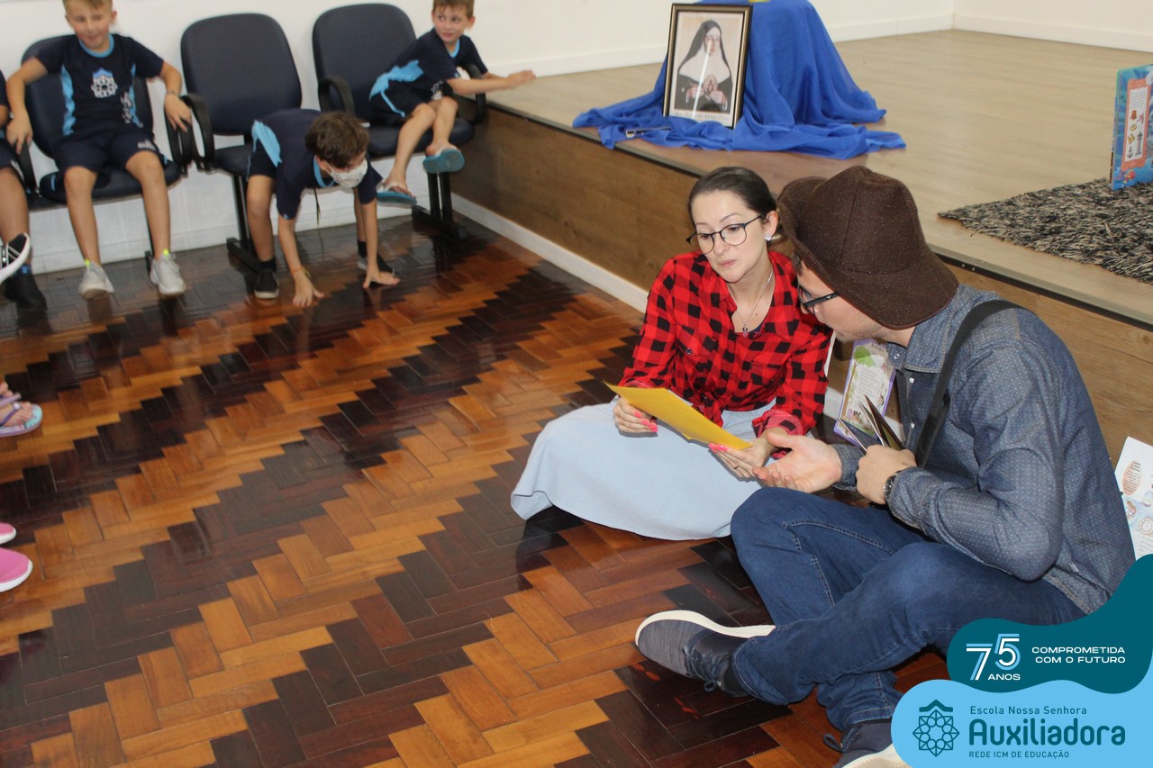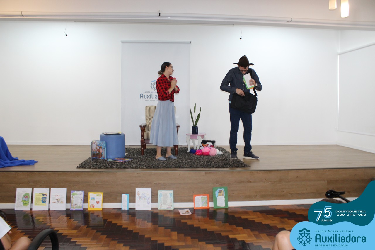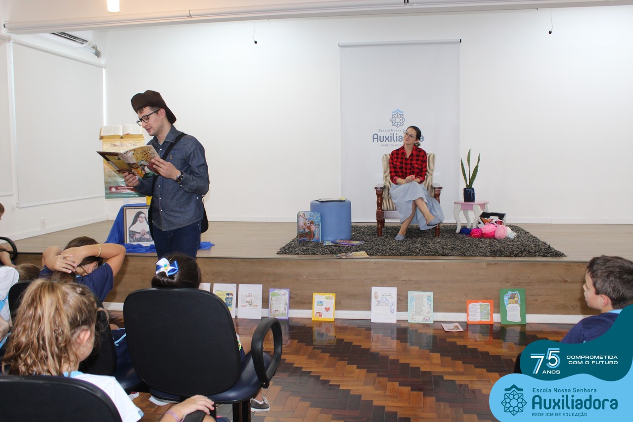 As turmas reuniram-se no auditório da escola para prestigiar a história A CALIGRAFIA DE DONA SOFIA, do autor André Neves. Através do enredo, as crianças encantaram-se com os personagens e aumentaram, ainda mais, a expectativa pela leitura e escrita cursiva, ouvindo as dicas e segredos de escrever bem.
