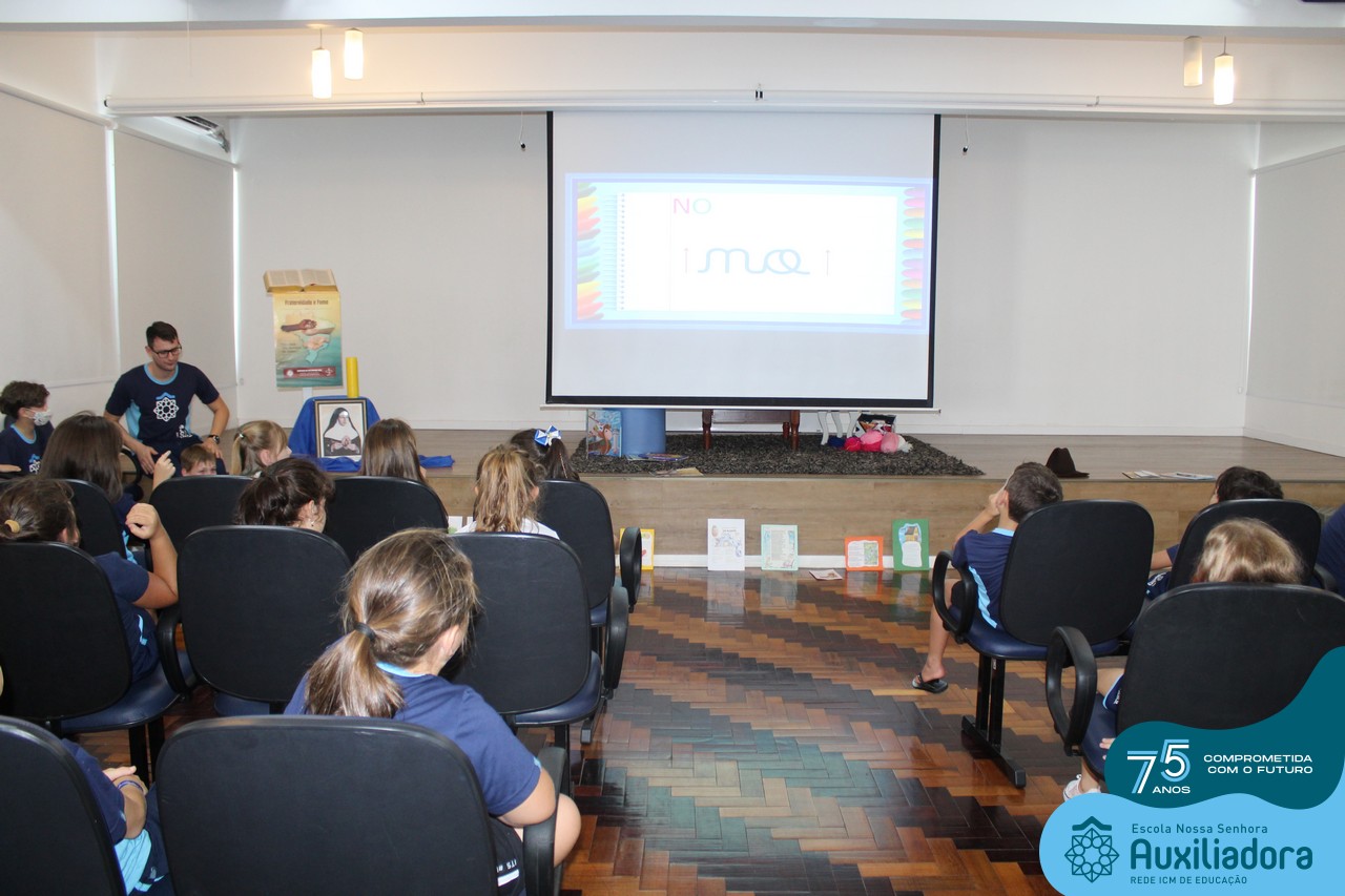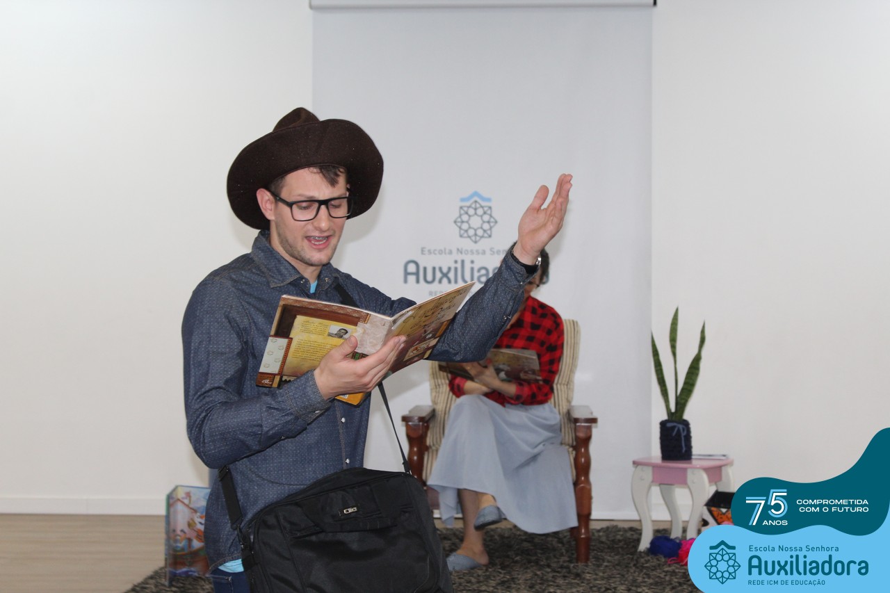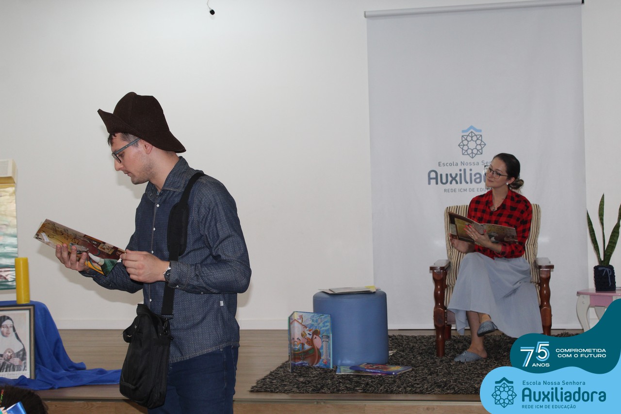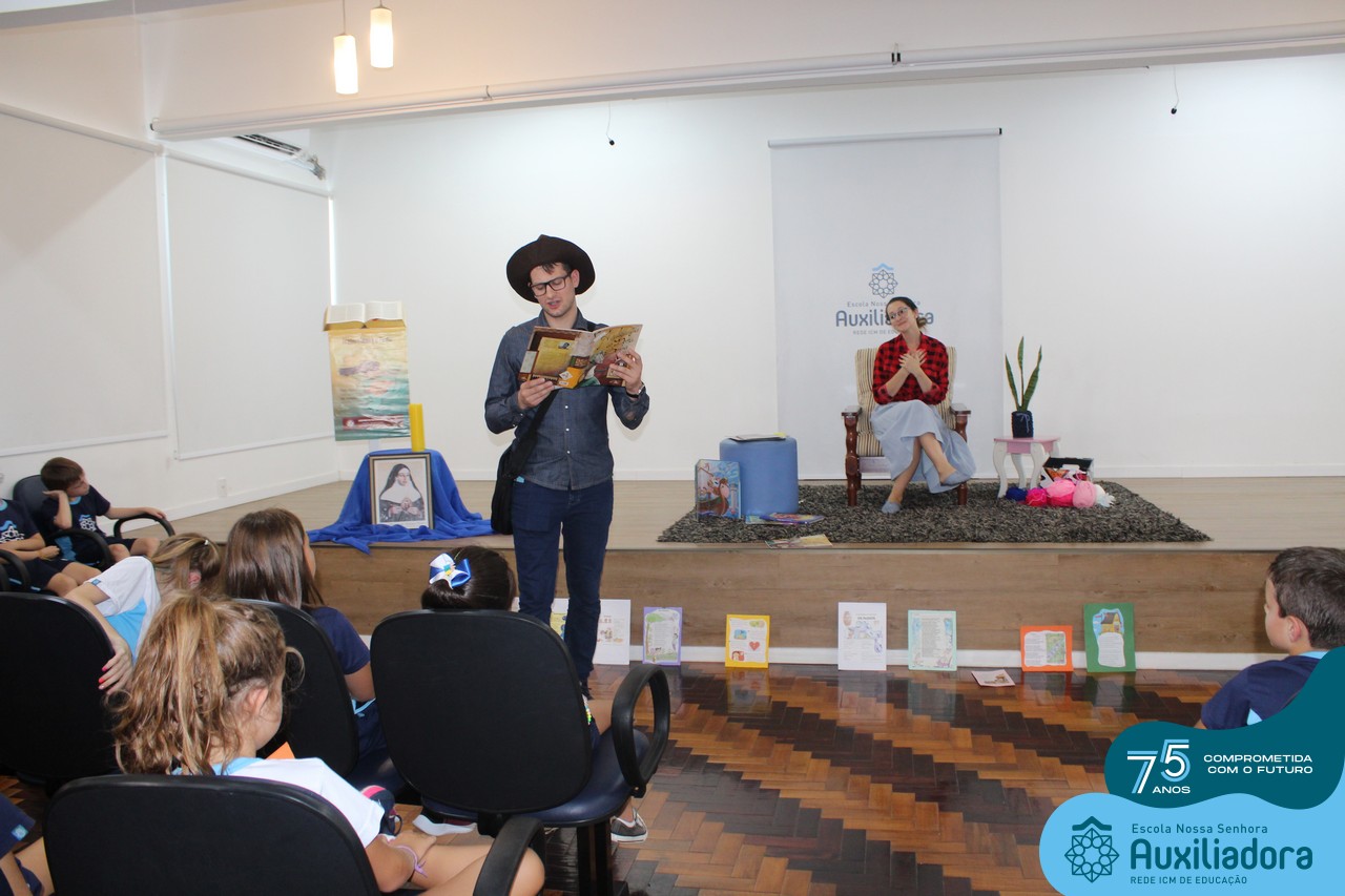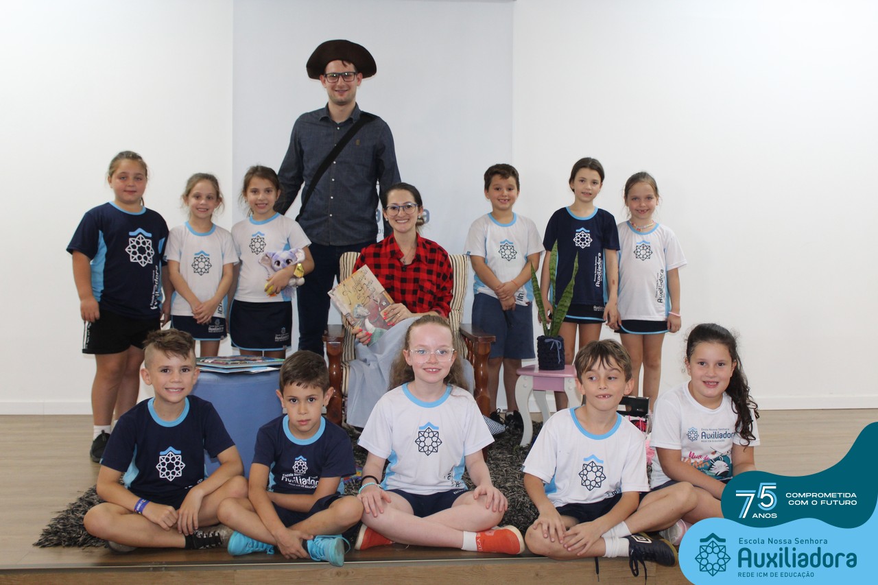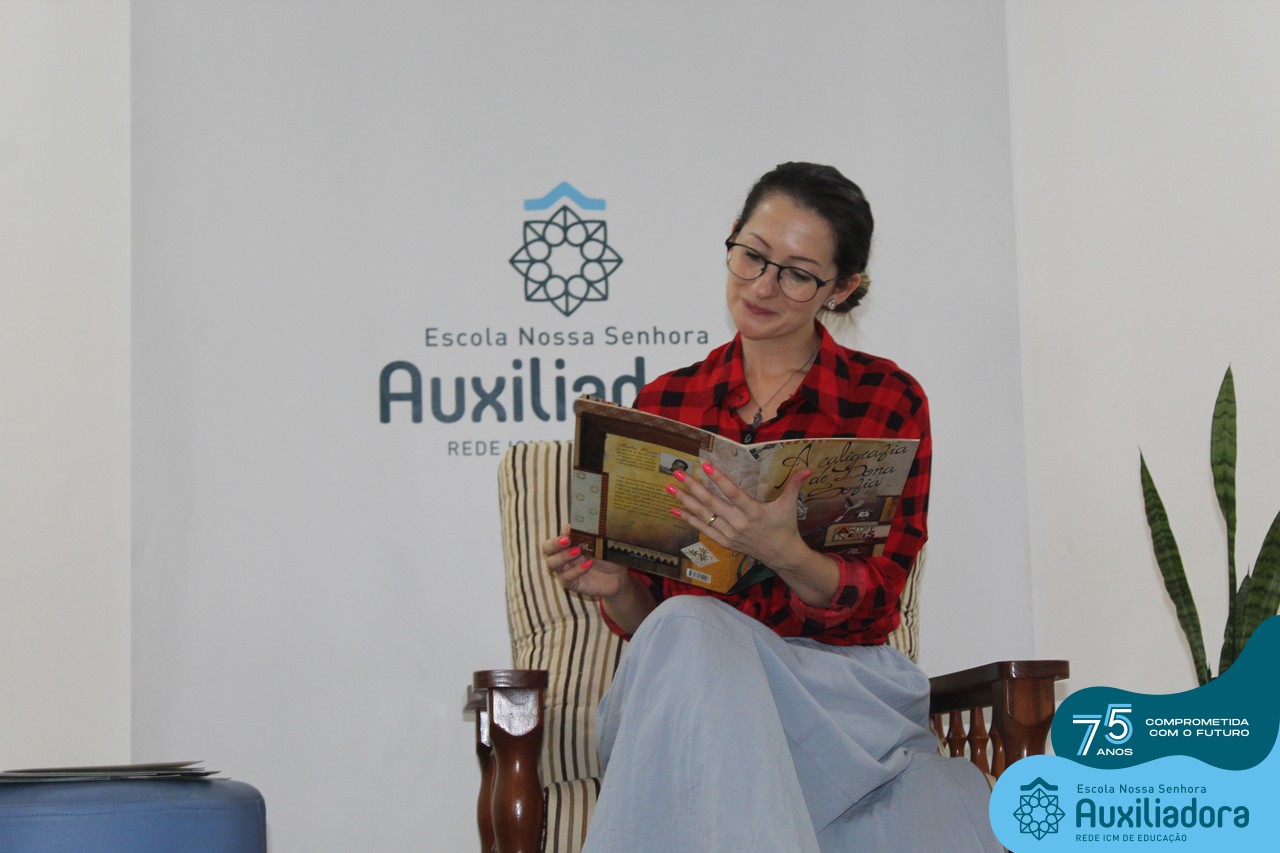 As turmas reuniram-se no auditório da escola para prestigiar a história A CALIGRAFIA DE DONA SOFIA, do autor André Neves. Através do enredo, as crianças encantaram-se com os personagens e aumentaram, ainda mais, a expectativa pela leitura e escrita cursiva, ouvindo as dicas e segredos de escrever bem.