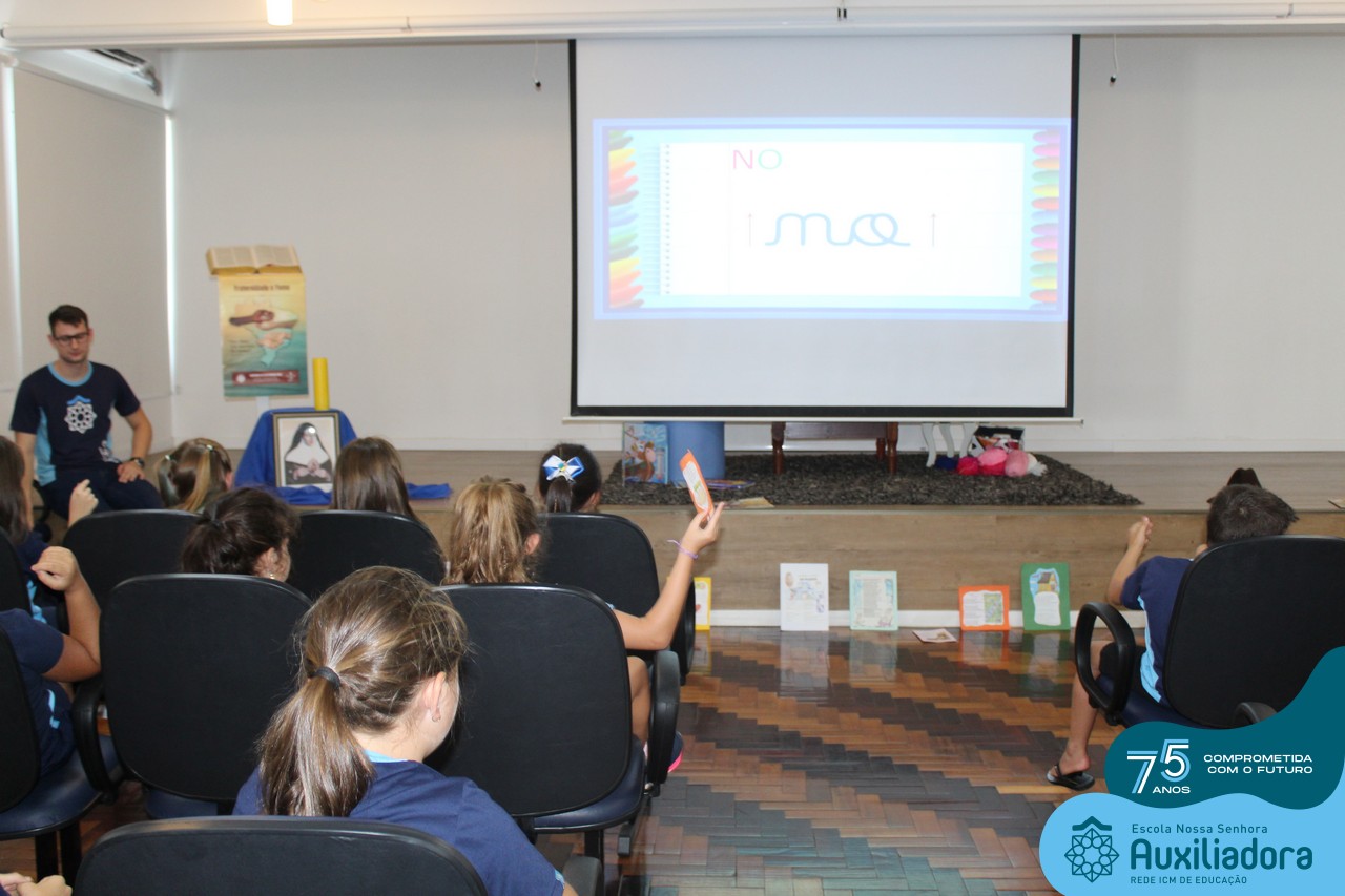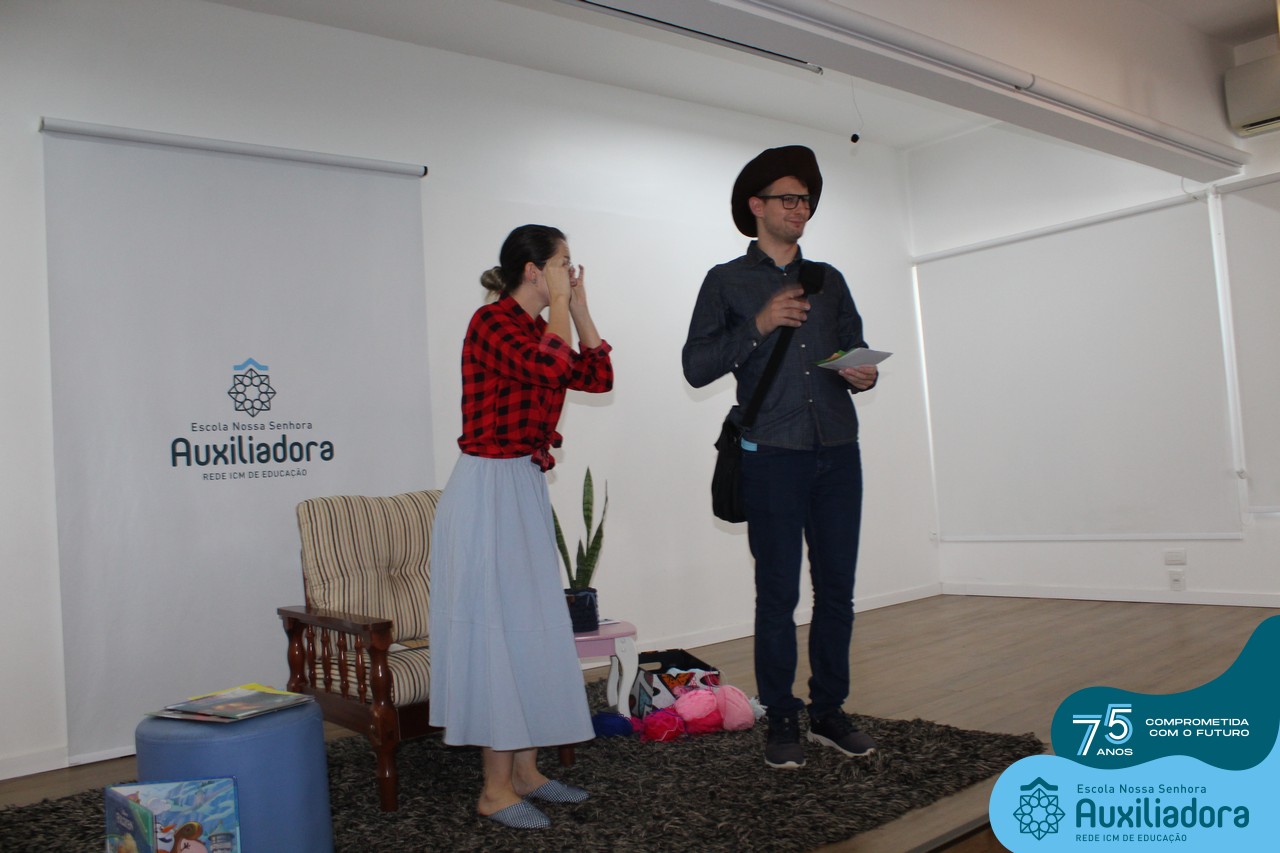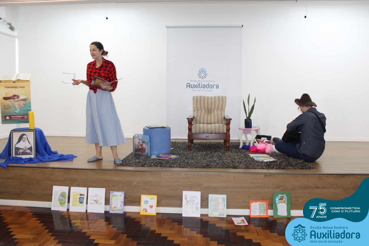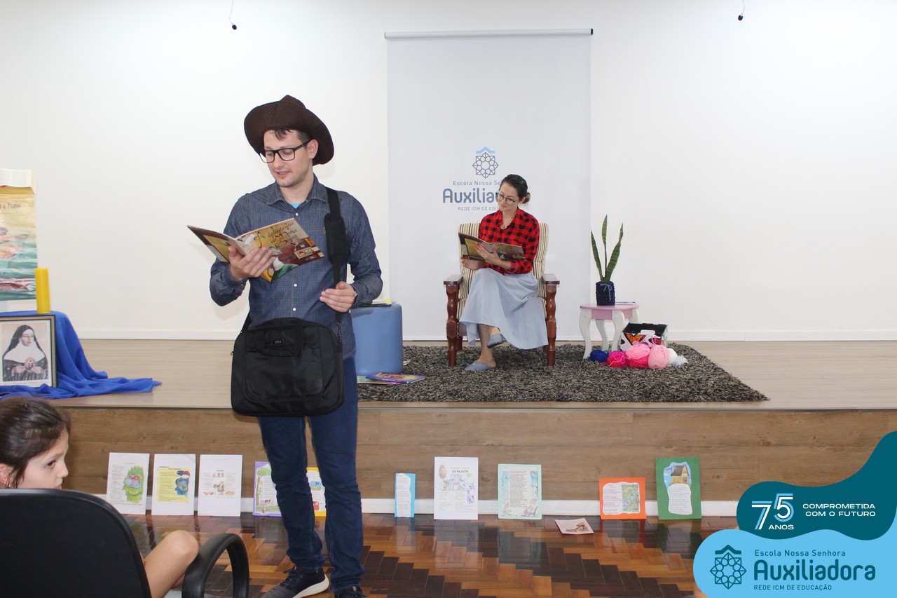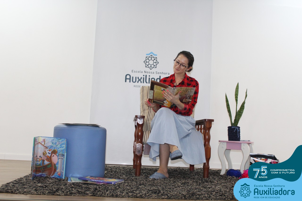 As turmas reuniram-se no auditório da escola para prestigiar a história A CALIGRAFIA DE DONA SOFIA, do autor André Neves. Através do enredo, as crianças encantaram-se com os personagens e aumentaram, ainda mais, a expectativa pela leitura e escrita cursiva, ouvindo as dicas e segredos de escrever bem.