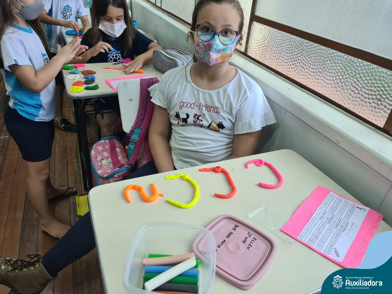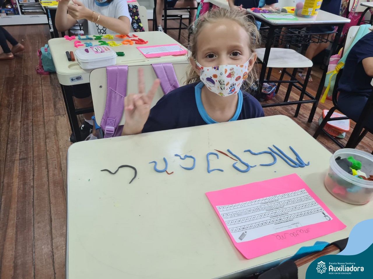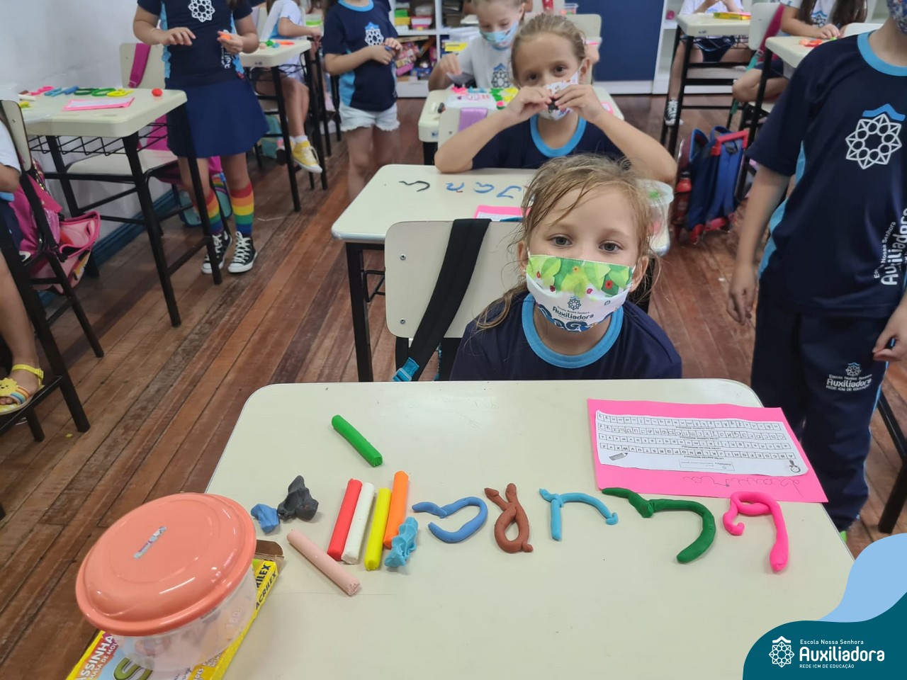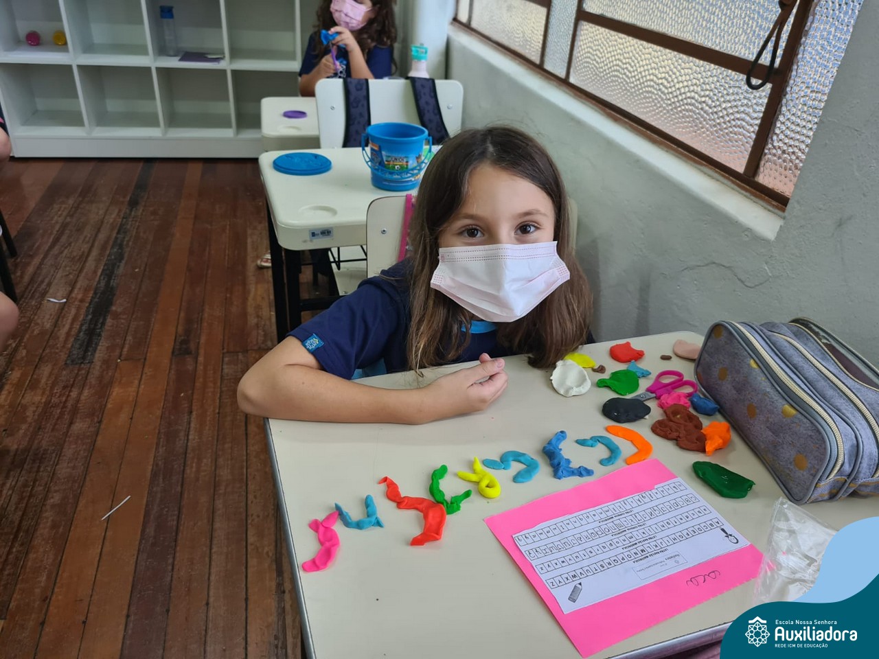 Nesta semana, as turmas do 2º ano se familiarizaram com a letra cursiva. Entre as atividades, as crianças modelaram o traçado da letra usando massinha de modelar para este primeiro contato. Assim, foi muito mais fácil e divertido.