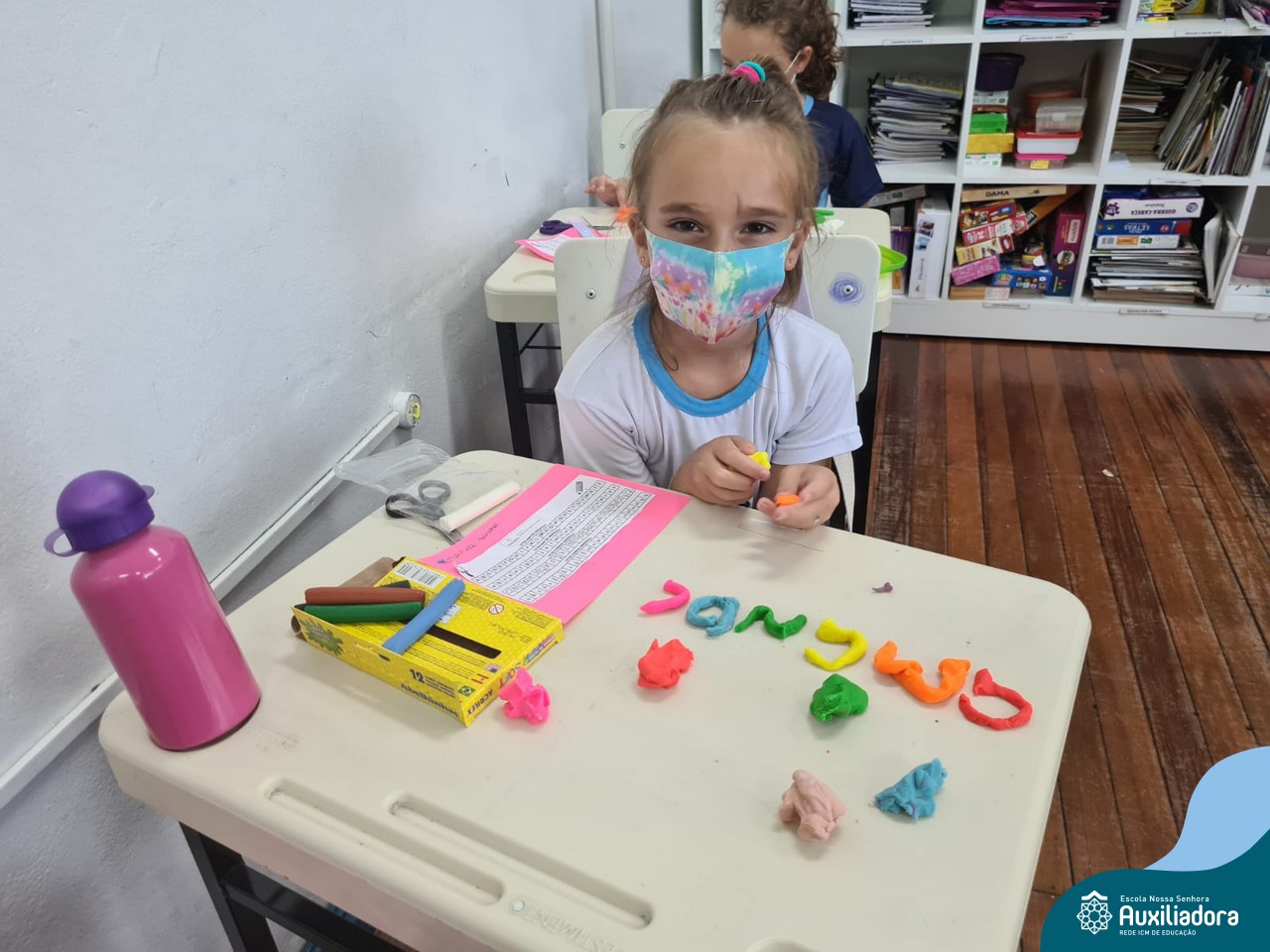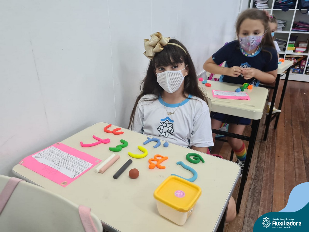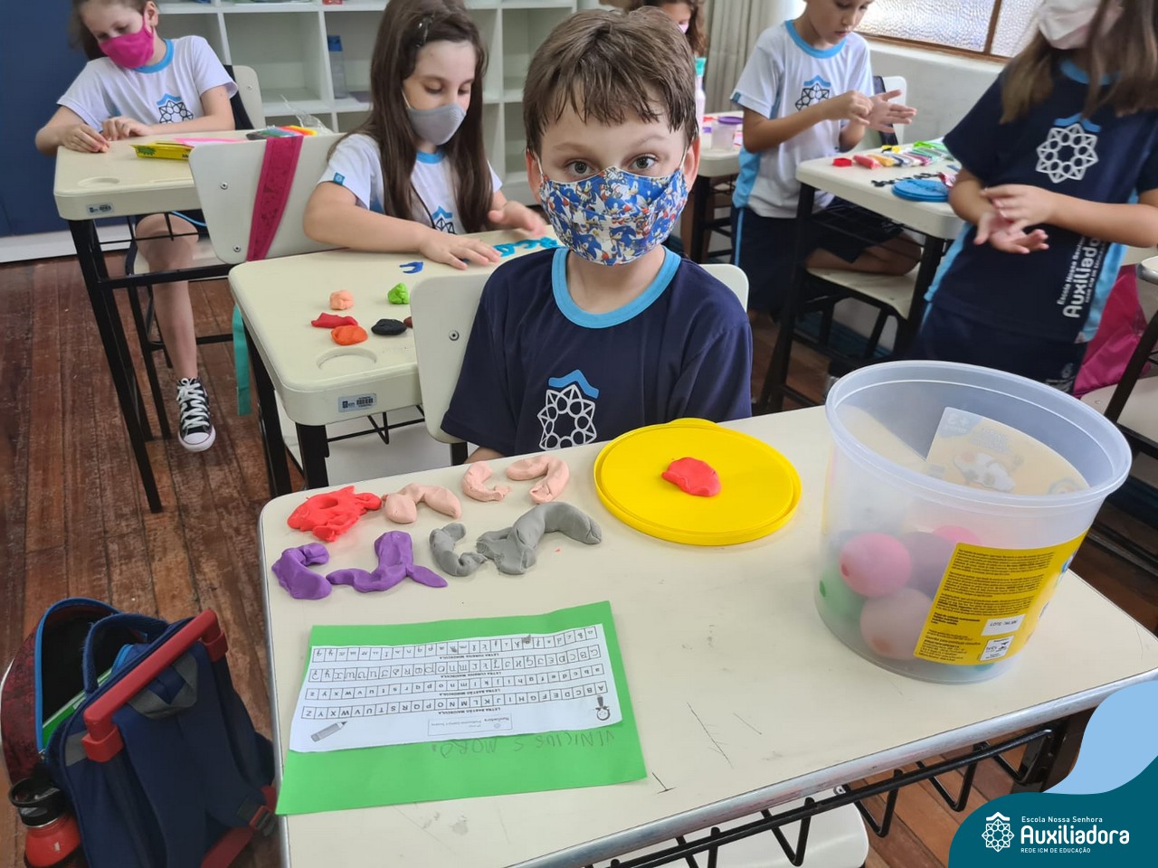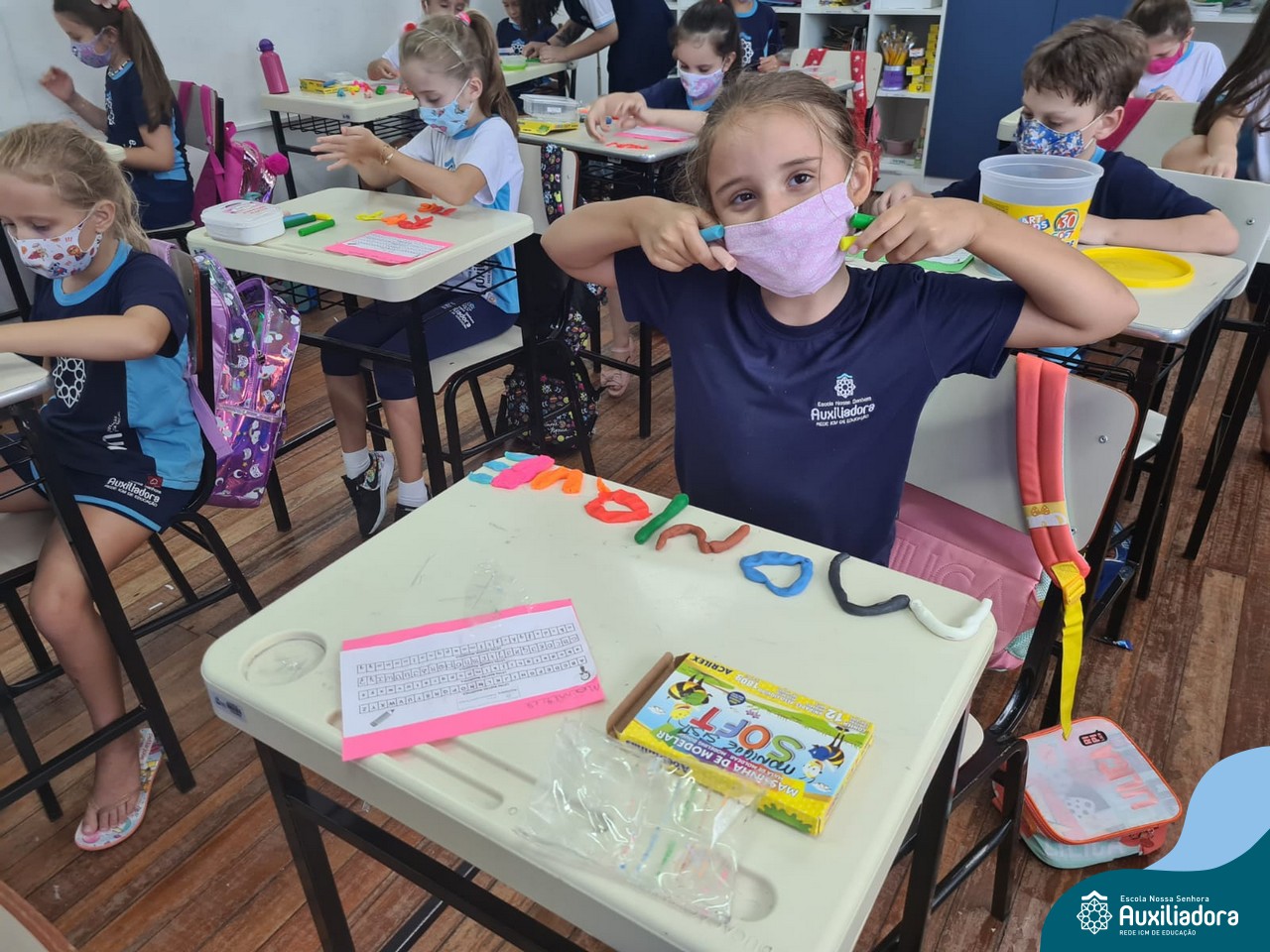 Nesta semana, as turmas do 2º ano se familiarizaram com a letra cursiva. Entre as atividades, as crianças modelaram o traçado da letra usando massinha de modelar para este primeiro contato. Assim, foi muito mais fácil e divertido.