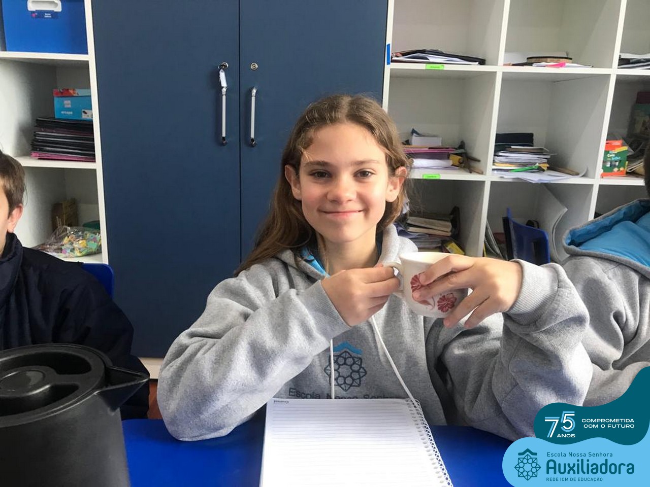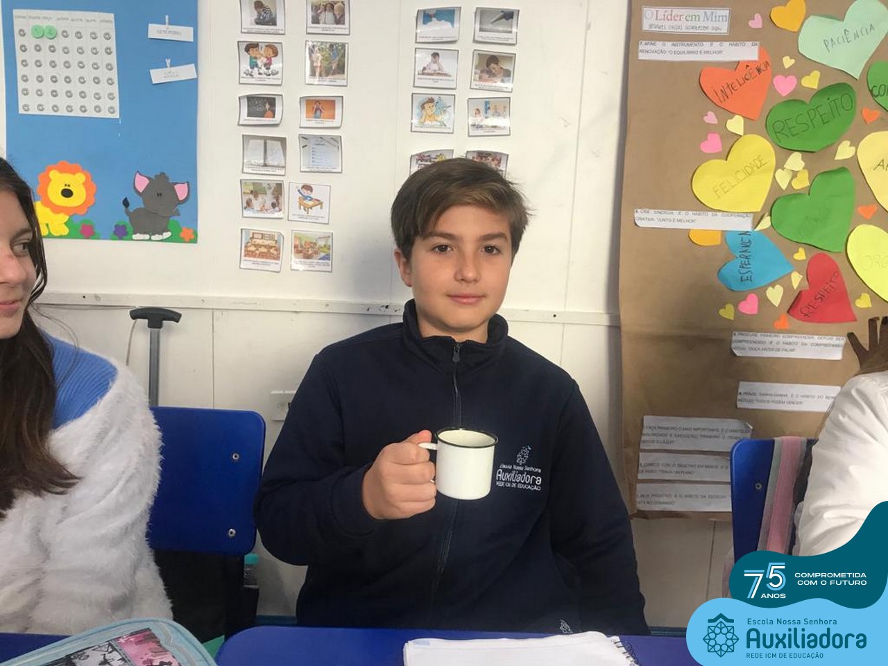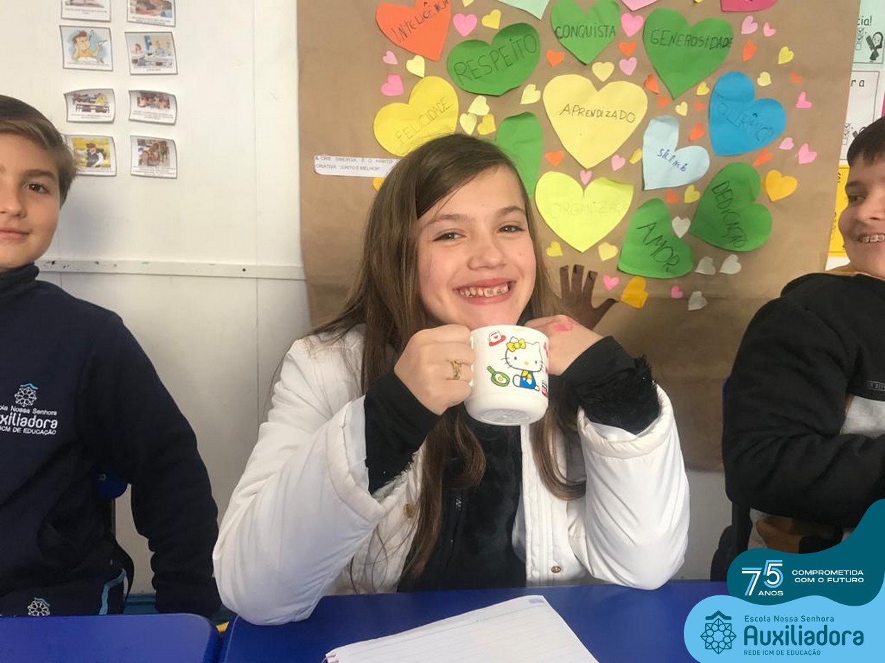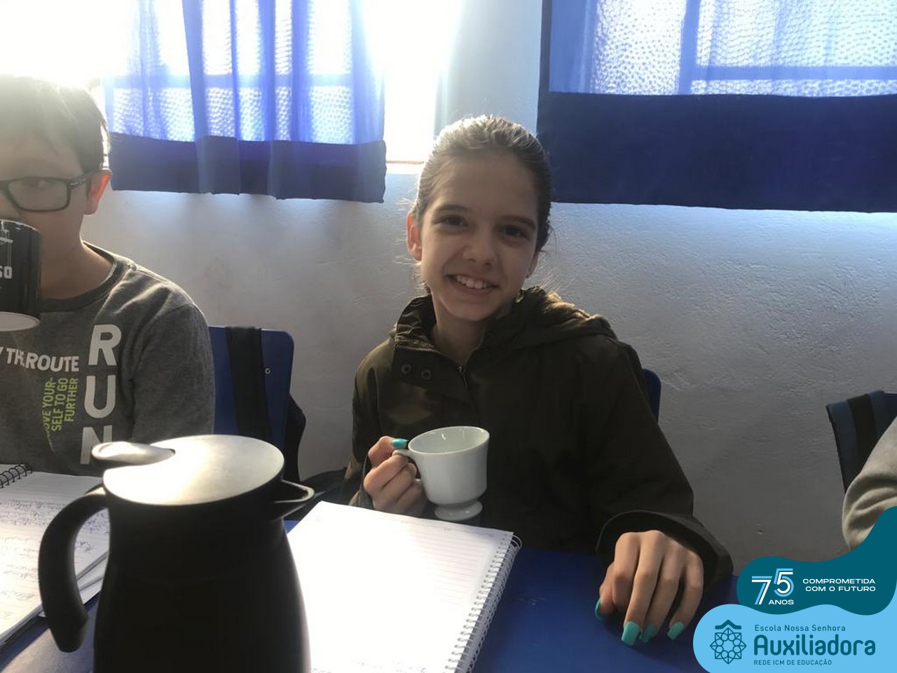 Na segunda-feira os alunos do 5 ano participaram do Café Filosófico, que é um momento em que os alunos falam sobre as problemáticas sociais e elencam soluções para estes enquanto tomam um café!