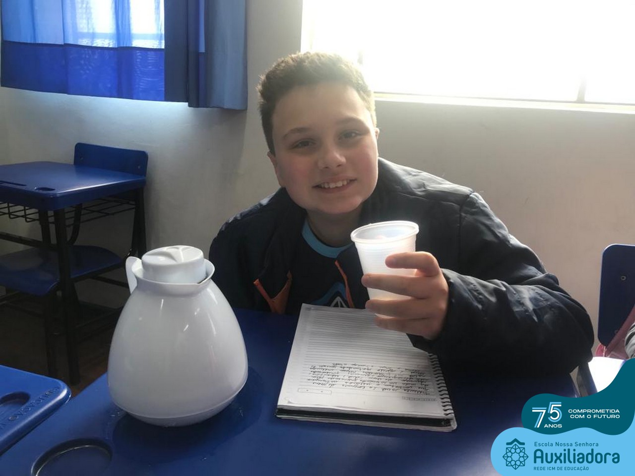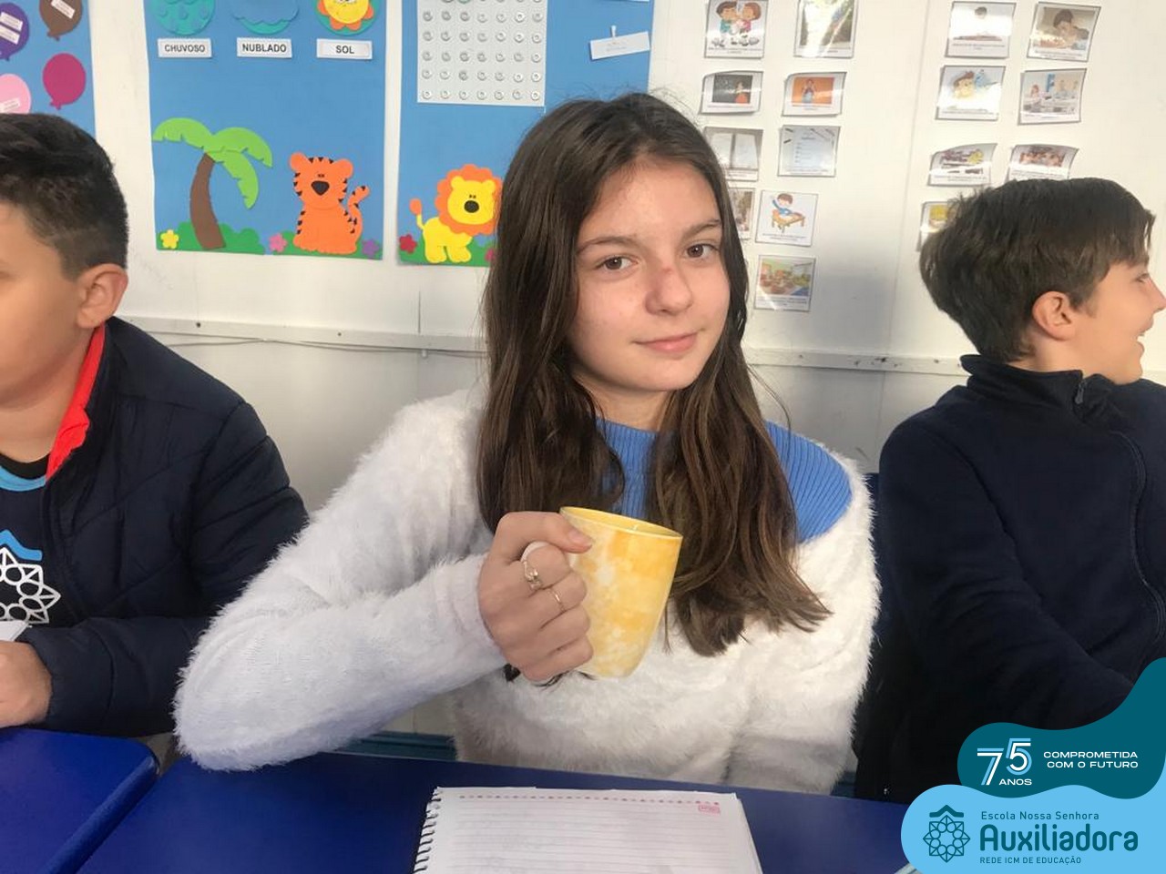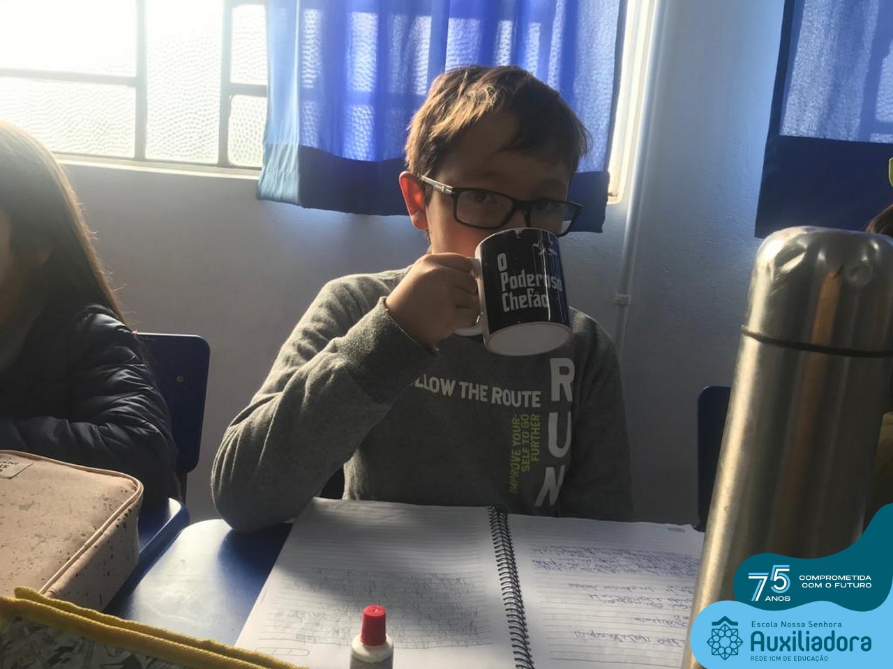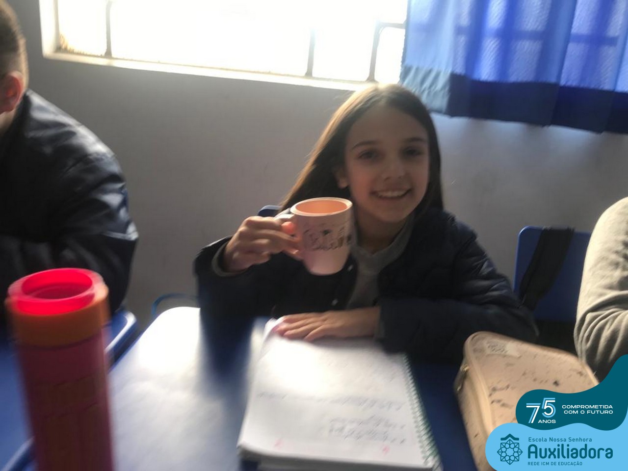 Na segunda-feira os alunos do 5 ano participaram do Café Filosófico, que é um momento em que os alunos falam sobre as problemáticas sociais e elencam soluções para estes enquanto tomam um café!
