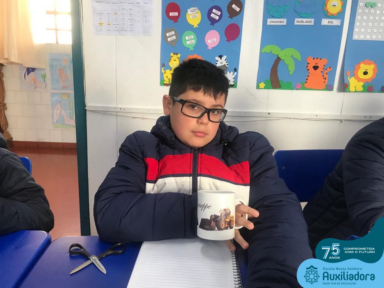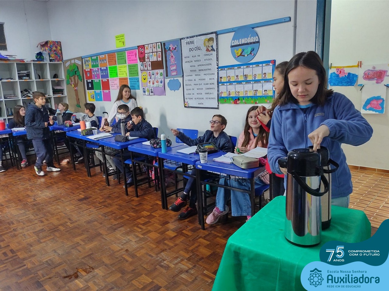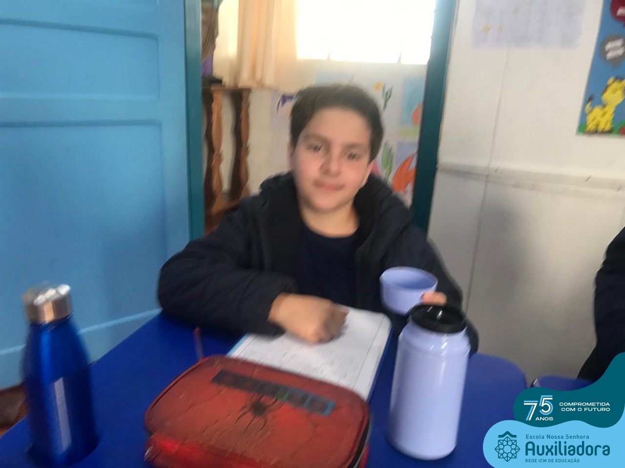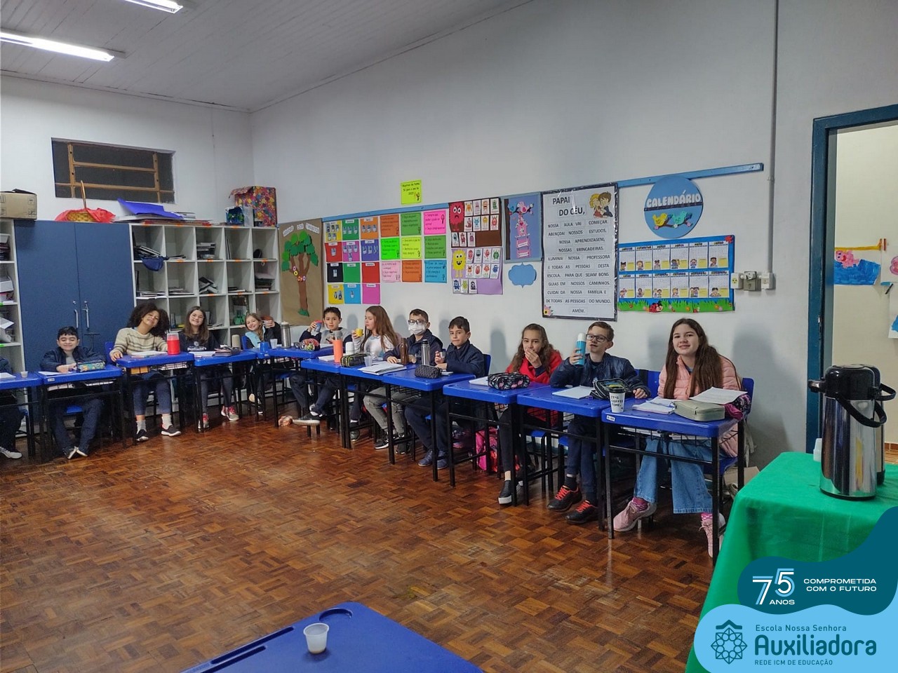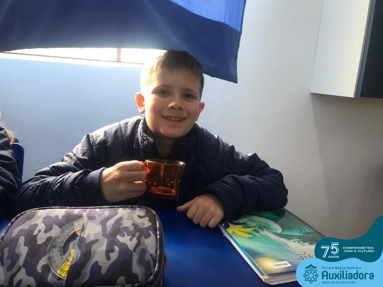 Na segunda-feira os alunos do 5 ano participaram do Café Filosófico, que é um momento em que os alunos falam sobre as problemáticas sociais e elencam soluções para estes enquanto tomam um café!