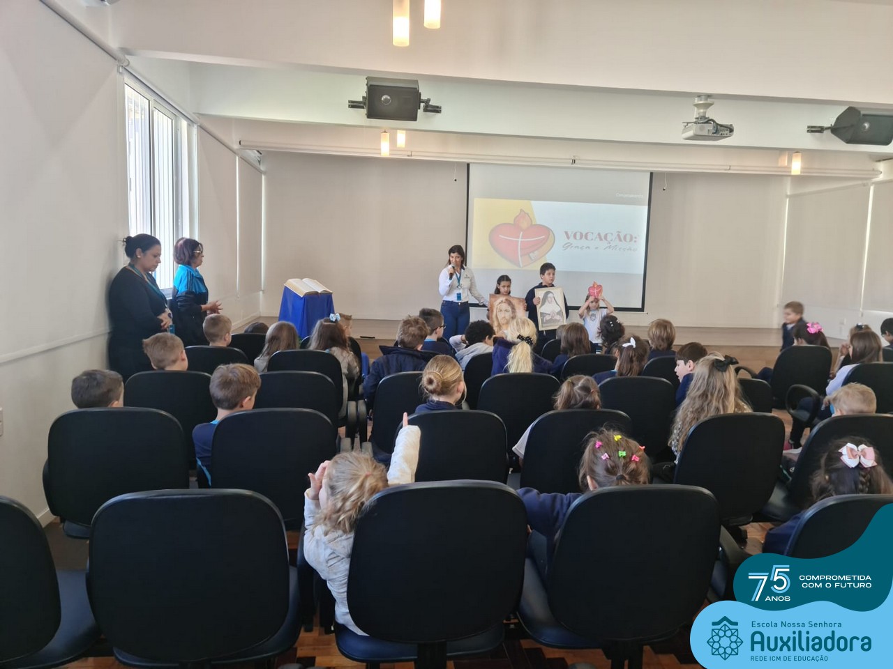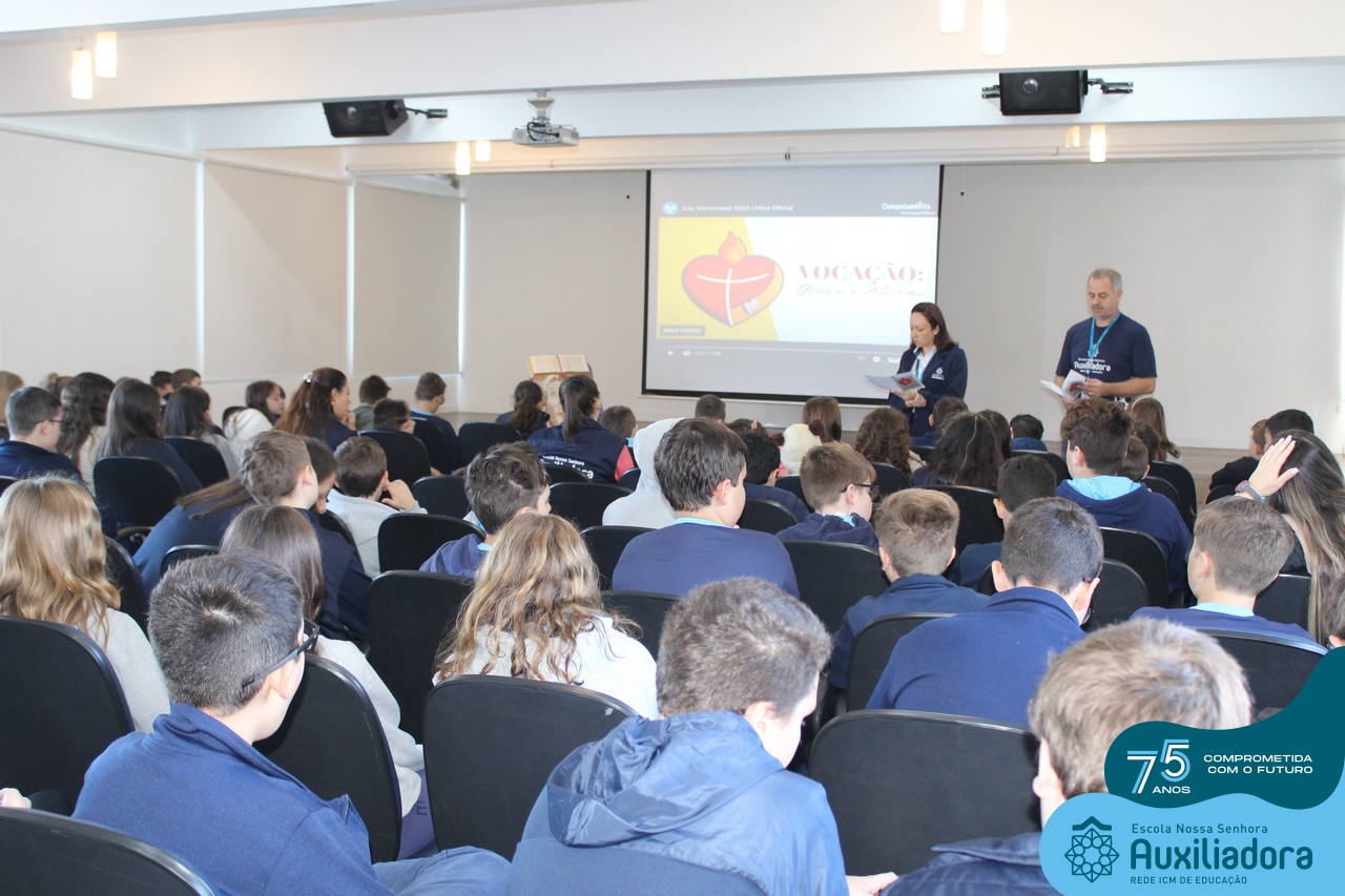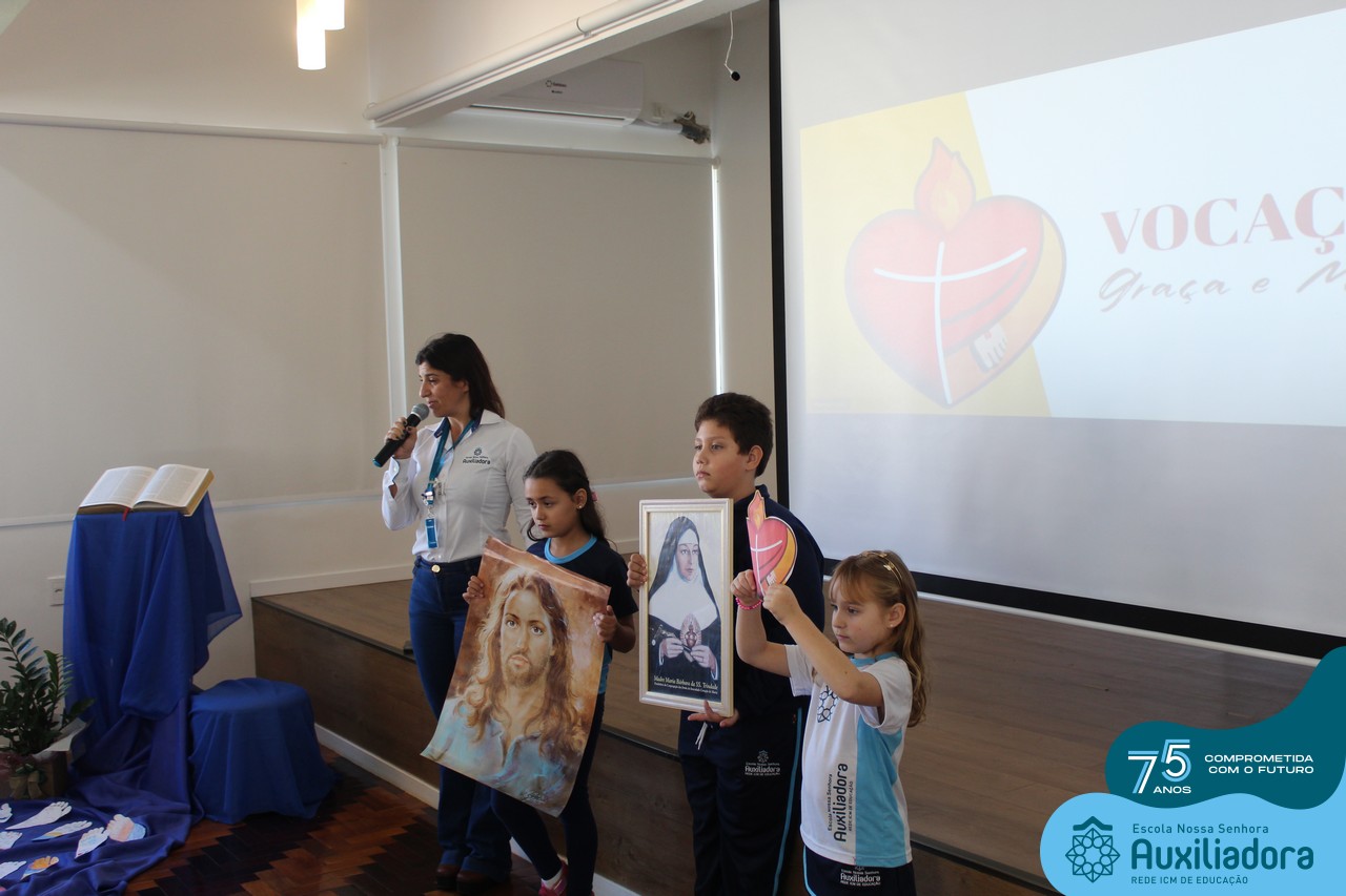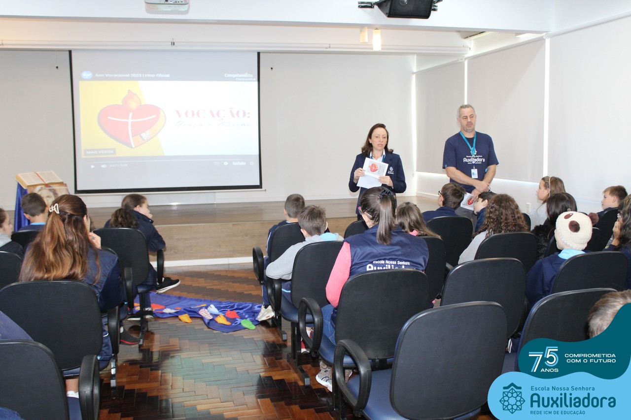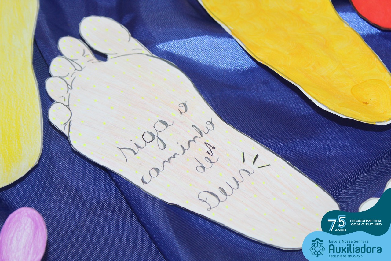 Em nossa Escola a celebração aconteceu no auditório da escola com a presença dos alunos e professores do turno da manhã e da tarde.  Nesta oportunidade, os símbolos do coração e das pegadas ajudaram a compreender melhor o convite de Jesus aos discípulos de Emaús (Lc24,13-36) para assumirem sua vocação de anunciar Cristo Ressuscitado.