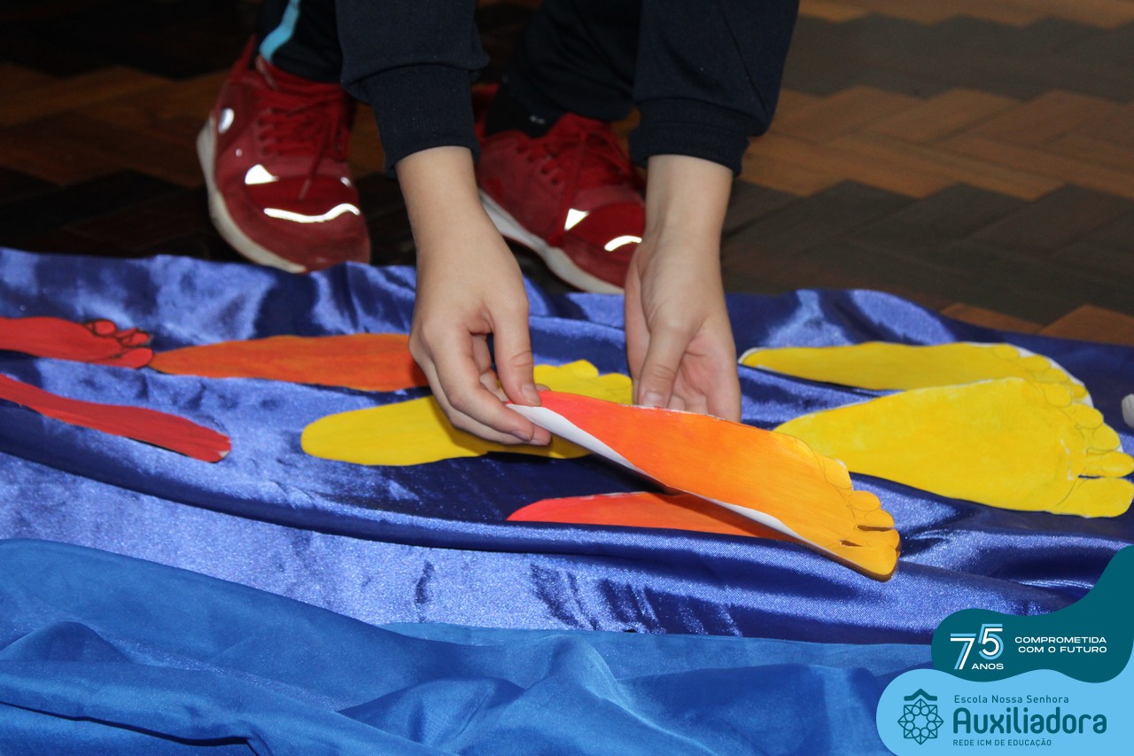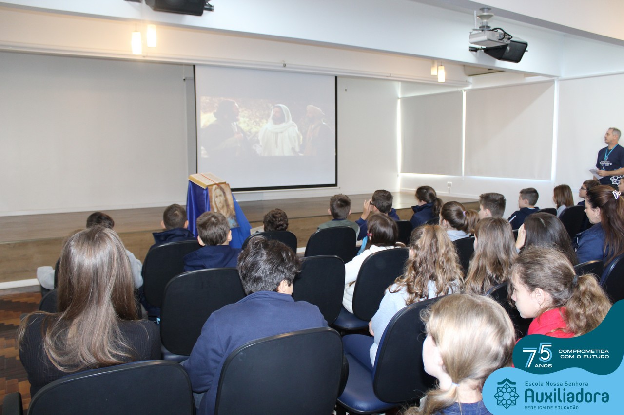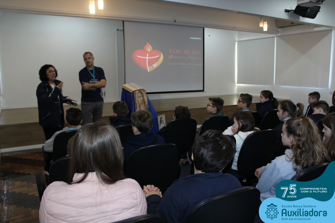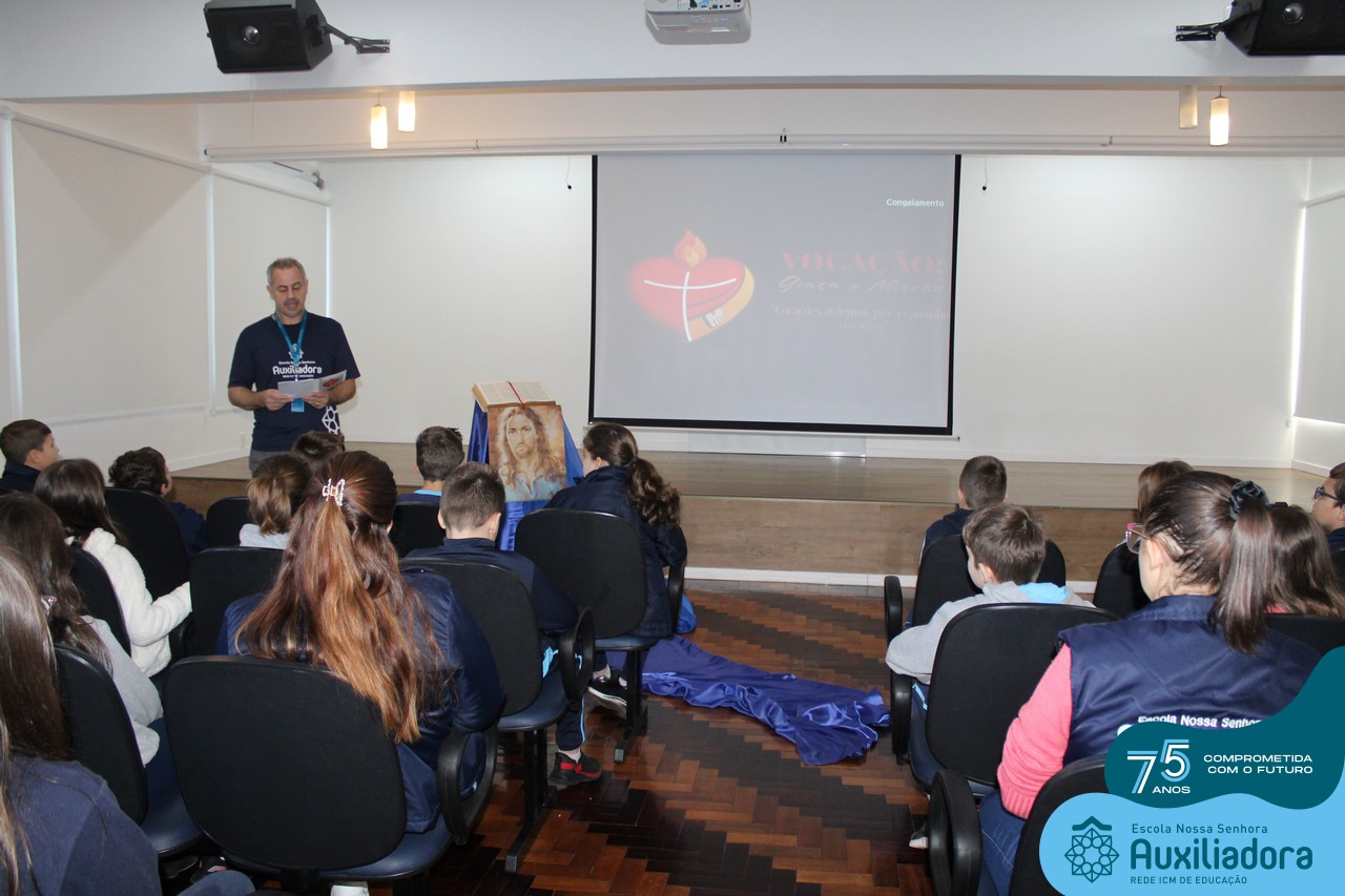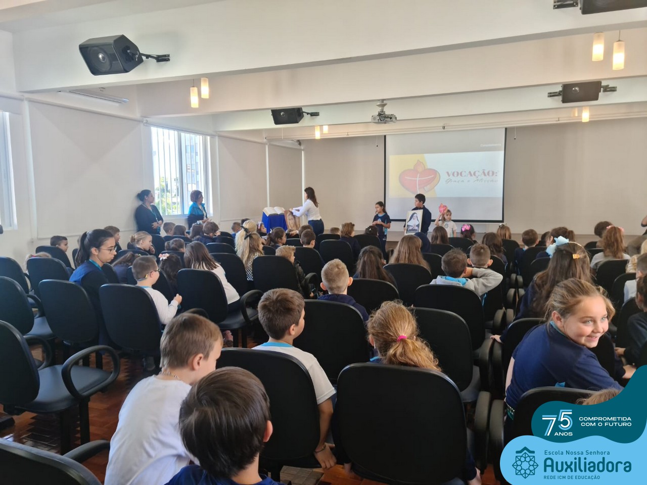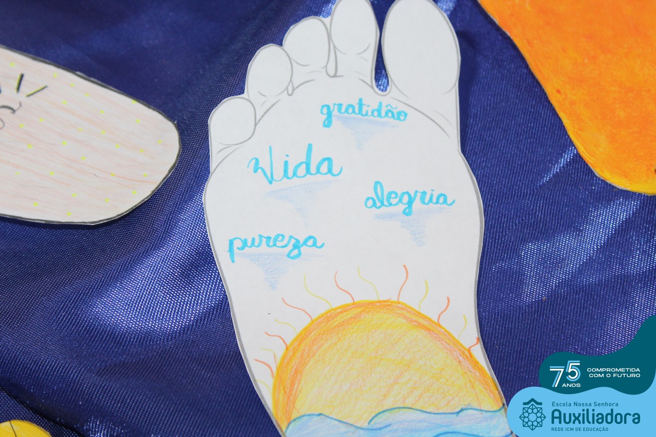 Em nossa Escola a celebração aconteceu no auditório da escola com a presença dos alunos e professores do turno da manhã e da tarde.  Nesta oportunidade, os símbolos do coração e das pegadas ajudaram a compreender melhor o convite de Jesus aos discípulos de Emaús (Lc24,13-36) para assumirem sua vocação de anunciar Cristo Ressuscitado.