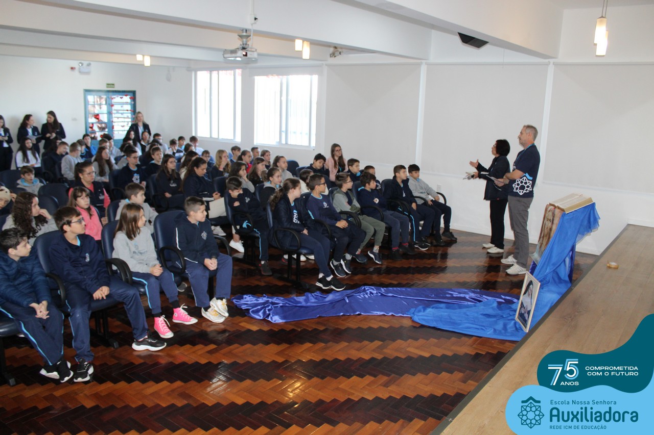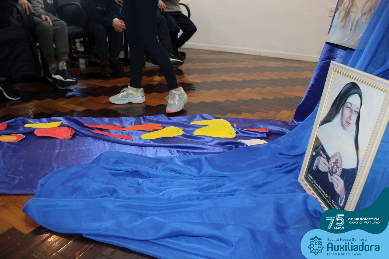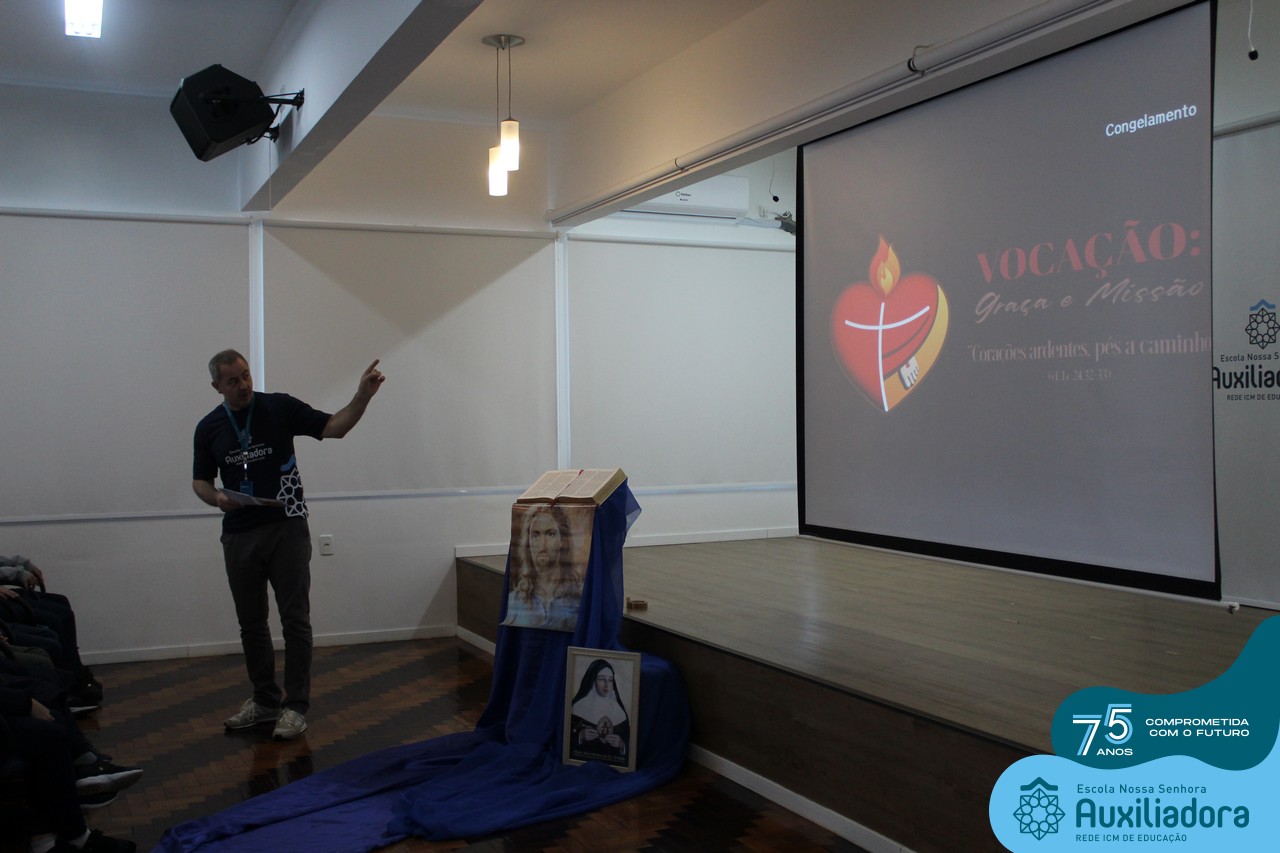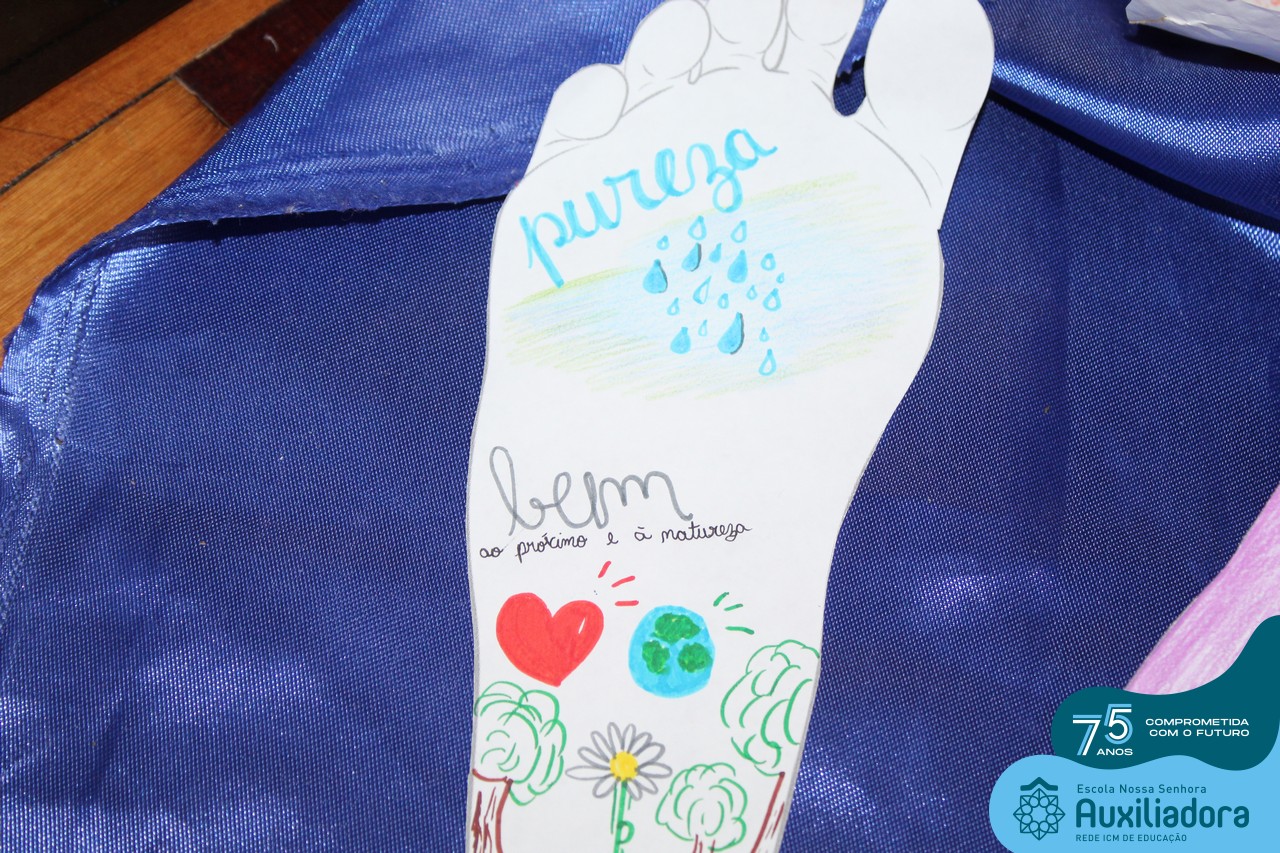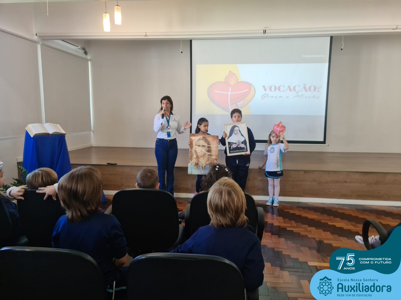 Em nossa Escola a celebração aconteceu no auditório da escola com a presença dos alunos e professores do turno da manhã e da tarde.  Nesta oportunidade, os símbolos do coração e das pegadas ajudaram a compreender melhor o convite de Jesus aos discípulos de Emaús (Lc24,13-36) para assumirem sua vocação de anunciar Cristo Ressuscitado.