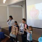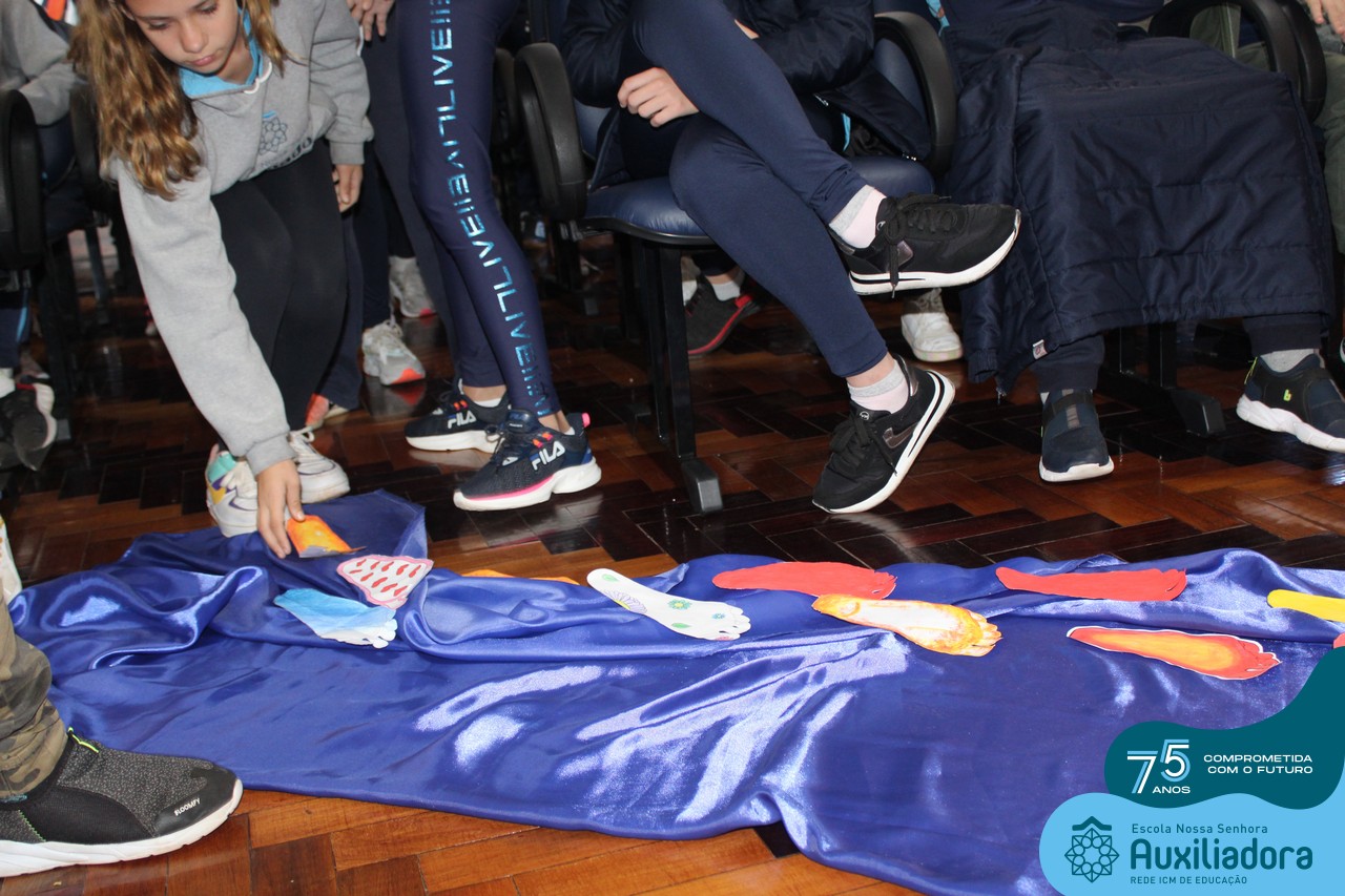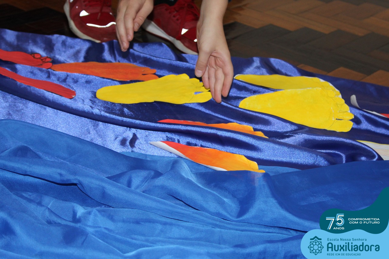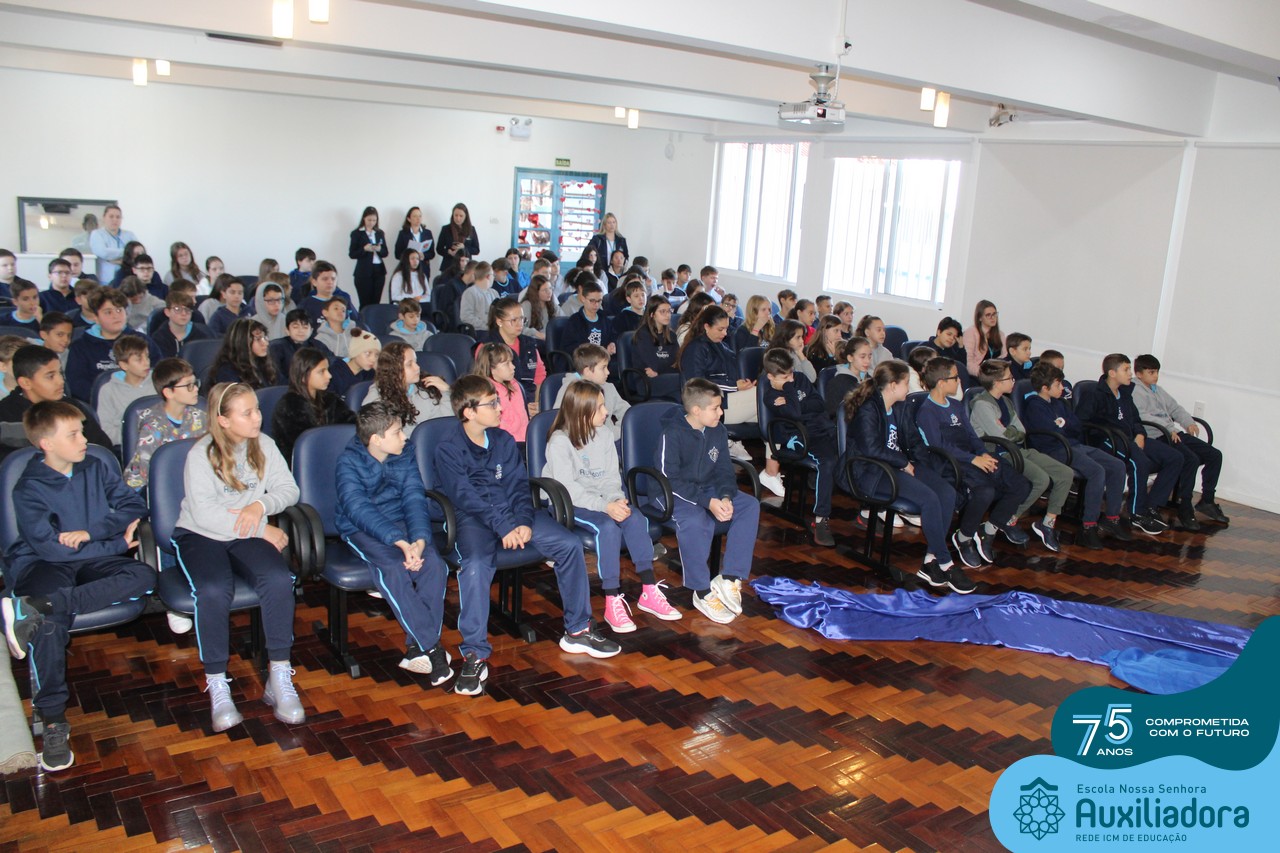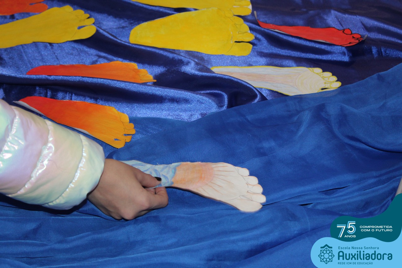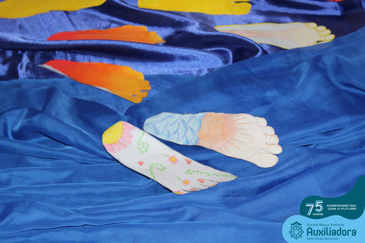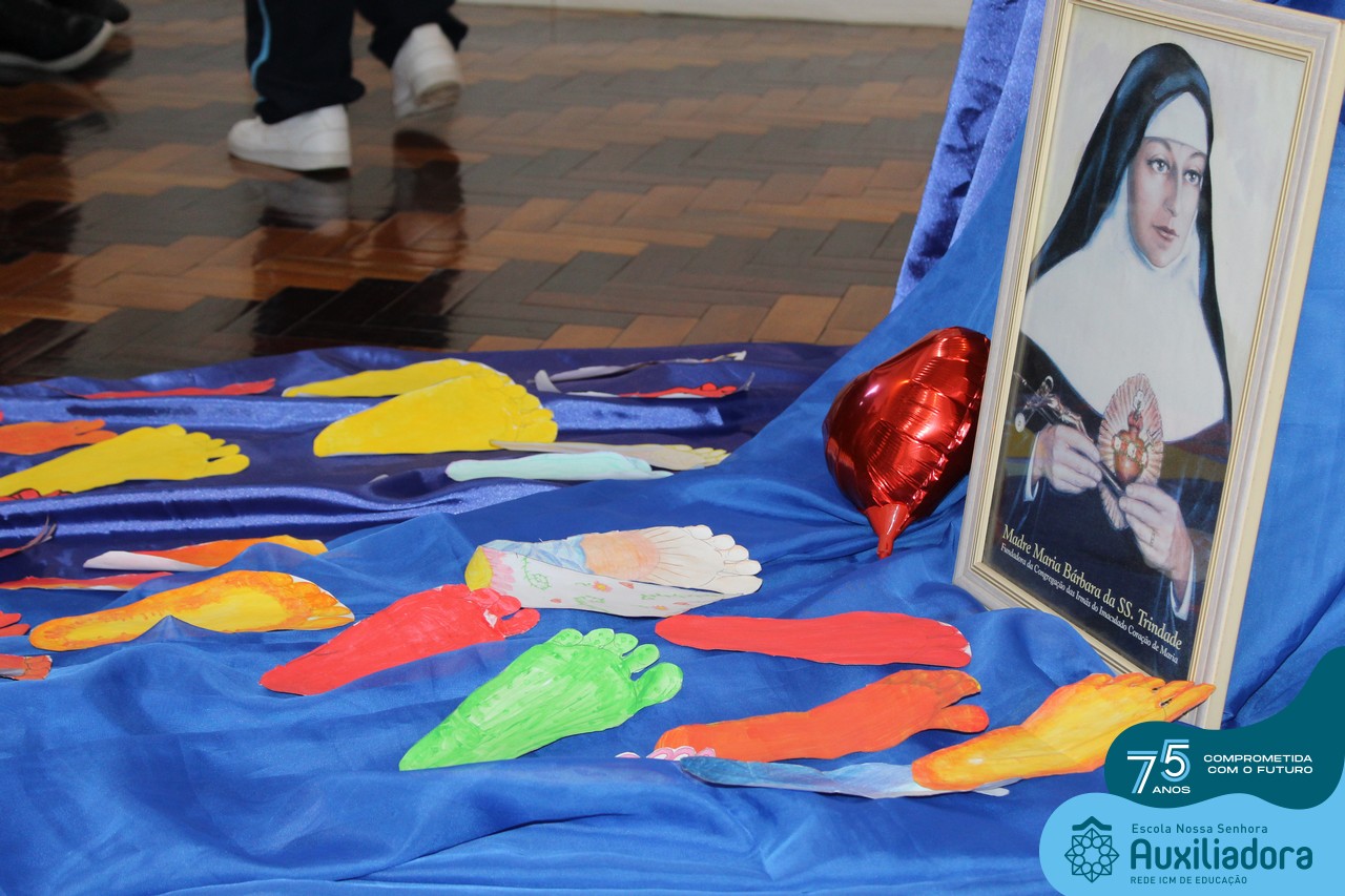 Em nossa Escola a celebração aconteceu no auditório da escola com a presença dos alunos e professores do turno da manhã e da tarde.  Nesta oportunidade, os símbolos do coração e das pegadas ajudaram a compreender melhor o convite de Jesus aos discípulos de Emaús (Lc24,13-36) para assumirem sua vocação de anunciar Cristo Ressuscitado.
