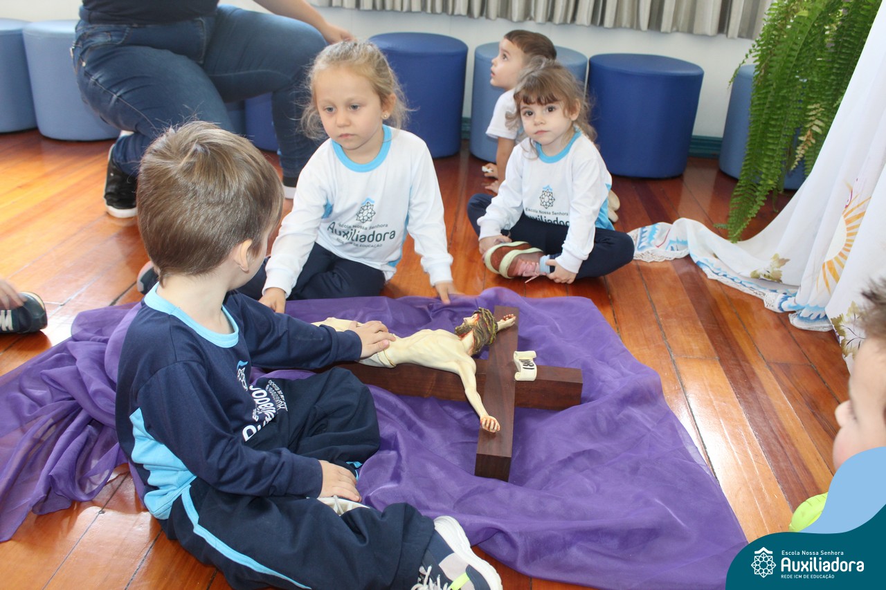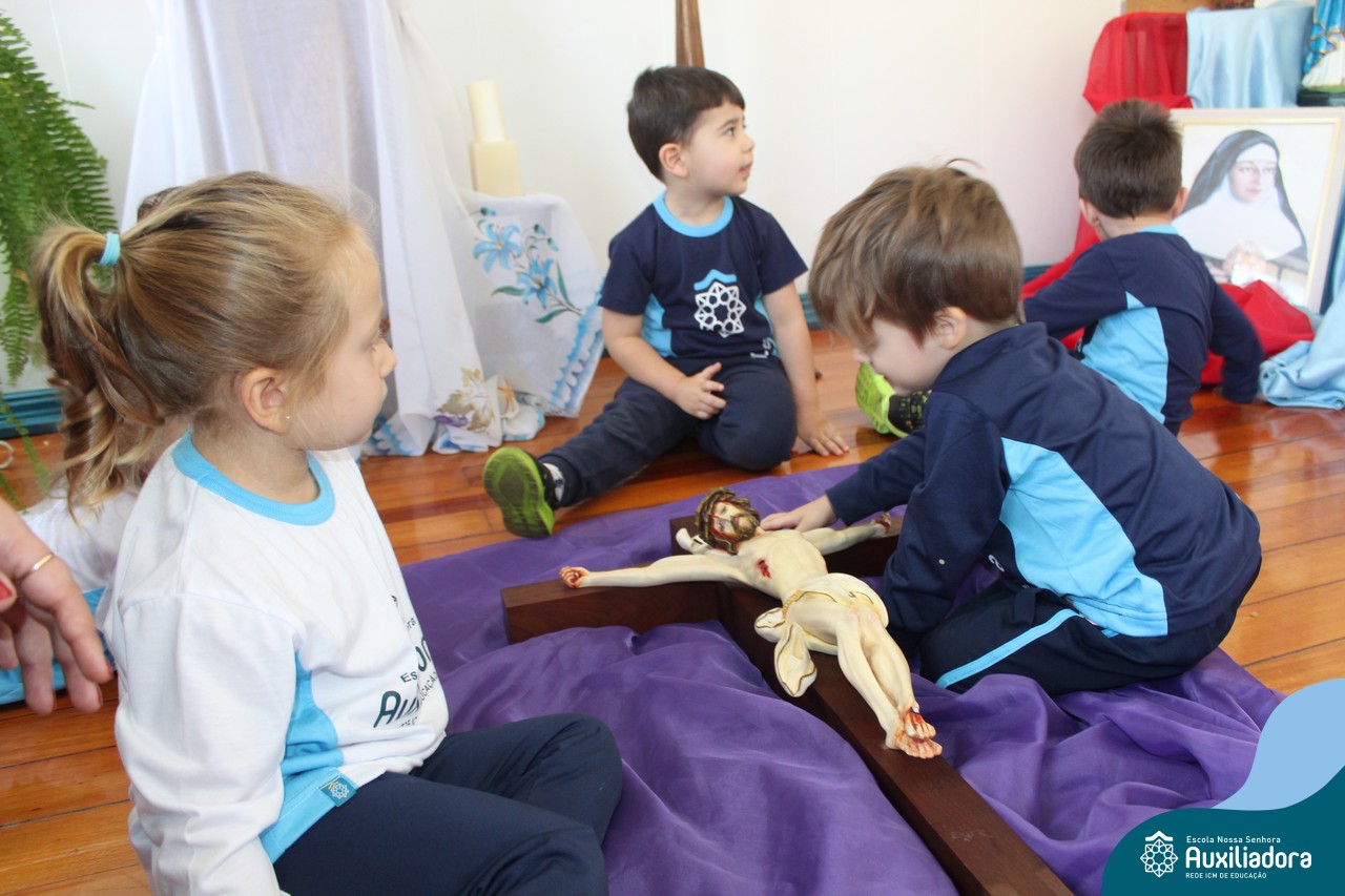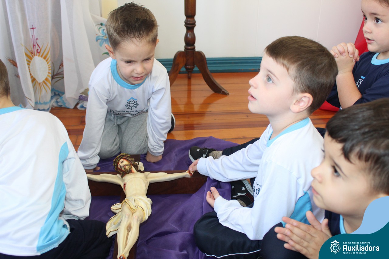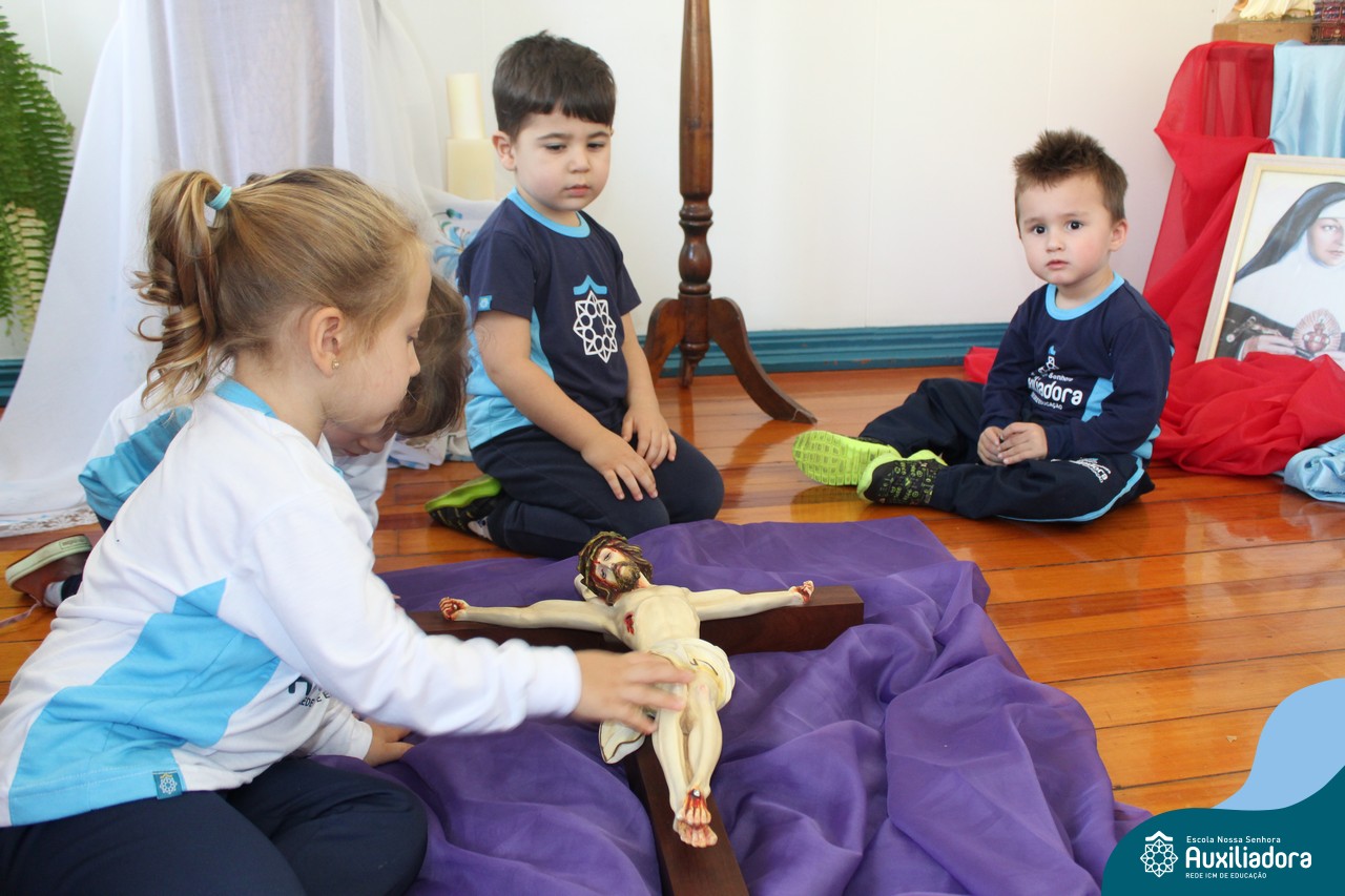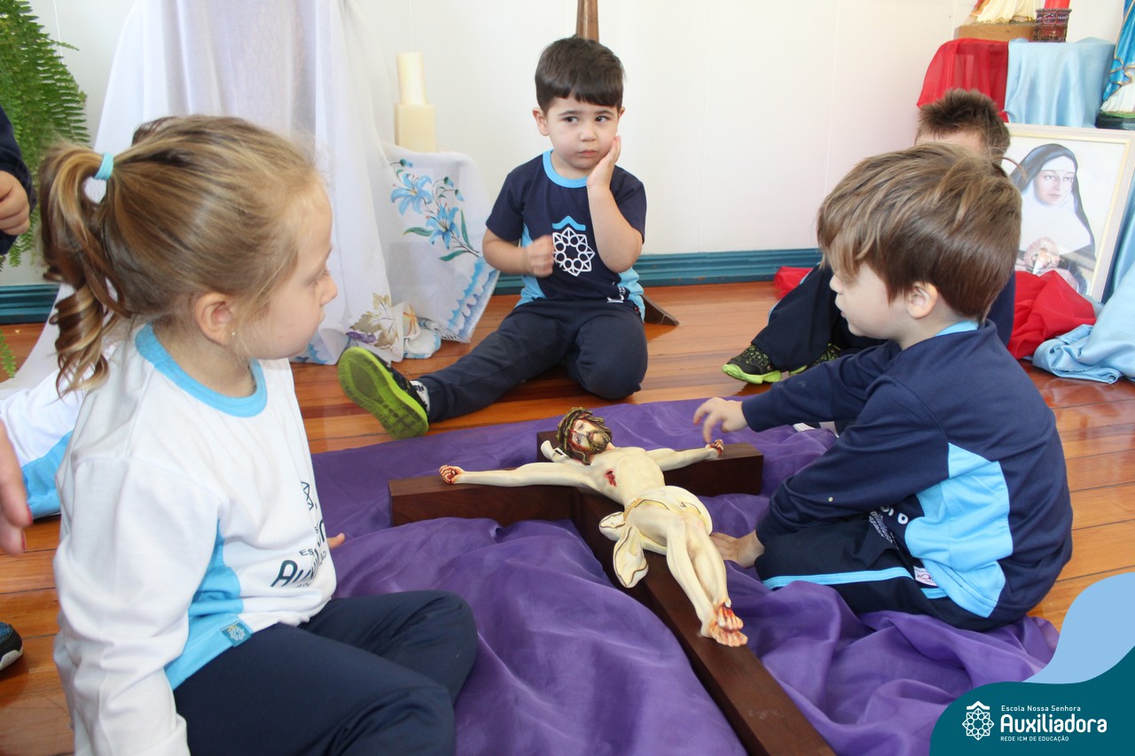 Celebrando o verdadeiro sentido da Páscoa. Muitas orações e reflexões na capela da escola.