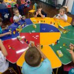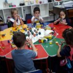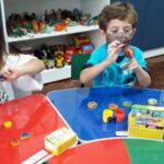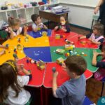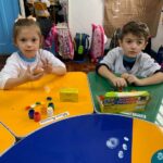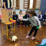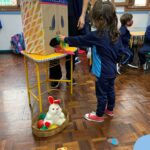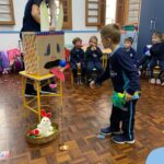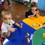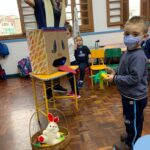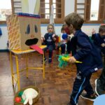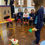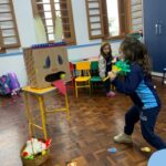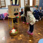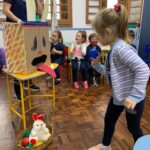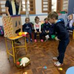 As crianças colocaram as mãos na tinta e ajudaram o coelhinho a pintar as casquinhas. Foi aquela diversão e encantamento com os resultados.