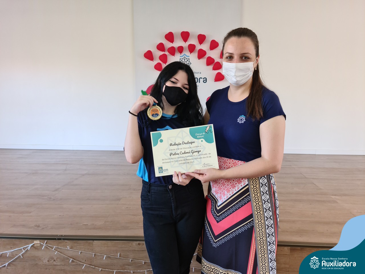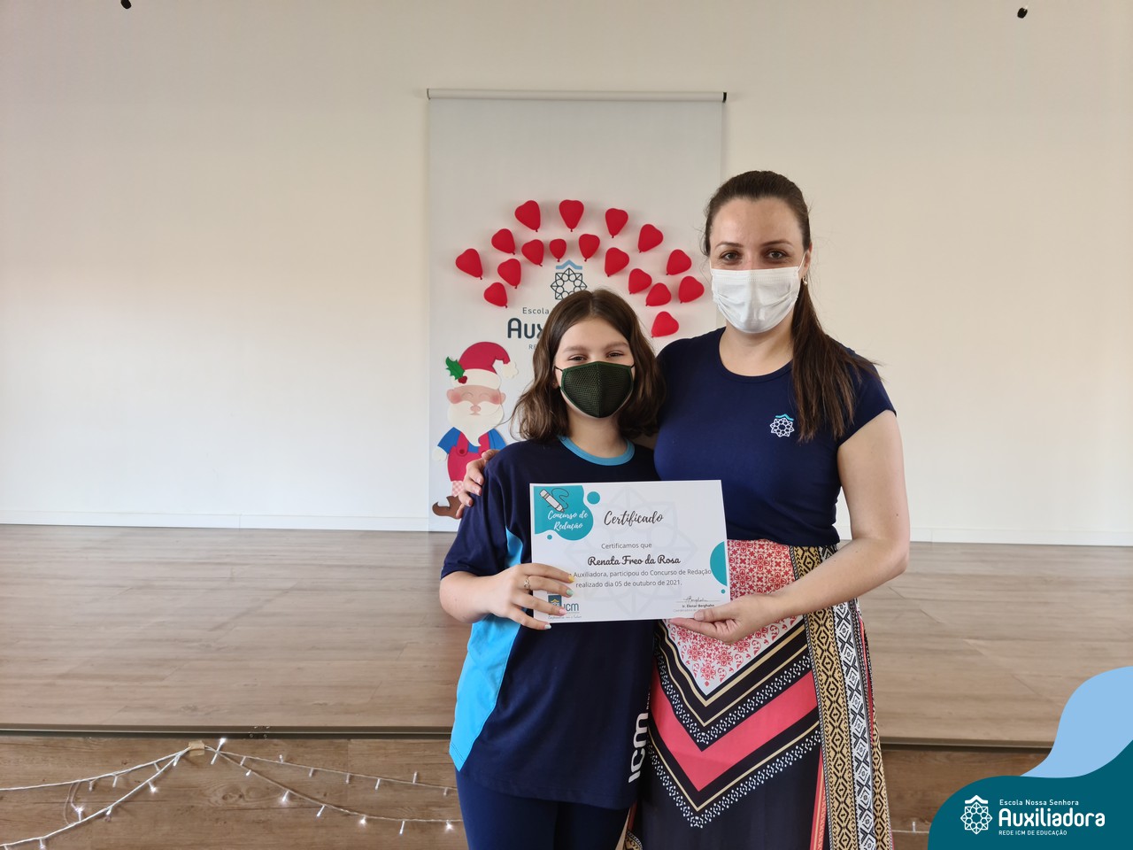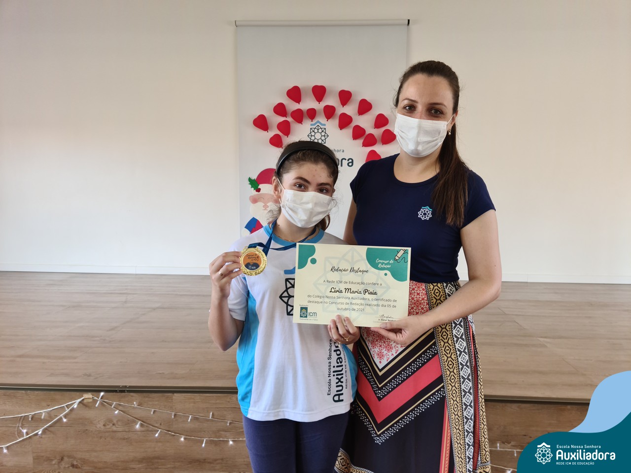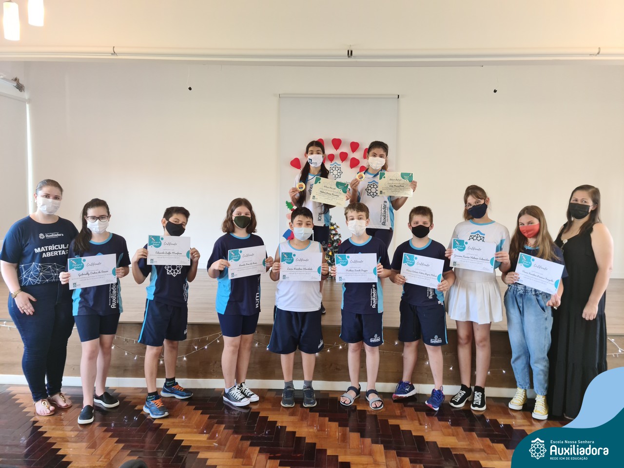 Nas turmas de 5º ano da Escola Nossa Senhora Auxiliadora, a aluna Lívia Maria Piaia recebeu medalha de destaque e a aluna Helena Bueno Navarini, recebeu nota mil dos professores avaliadores.