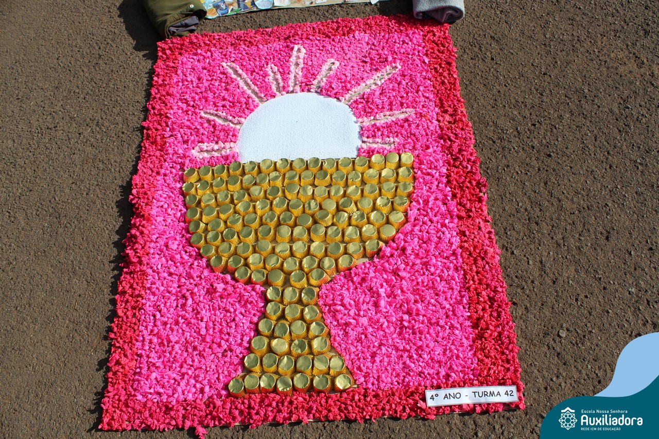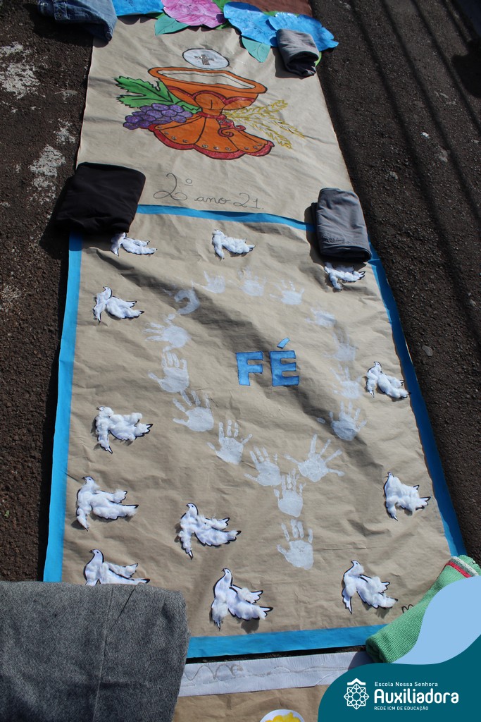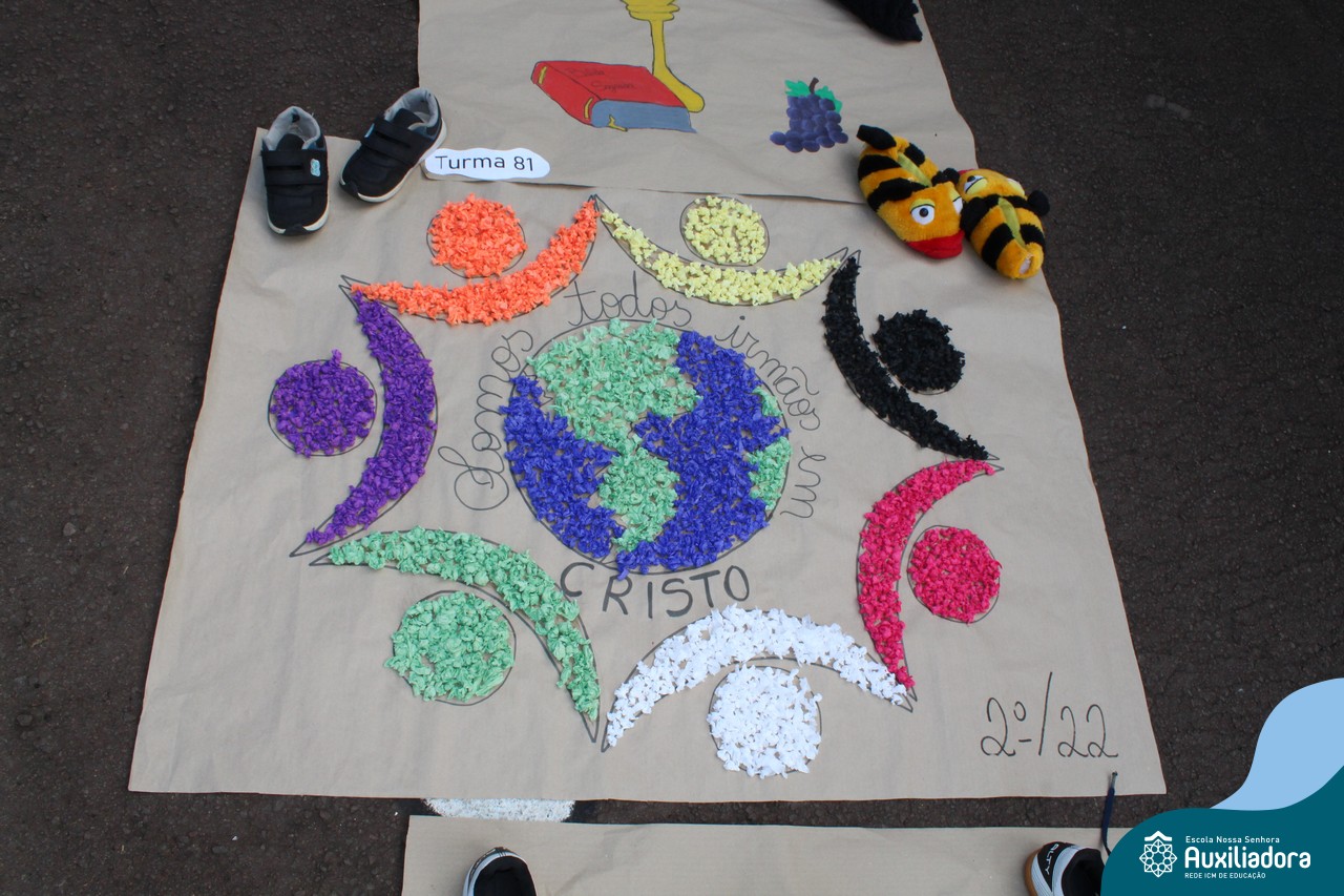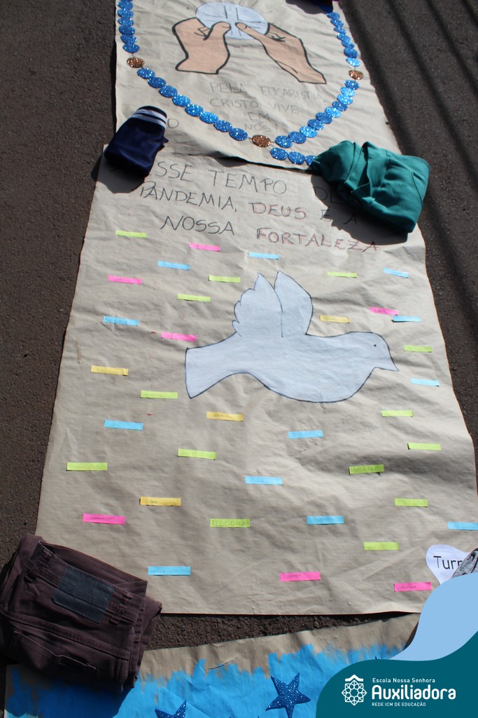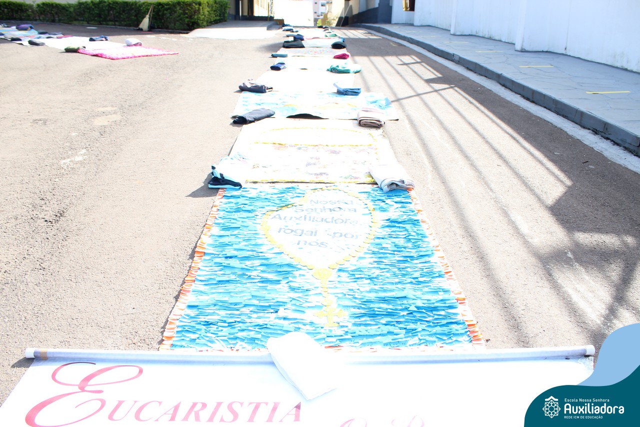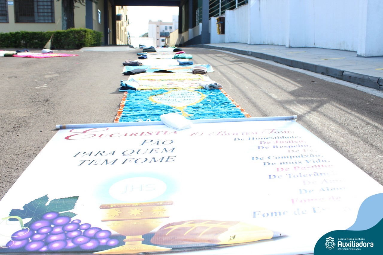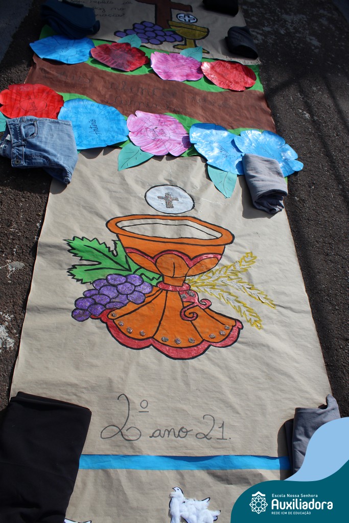 Com muita alegria e fé, os alunos das 25 turmas da Escola Nossa Senhora Auxiliadora, elaboraram os tradicionais tapetes da solidariedade celebrando o Dia de Corpus Christi vivenciando o Espírito de partilha lembrando que “A força da Eucaristia nos transforma em portadores de Deus”.