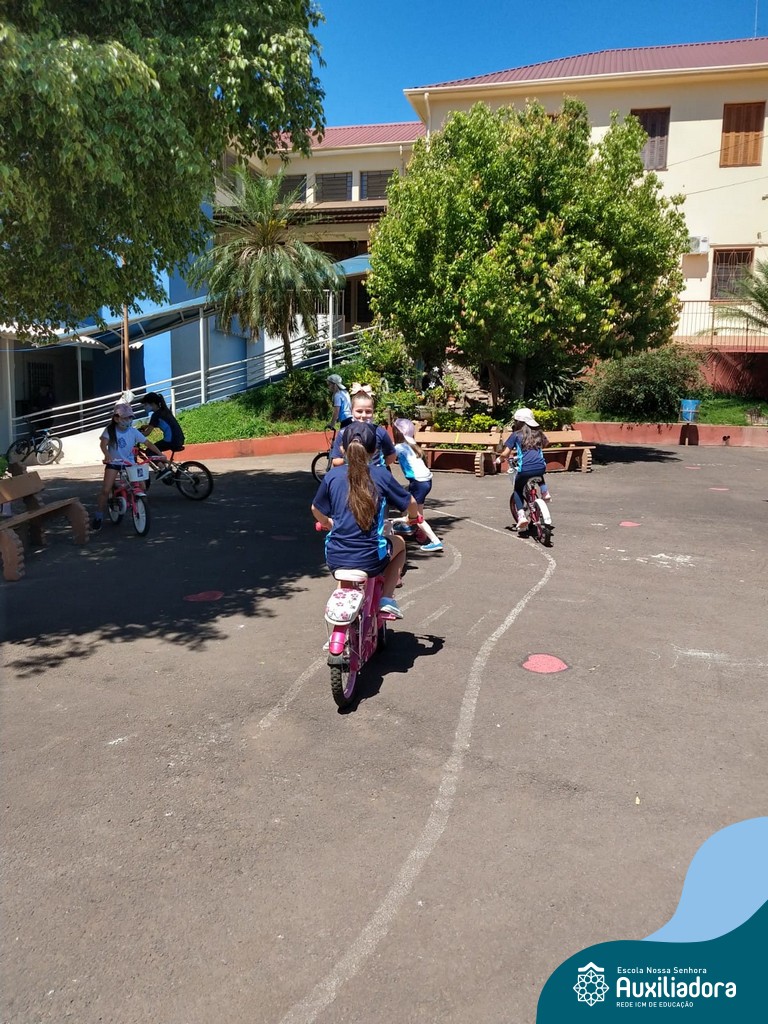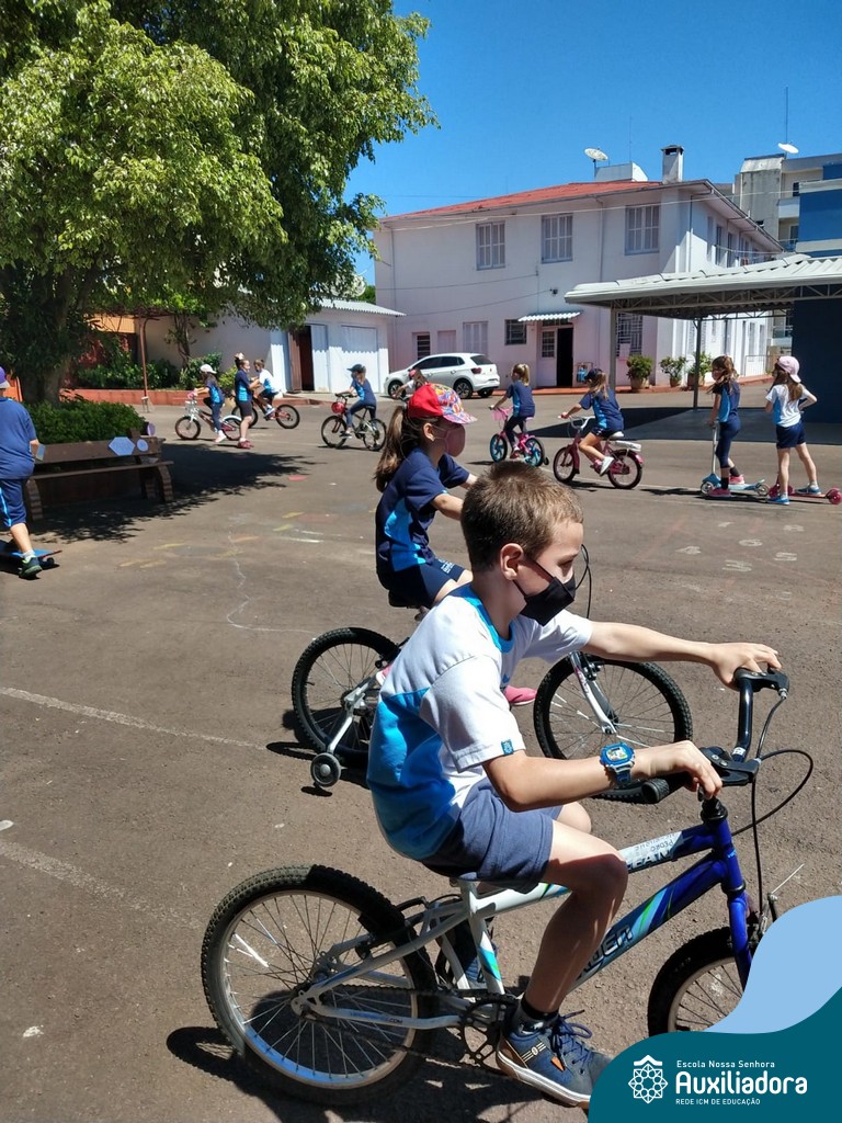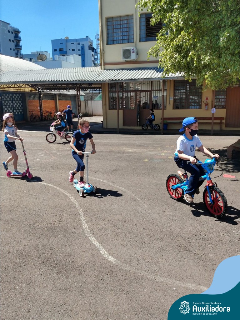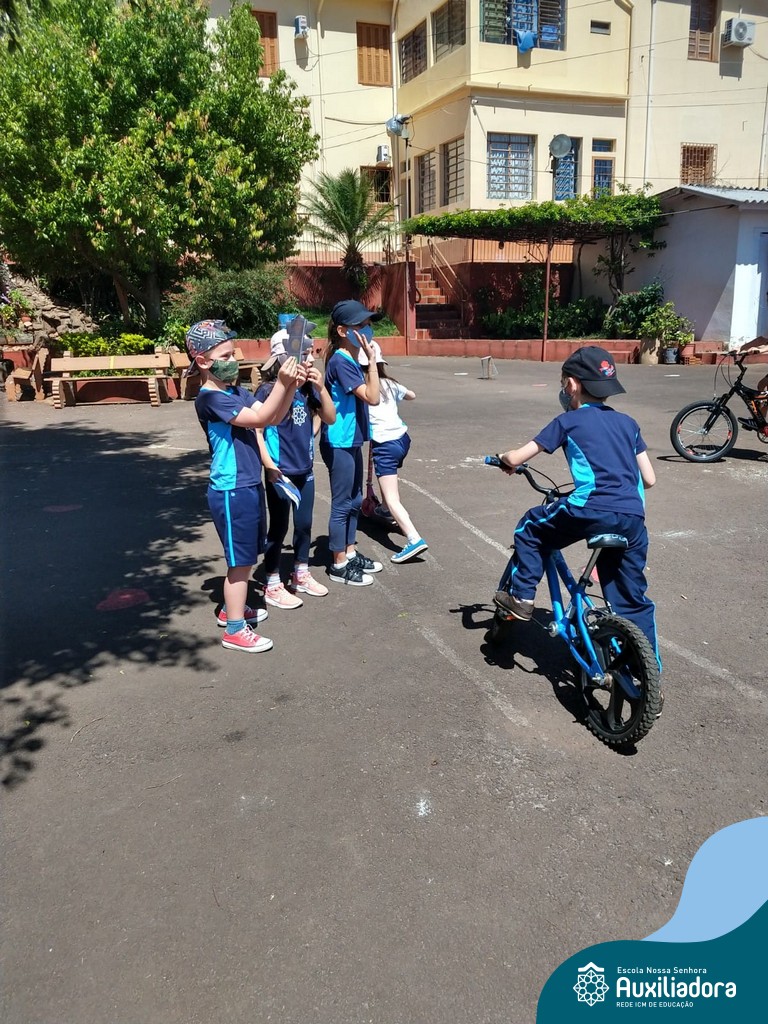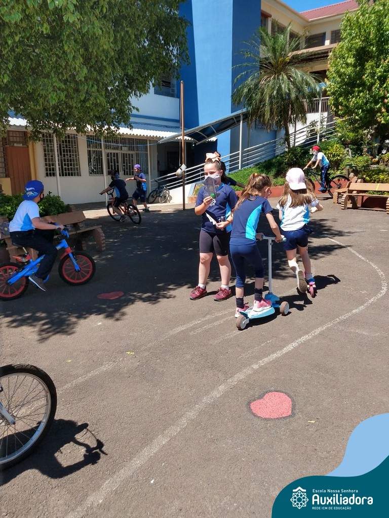 Finalizando os conhecimentos sobre a educação e o respeito no trânsito e o estudo dos meios de transporte, as turmas do 2° ano vivenciaram uma experiência em que puderam ser motoristas e pedestres, observando e respeitando as placas de trânsito, além de explorar o equilíbrio e motricidade ampla.