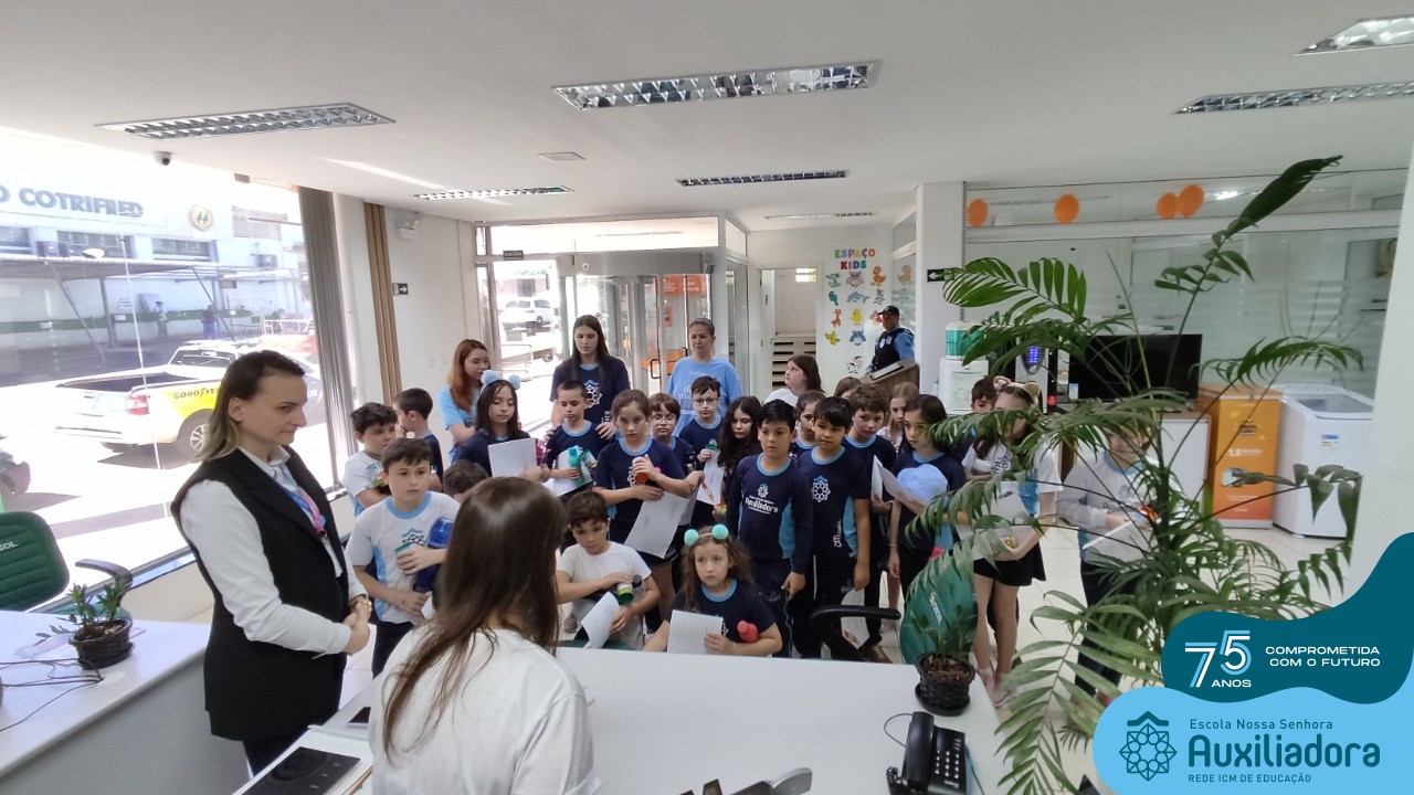 Depois de muito estudo as turmas foram até o banco conhecer o funcionando da agência e também receber os certificados de conclusão do projeto. Foi uma experiência muito significativa! 😊