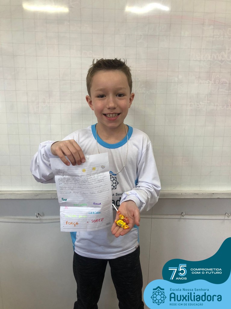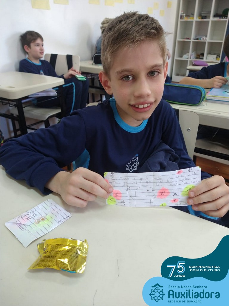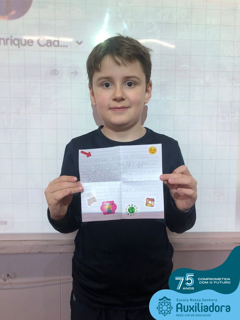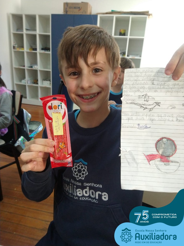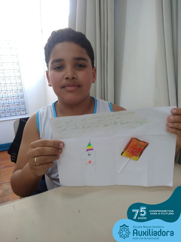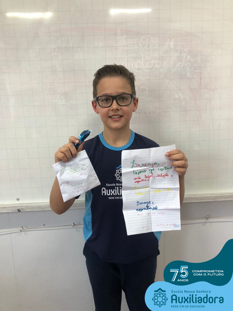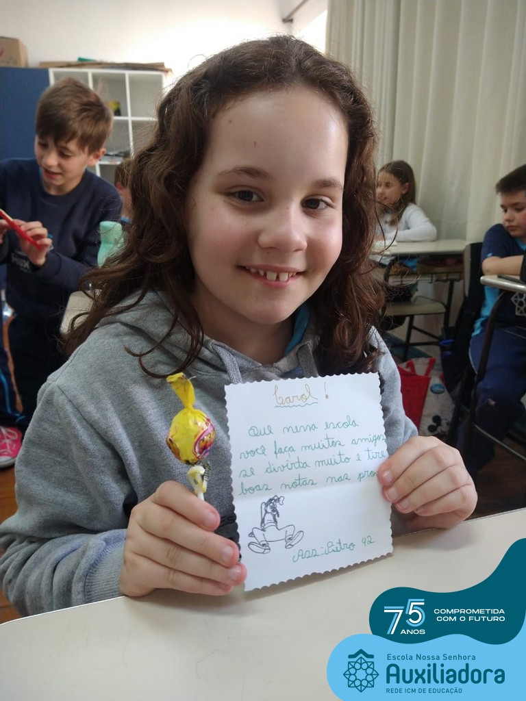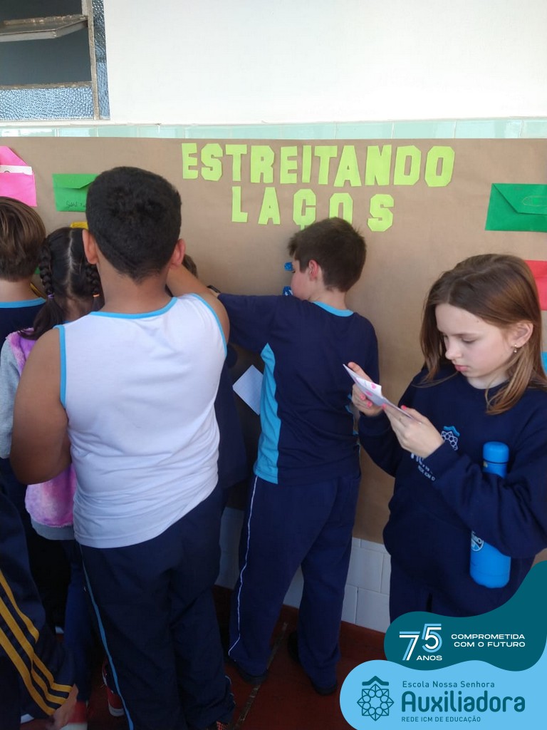 Na tarde desta terça-feira, 23, as turmas do 4º ano 41 e 42 concluíram a atividade “Escola Auxiliadora: Criando laços”. Os alunos receberam de seus amigos secretos em seus “correios”, uma cartinha com bons desejos para o ano letivo, estreitando laços de amizade e coleguismo entre as turmas.