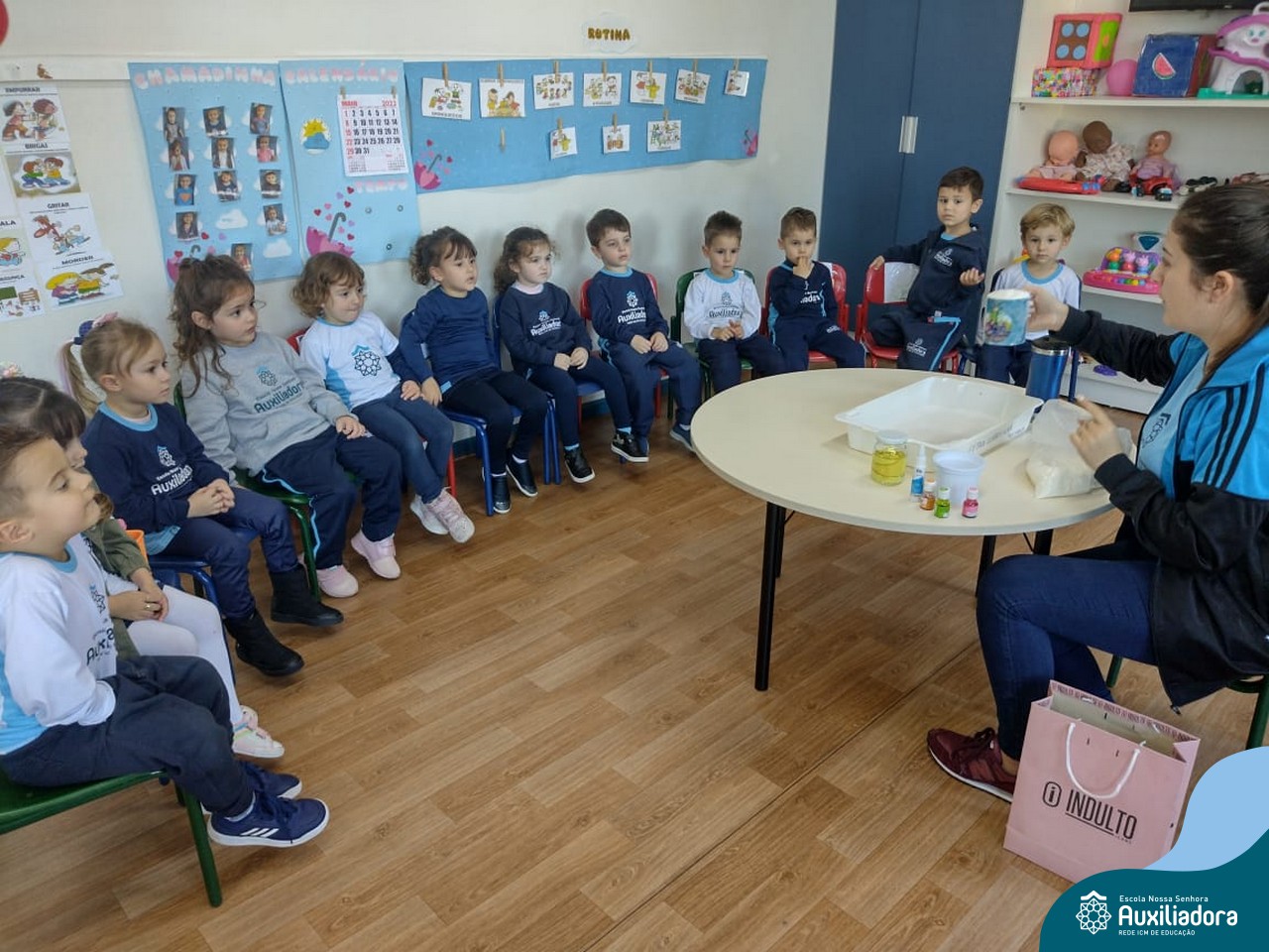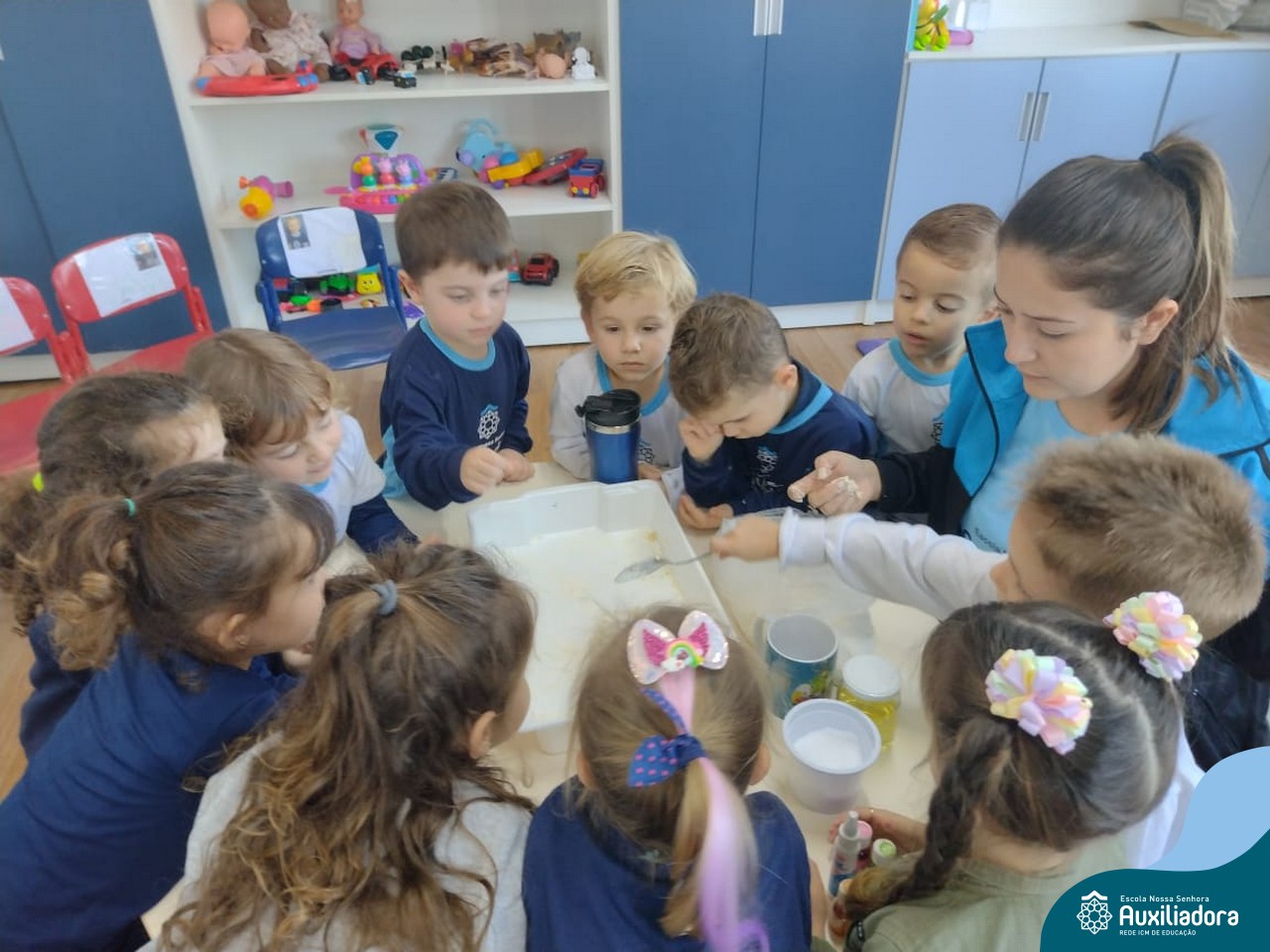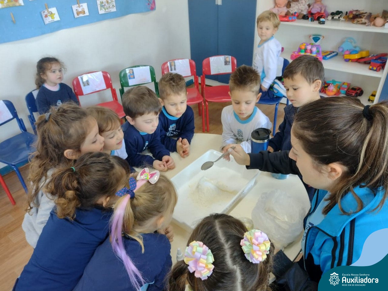 Durante as últimas semanas a galerinha do Maternal 2 A trabalhou sobre a importância dos cinco sentidos em nossa vida. Para explorar o sentido do Tato, produzimos em conjunto uma receita de massinha de modelar caseira. Além de enfatizar a textura, pudemos experimentar esta delícia!