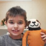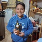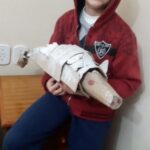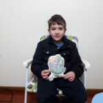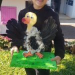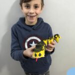 Fotos dos alunos com o animal em extinção pesquisado por cada um e construído com material alternativo: